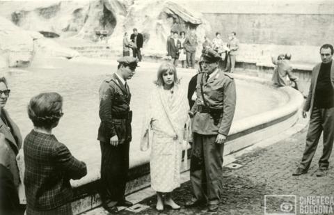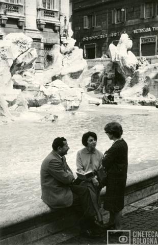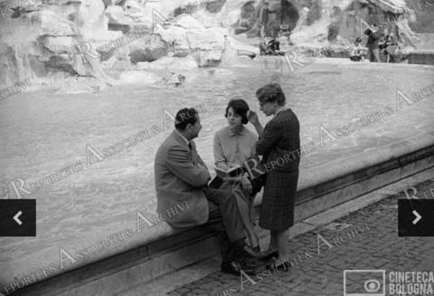 Roma. Mara Blasetti e altre due persone non identificate alla Fontana di Trevi durante le riprese di una scena del film Gidget Goes To Rome