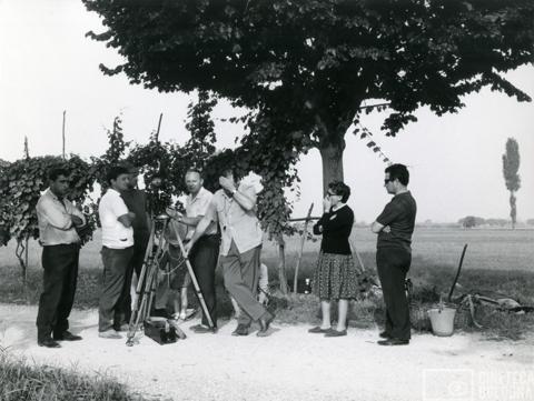 Parma. Mara Blasetti e altre persone non identificate della troupe durante le riprese di un cortometraggio pubblicitario per la Campbell
