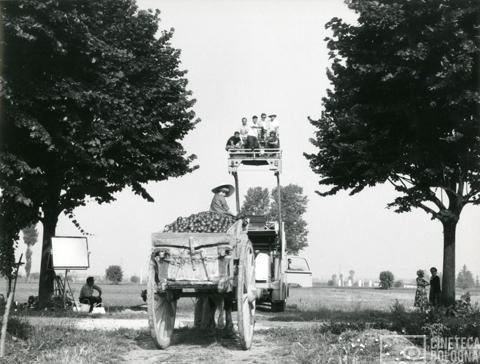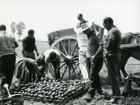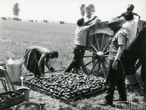 Parma. Mara Blasetti, Frank Worth e altre persone non identificate della troupe durante le riprese di un cortometraggio pubblicitario per la Campbell
