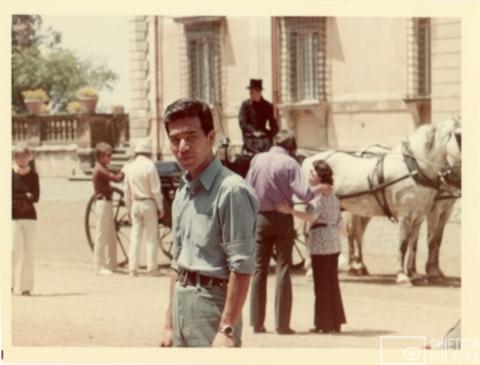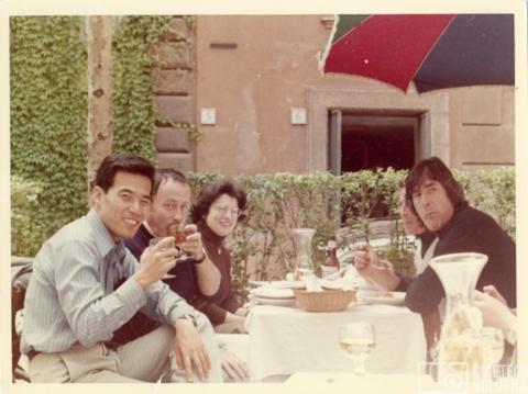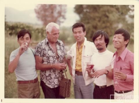 Fuji Iwasaki, Jimmy Iwasaki, Roberto De Rossi e altri due uomini non identificati durante le riprese del cortometraggio delle parrucche con Audrey Hepburn