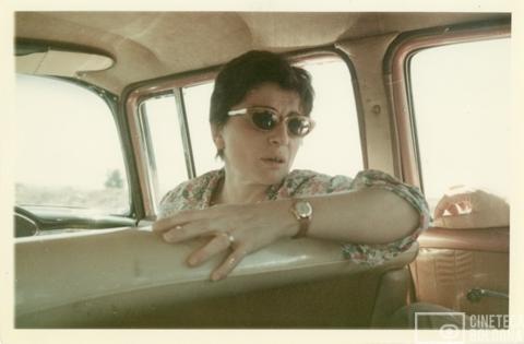 Mara Blasetti durante una pausa delle riprese dello short con Giuliano Gemma
