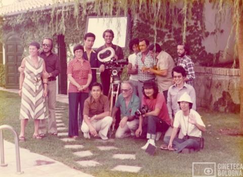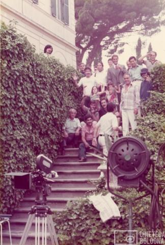 Roma. Mara Blasetti, Giuliano Gemma e la troupe cinematografica durante le riprese di uno short pubblicitario