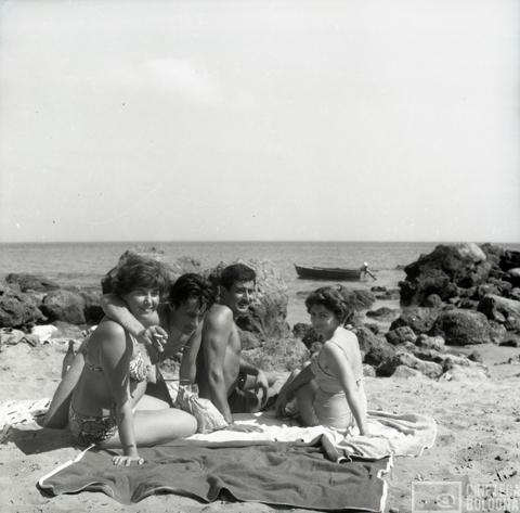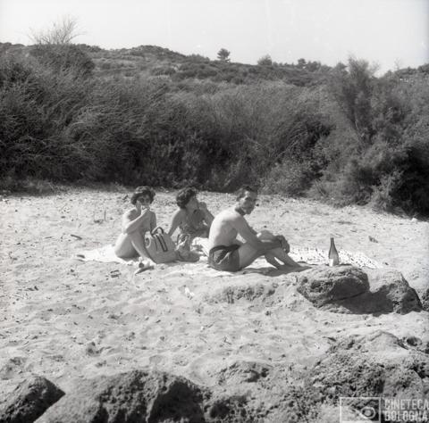 Punta Rossa. Mara Blasetti, Anna Gruber e due uomini non identificati durante le riprese del film Io amo, tu ami…