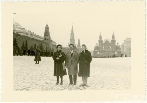 Mosca. Mara Blasetti e due persone non identificate presso la Piazza Rossa durante le riprese del film Io amo, tu ami…