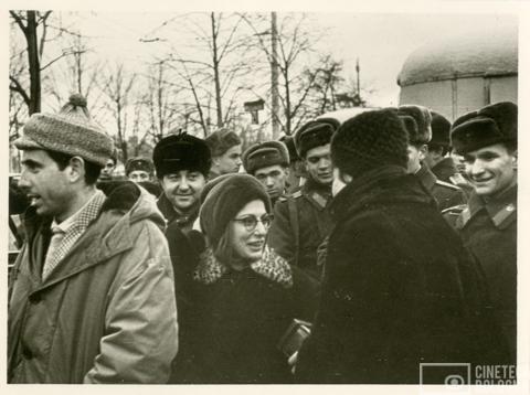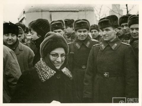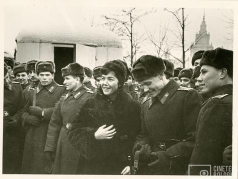 Mosca. Anna Gruber con i soldati dell’Armata sovietica durante le riprese del film Io amo, tu ami…