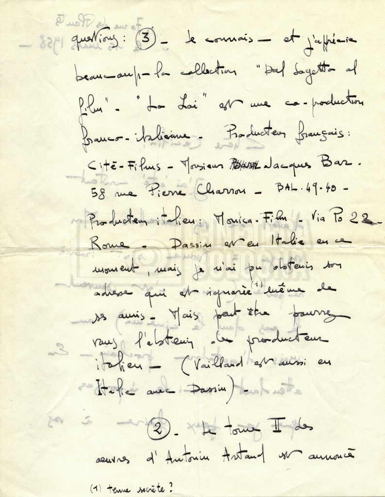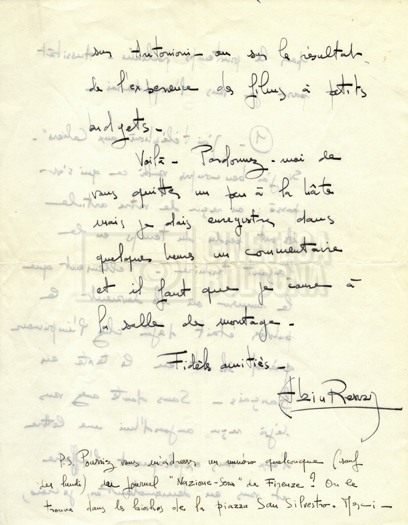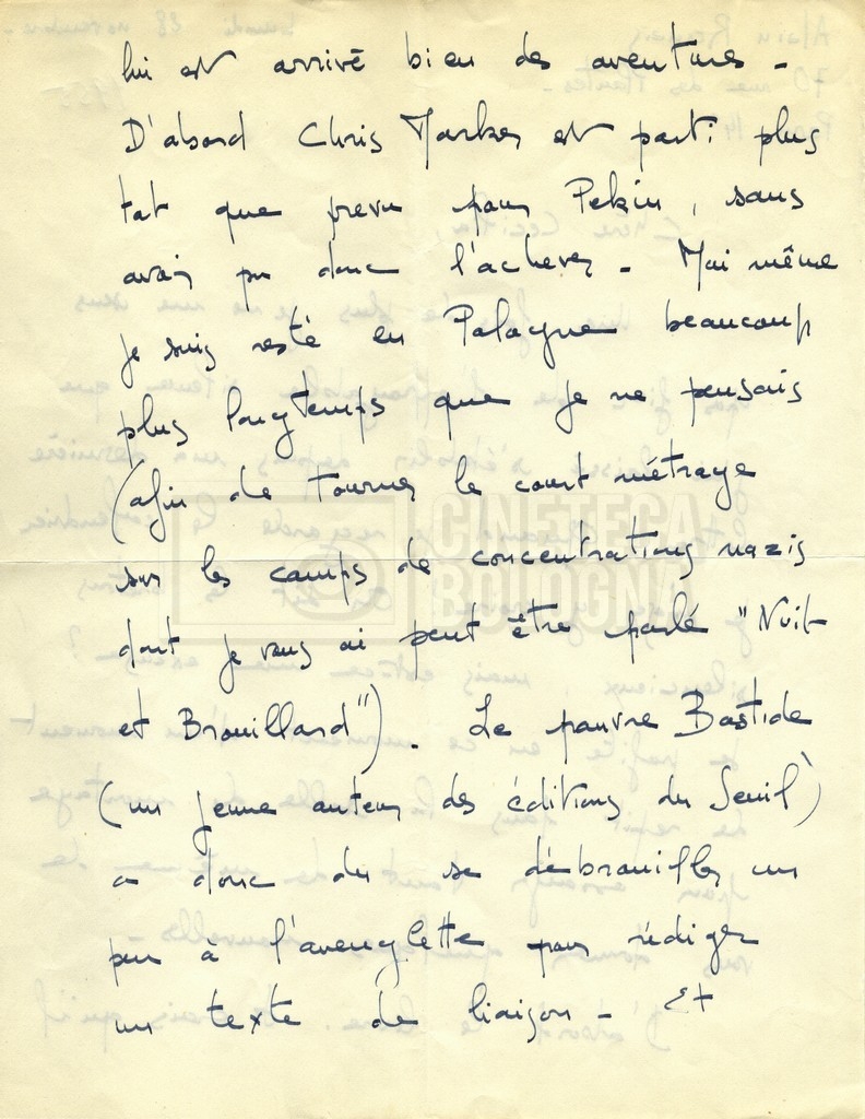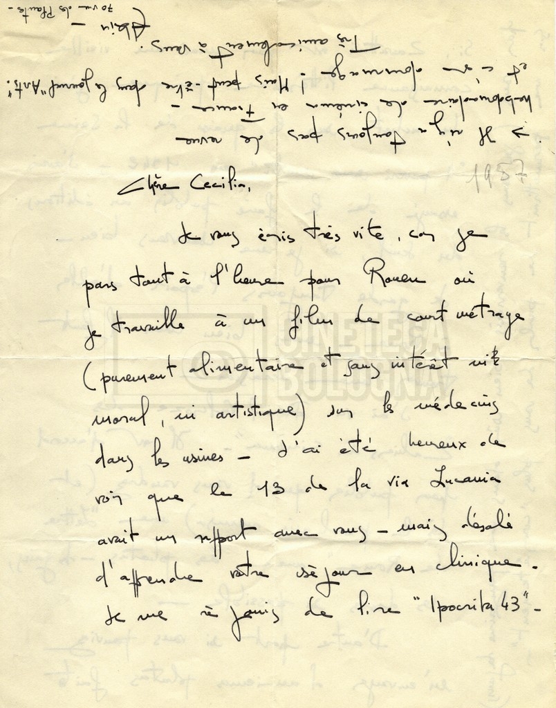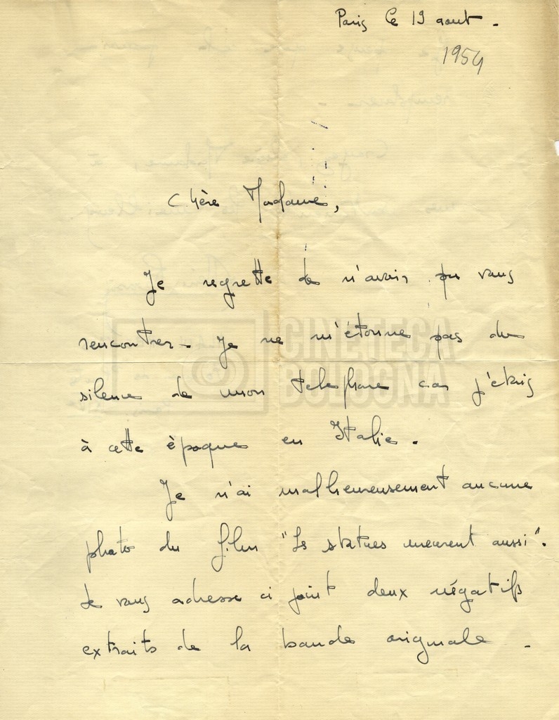 Torna alla banca dati Alain Resnais e René Clair Documento storico Fondo Cecilia Mangini – Lino Del Fra / “Corrispondenza” Ambiti e contenuto Contiene i s.fascc.:- Corrispondenza con Alain Resnais (1954-1958);- Una lettera sciolta di René Clair a Cecilia Mangini (s.d.). Informazioni archivistiche Cronologia: 19 agosto 1954 - 15 marzo 1958 Numero di ordinamento definitivo: 15.4 Numero di ordinamento provvisorio: 01.04 Descrizione fisica: fascicolo Immagini digitalizzate Documenti correlati Vai alla banca dati