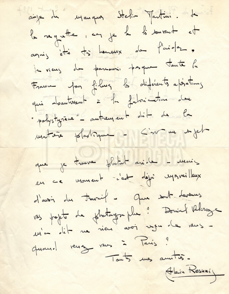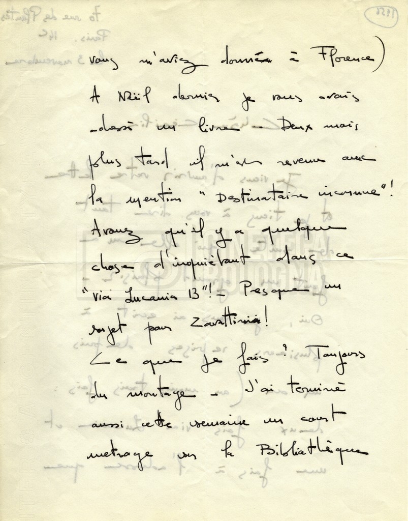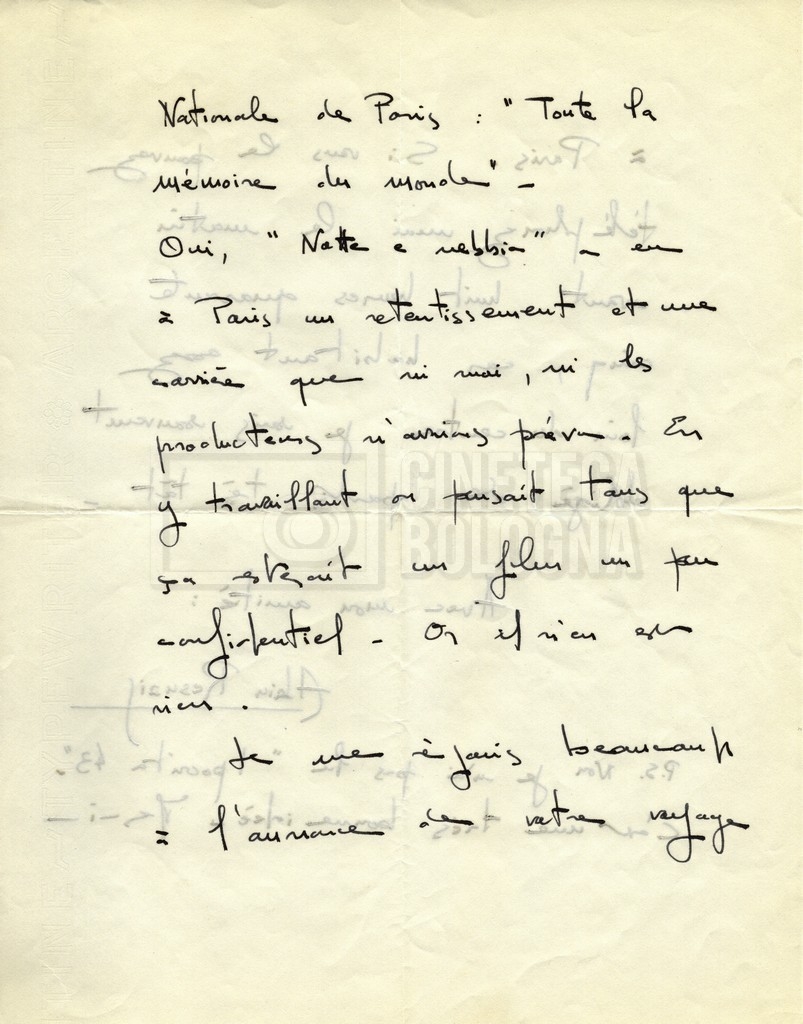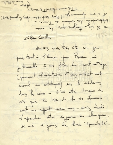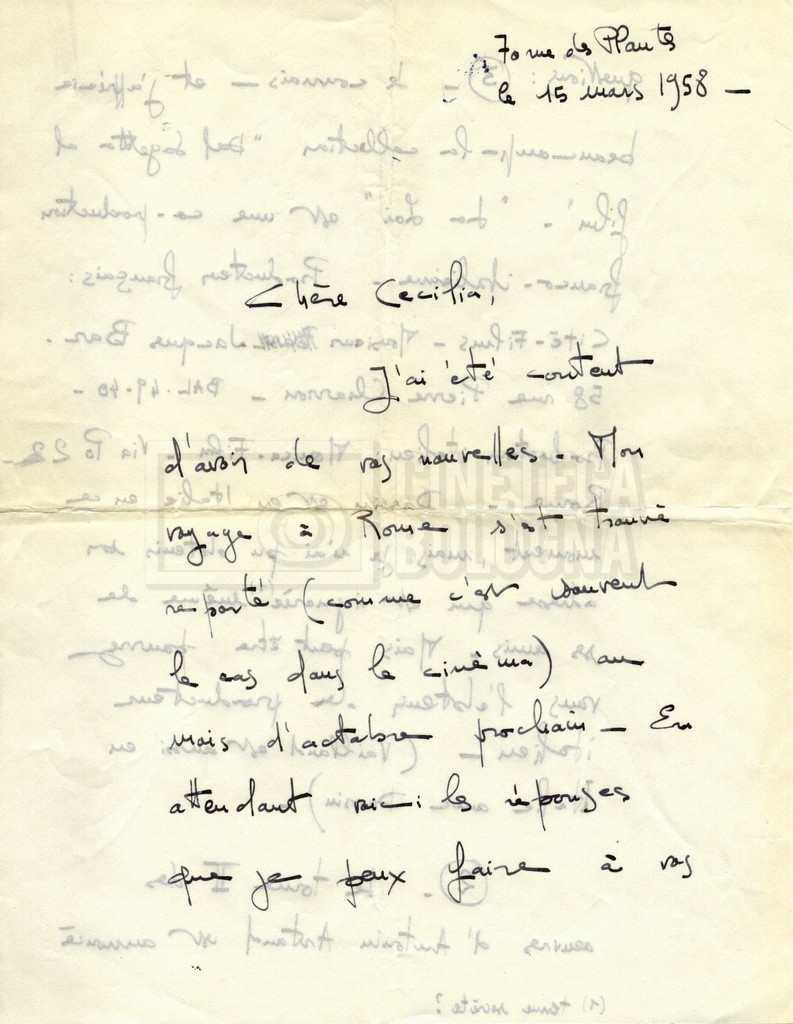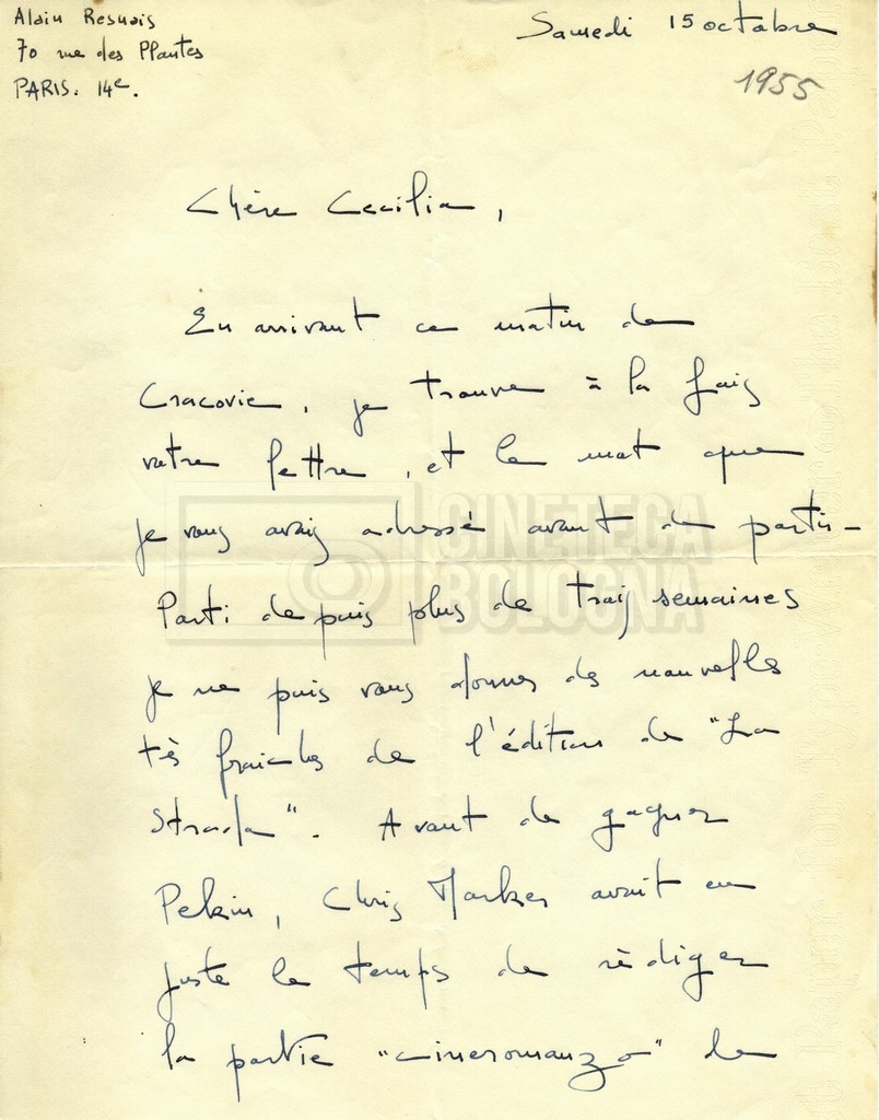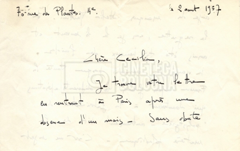 Torna alla banca dati Alain Resnais e René Clair Documento storico Fondo Cecilia Mangini – Lino Del Fra / “Corrispondenza” Ambiti e contenuto Contiene i s.fascc.:– Corrispondenza con Alain Resnais (1954-1958);– Una lettera sciolta di René Clair a Cecilia Mangini (s.d.). Informazioni archivistiche Cronologia: 19 agosto 1954 – 15 marzo 1958 Numero di ordinamento definitivo: 15.4 Numero di ordinamento provvisorio: 01.04 Descrizione fisica: fascicolo Immagini digitalizzate Documenti correlati Vai alla banca dati DOCUMENTO STORICO Partecipazione alla ‘Settimana internazionale del cinema’ di Mannheim DOCUMENTO STORICO Assegnazione del gran premio leone di San Marco a Fata Morgana DOCUMENTO STORICO “Renzi – Cappelli per ‘La legge’ di Dassin” DOCUMENTO STORICO Libero Solaroli DOCUMENTO STORICO Federazione italiana dei circoli del cinema (FICC) – Assemblea cineclub ‘Primi piani’ DOCUMENTO STORICO “Renzi – Aristarco. ‘L’armata Sagapò’; I consigli di mia madre” DOCUMENTO STORICO Cesare Zavattini DOCUMENTO STORICO “Wystan Hugh Auden. Mio articolo; corrispondenza; sua lettera autografa; ipotesi di traduzione” DOCUMENTO STORICO “Corrispondenza Festival del documentario di Lipsia” DOCUMENTO STORICO “Corrispondenza Di Lino Del Fra con Adelio Ferrero, Pio Baldelli, Paolo Gobetti, Paolo Grassi” DOCUMENTO STORICO Alessandro Pugno