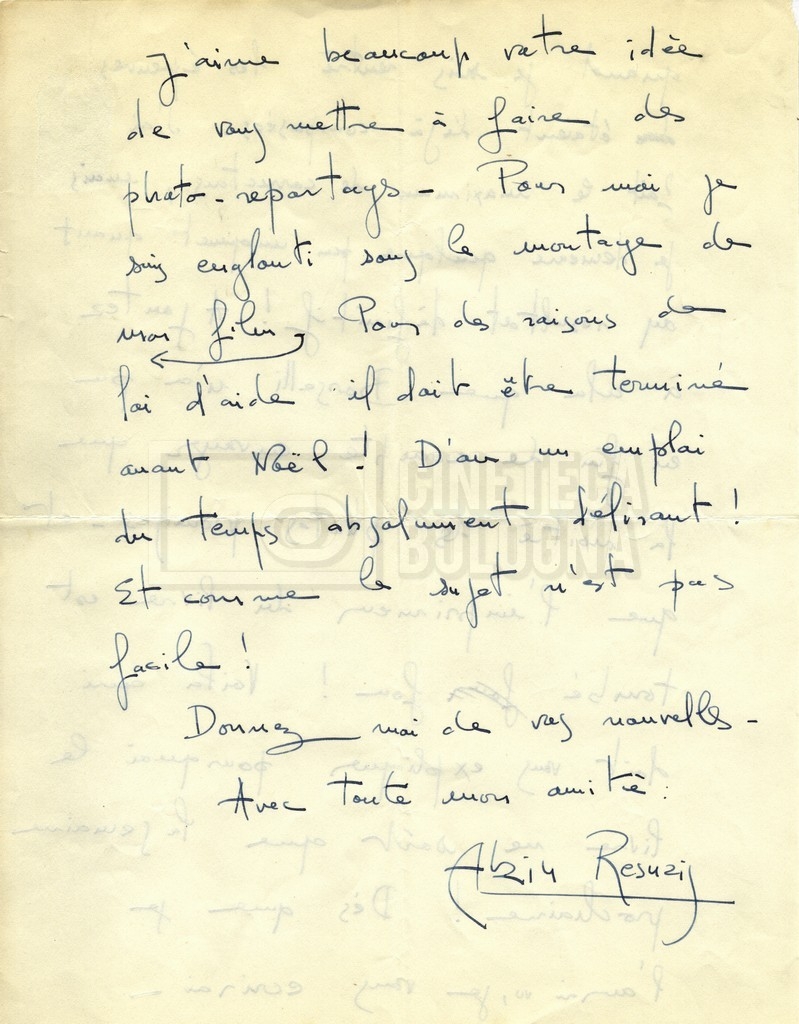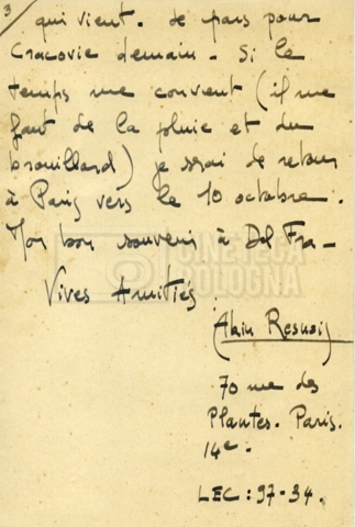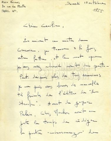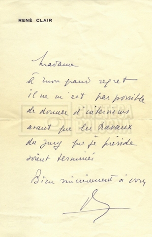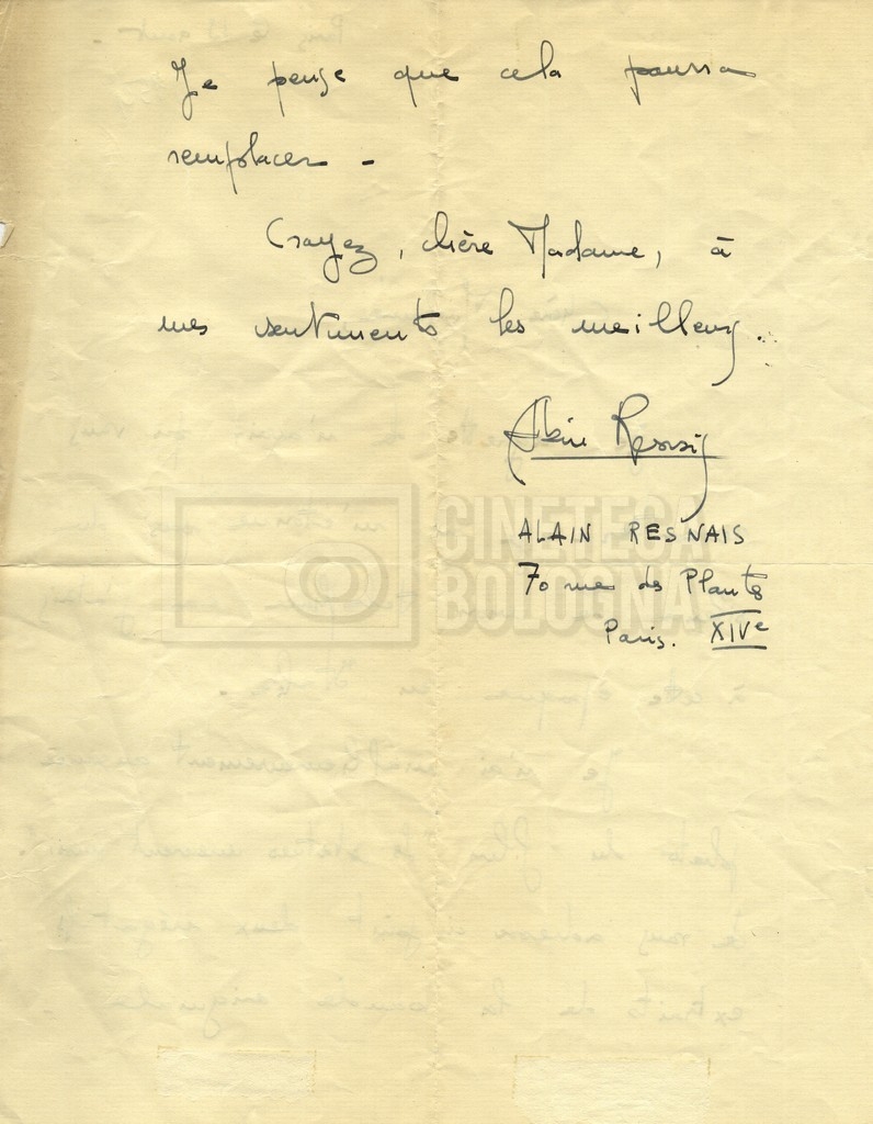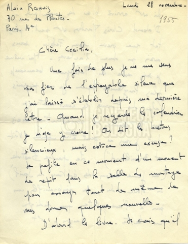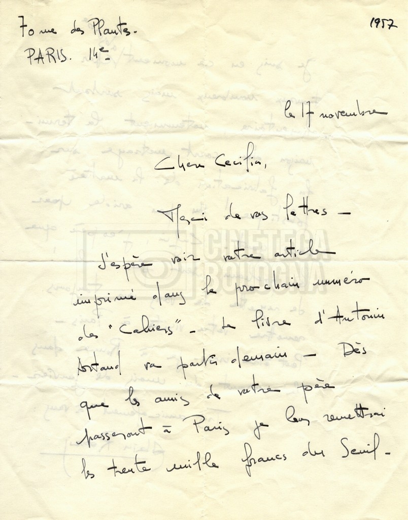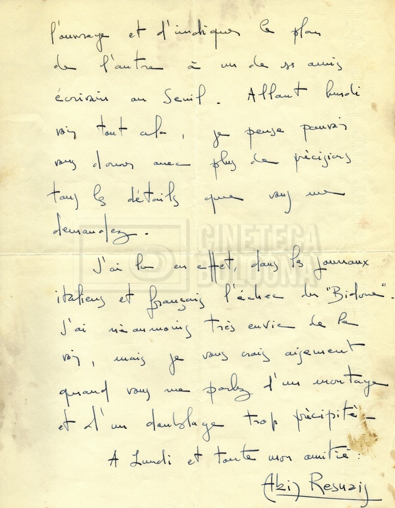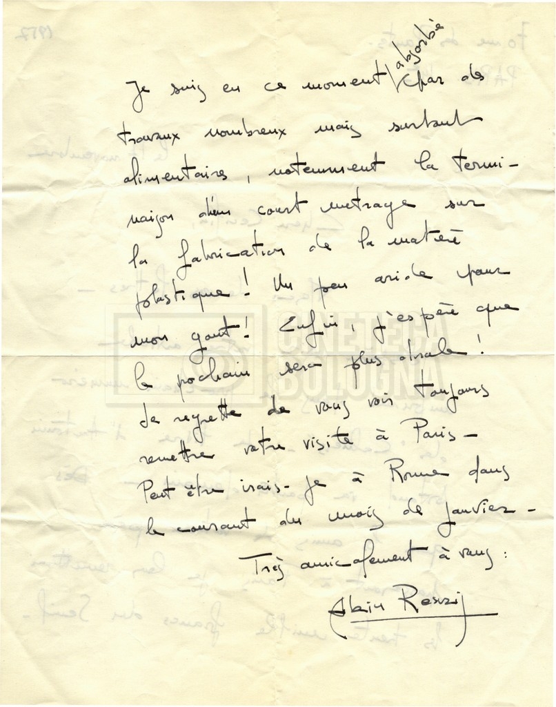 Torna alla banca dati Alain Resnais e René Clair Documento storico Fondo Cecilia Mangini – Lino Del Fra / “Corrispondenza” Ambiti e contenuto Contiene i s.fascc.:– Corrispondenza con Alain Resnais (1954-1958);– Una lettera sciolta di René Clair a Cecilia Mangini (s.d.). Informazioni archivistiche Cronologia: 19 agosto 1954 – 15 marzo 1958 Numero di ordinamento definitivo: 15.4 Numero di ordinamento provvisorio: 01.04 Descrizione fisica: fascicolo Immagini digitalizzate Documenti correlati Vai alla banca dati DOCUMENTO STORICO Partecipazione alla ‘Settimana internazionale del cinema’ di Mannheim DOCUMENTO STORICO Assegnazione del gran premio leone di San Marco a Fata Morgana DOCUMENTO STORICO “Renzi – Cappelli per ‘La legge’ di Dassin” DOCUMENTO STORICO Libero Solaroli DOCUMENTO STORICO Federazione italiana dei circoli del cinema (FICC) – Assemblea cineclub ‘Primi piani’ DOCUMENTO STORICO “Renzi – Aristarco. ‘L’armata Sagapò’; I consigli di mia madre” DOCUMENTO STORICO Cesare Zavattini DOCUMENTO STORICO “Wystan Hugh Auden. Mio articolo; corrispondenza; sua lettera autografa; ipotesi di traduzione” DOCUMENTO STORICO “Corrispondenza Festival del documentario di Lipsia” DOCUMENTO STORICO “Corrispondenza Di Lino Del Fra con Adelio Ferrero, Pio Baldelli, Paolo Gobetti, Paolo Grassi” DOCUMENTO STORICO Alessandro Pugno