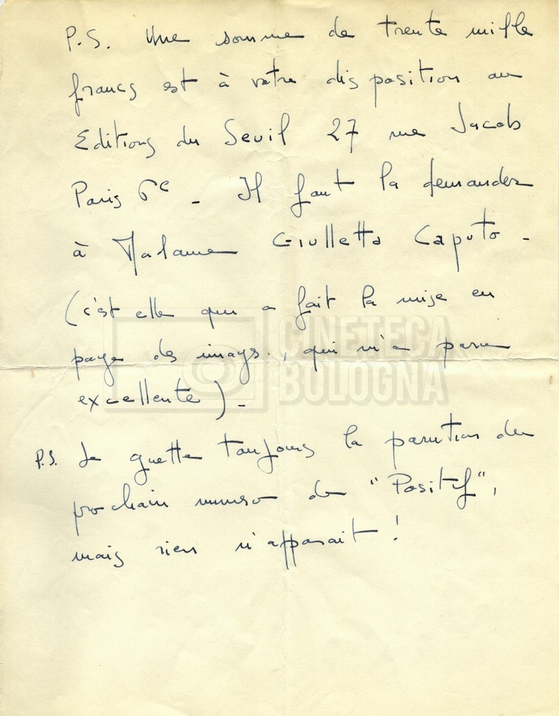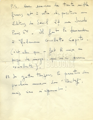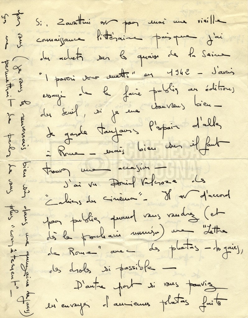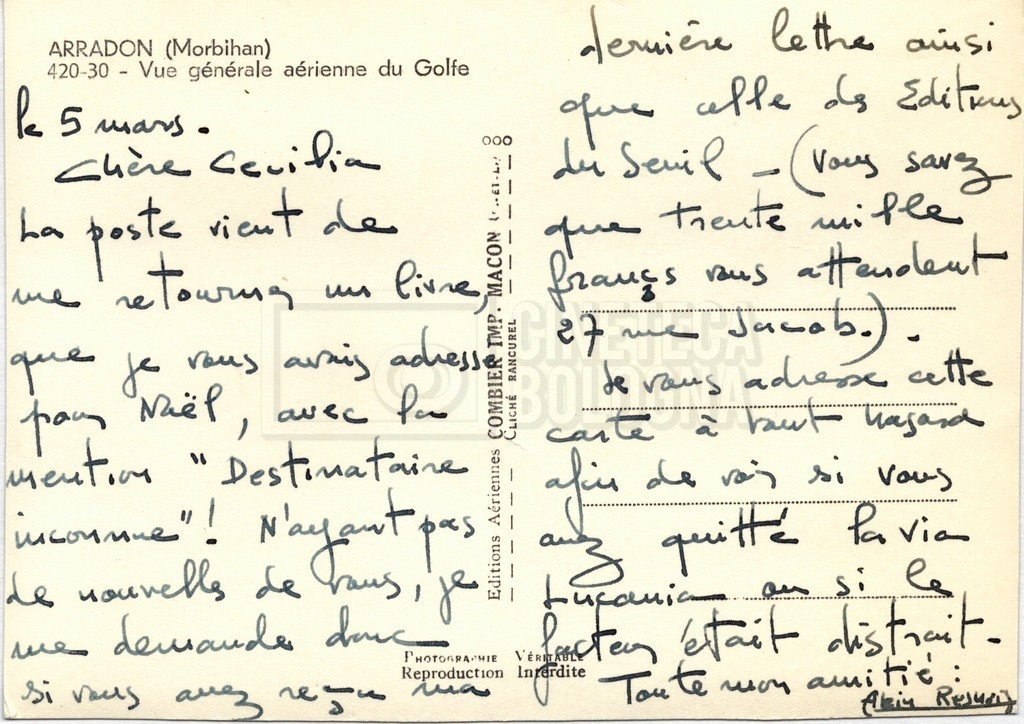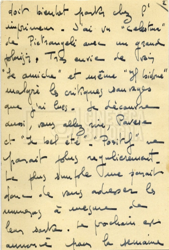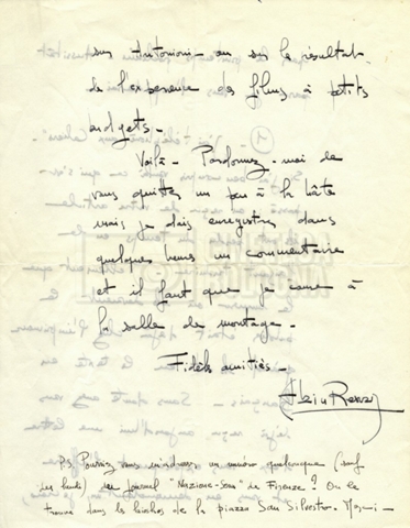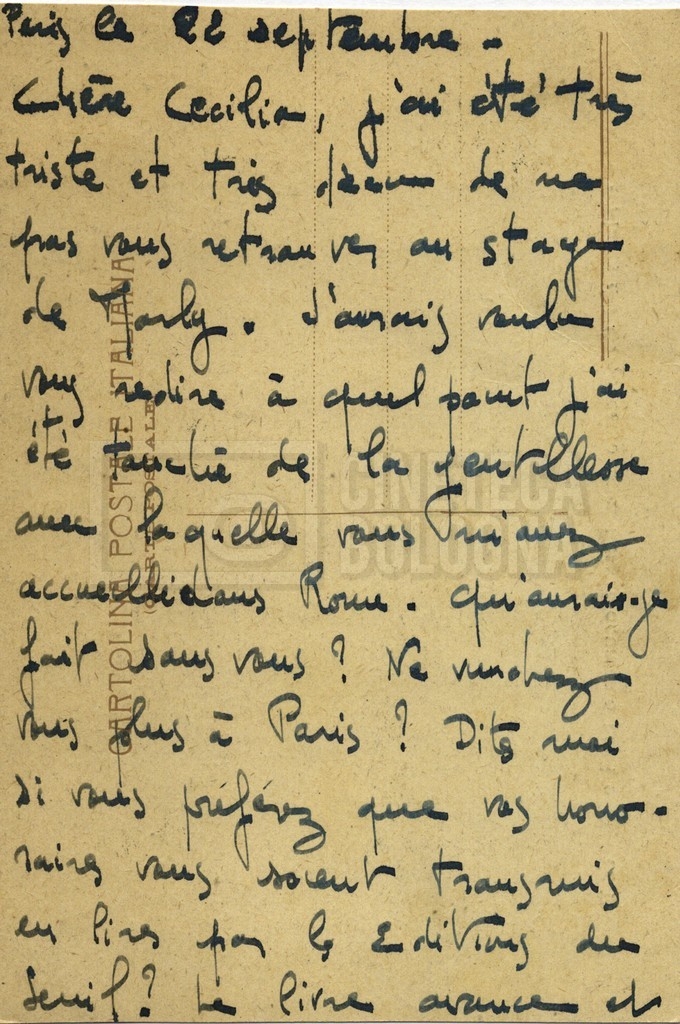 Torna alla banca dati Alain Resnais e René Clair Documento storico Fondo Cecilia Mangini – Lino Del Fra / “Corrispondenza” Ambiti e contenuto Contiene i s.fascc.:– Corrispondenza con Alain Resnais (1954-1958);– Una lettera sciolta di René Clair a Cecilia Mangini (s.d.). Informazioni archivistiche Cronologia: 19 agosto 1954 – 15 marzo 1958 Numero di ordinamento definitivo: 15.4 Numero di ordinamento provvisorio: 01.04 Descrizione fisica: fascicolo Immagini digitalizzate Documenti correlati Vai alla banca dati DOCUMENTO STORICO Partecipazione alla ‘Settimana internazionale del cinema’ di Mannheim DOCUMENTO STORICO Assegnazione del gran premio leone di San Marco a Fata Morgana DOCUMENTO STORICO “Renzi – Cappelli per ‘La legge’ di Dassin” DOCUMENTO STORICO Libero Solaroli DOCUMENTO STORICO Federazione italiana dei circoli del cinema (FICC) – Assemblea cineclub ‘Primi piani’ DOCUMENTO STORICO “Renzi – Aristarco. ‘L’armata Sagapò’; I consigli di mia madre” DOCUMENTO STORICO Cesare Zavattini DOCUMENTO STORICO “Wystan Hugh Auden. Mio articolo; corrispondenza; sua lettera autografa; ipotesi di traduzione” DOCUMENTO STORICO “Corrispondenza Festival del documentario di Lipsia” DOCUMENTO STORICO “Corrispondenza Di Lino Del Fra con Adelio Ferrero, Pio Baldelli, Paolo Gobetti, Paolo Grassi” DOCUMENTO STORICO Alessandro Pugno