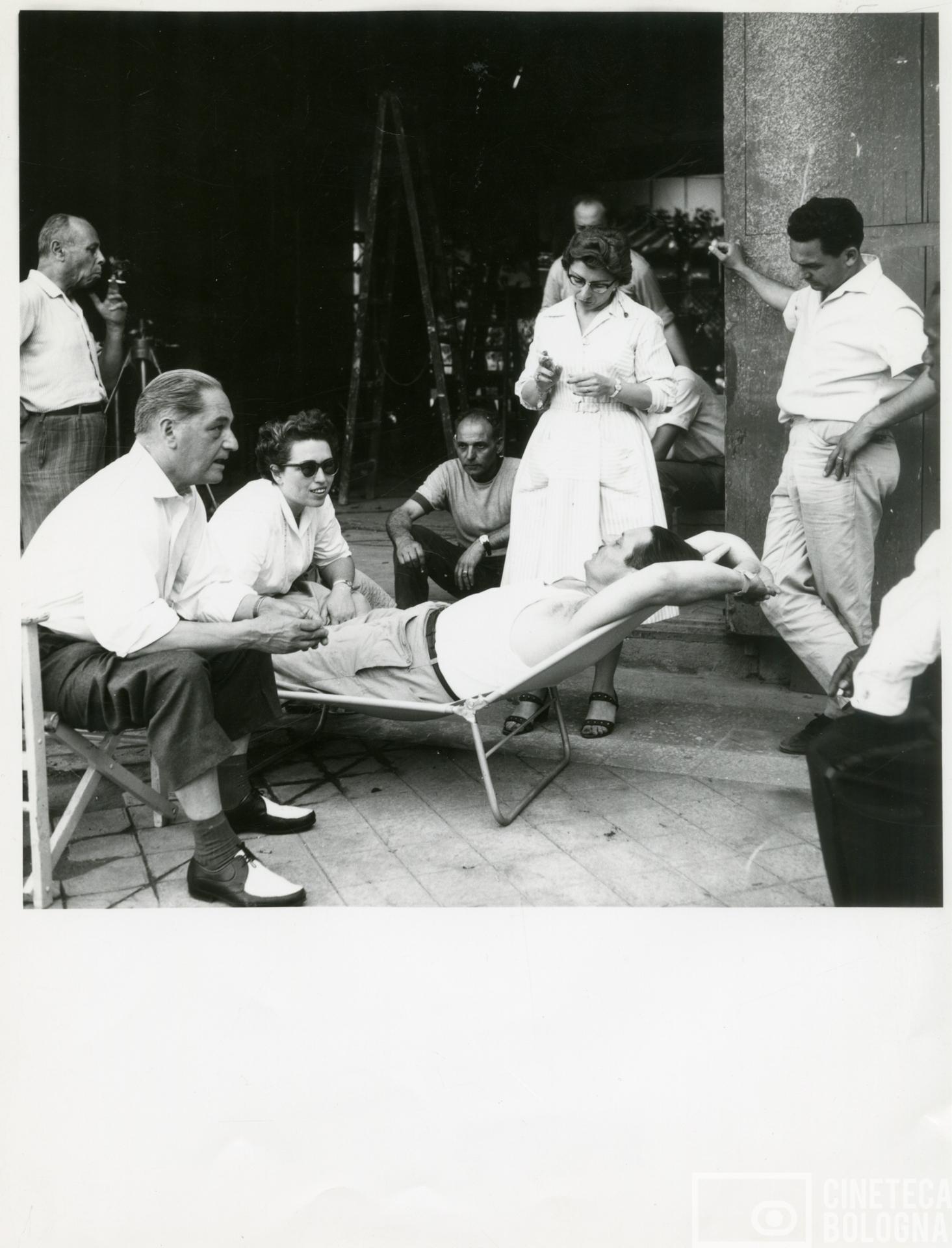 Alessandro Blasetti, Isa Bartalini e Mara Blasetti con la troupe sul set del film Europa di notte