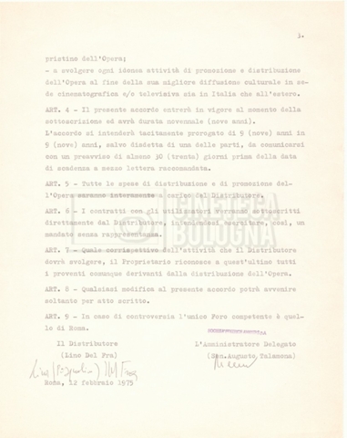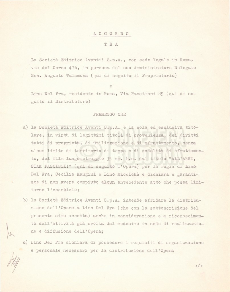 – Diverse copie dell’accordo tra la società ‘Avanti!’ e Lino del Fra per la distribuzione del documentario (12 febbraio 1975);