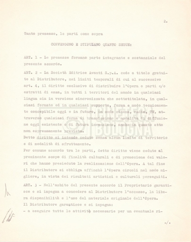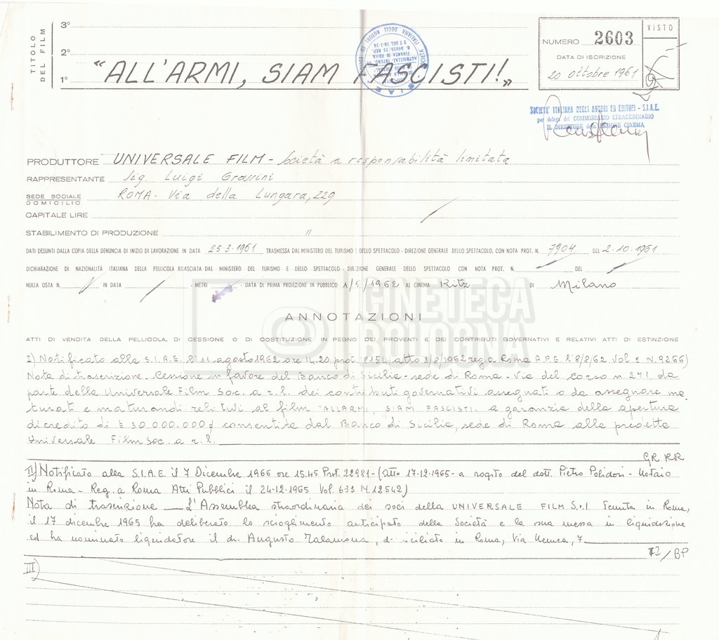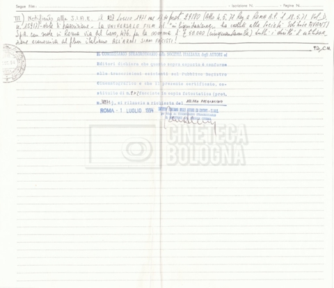 – Diverse copie dell’atto di notifica alla SIAE riguardo alla cessione dei diritti di utilizzazione del film da parte della ‘Universale Film’ alla società ‘Avanti!’.