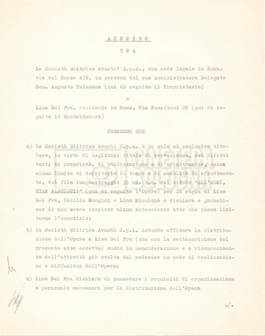 “All’armi, contratto, certificato ‘Società Italiana Autori ed Editori’ (SIAE)”