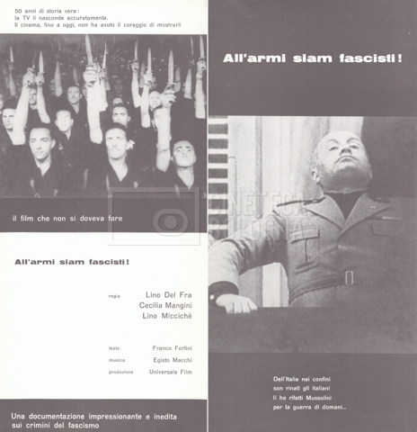 Contiene per lo più documentazione preparatoria, corrispondenza, comunicati stampa, inviti ad eventi per la proiezione del film, rassegna stampa, opuscoli, recensioni, materiale pubblicitario relativi al film “All’armi, siam fascisti!”.