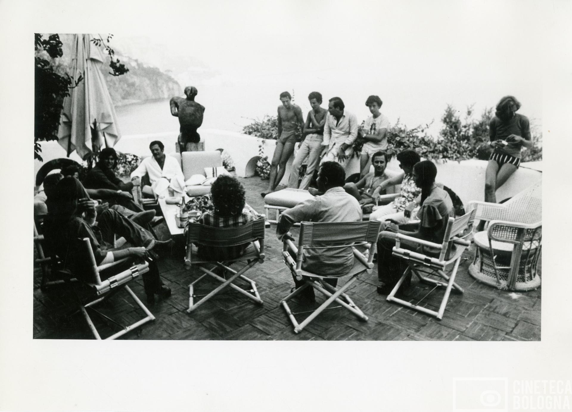 Amalfi. Marcello Mastroianni con la troupe durante una pausa delle riprese del film Che? di Roman Polanski