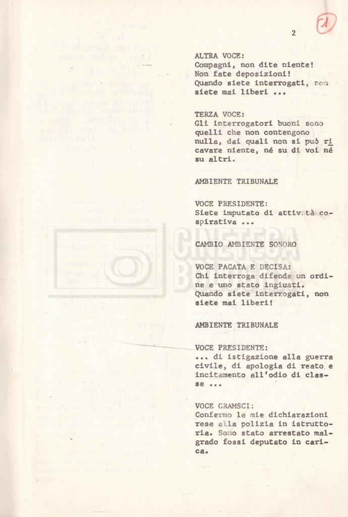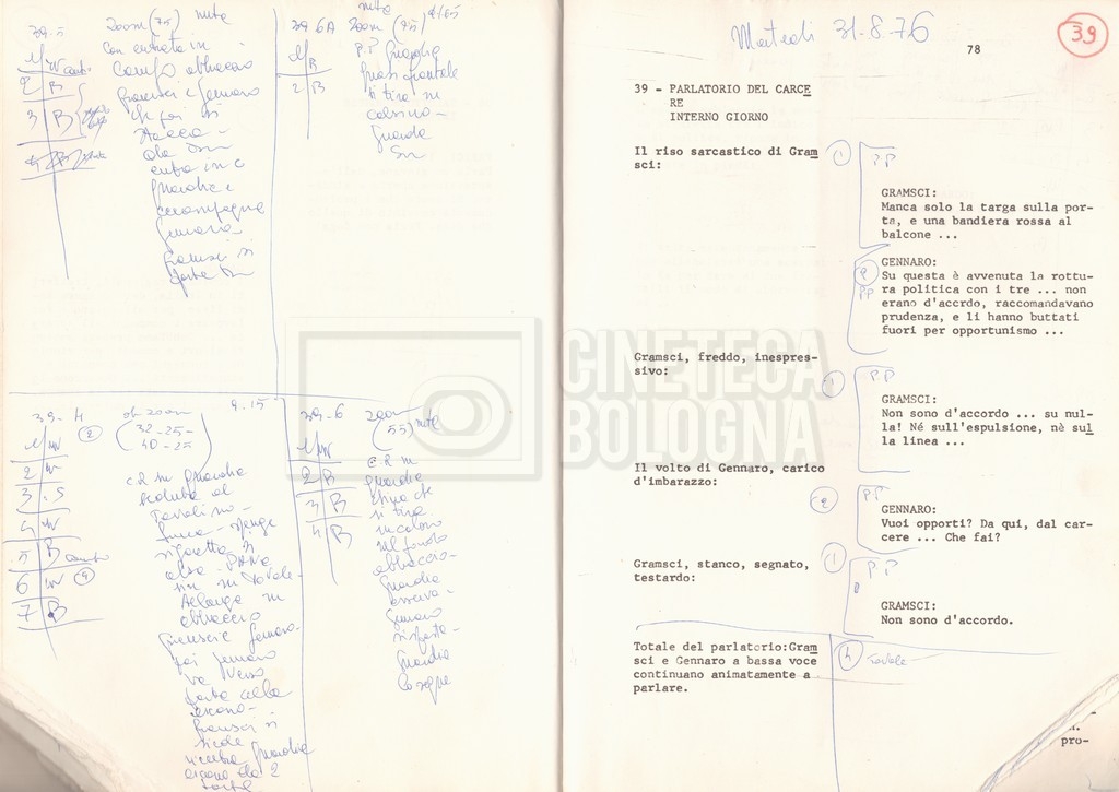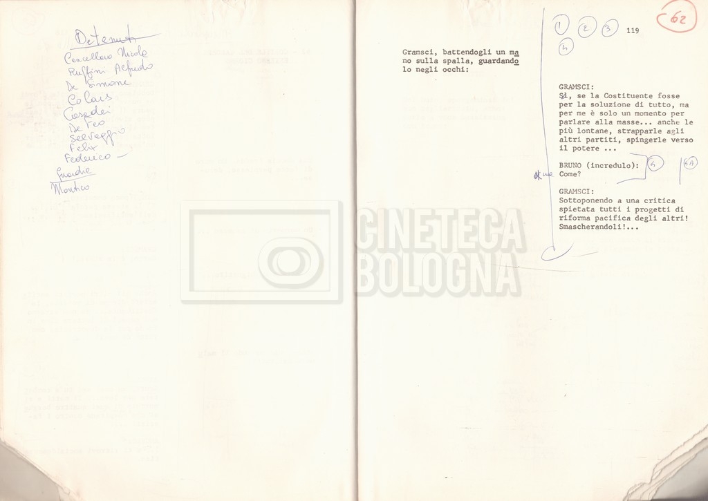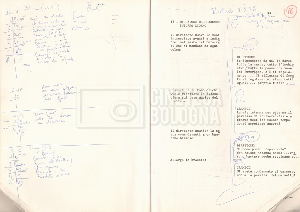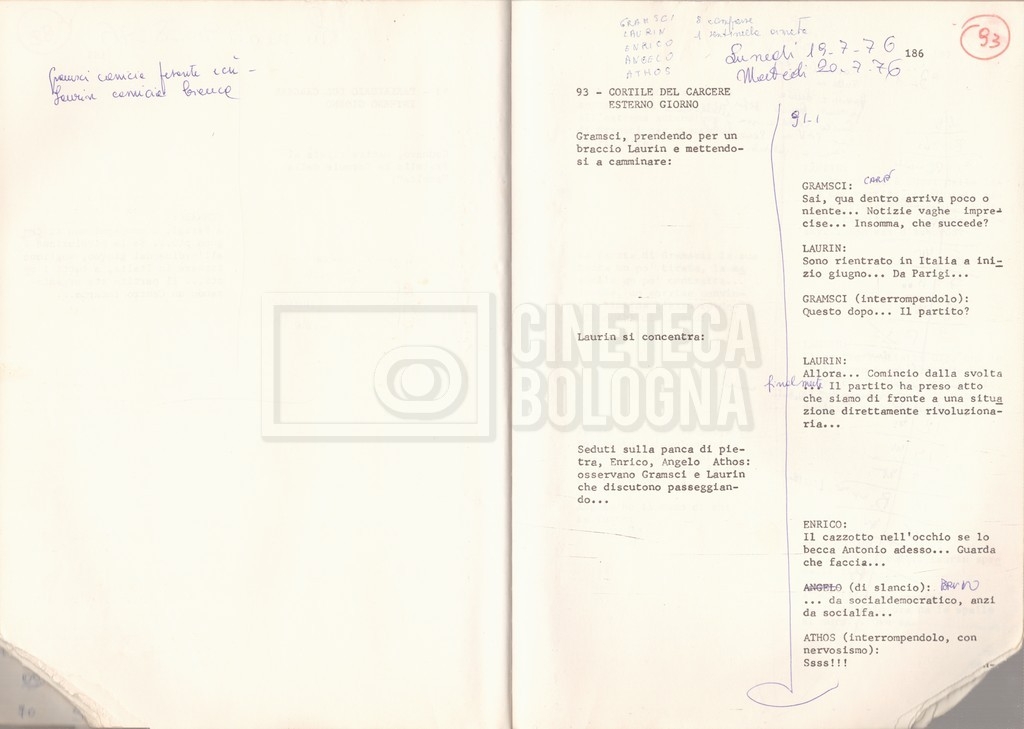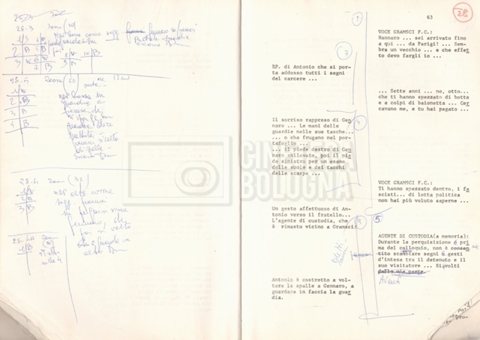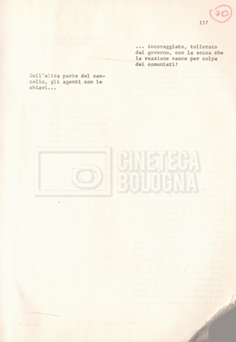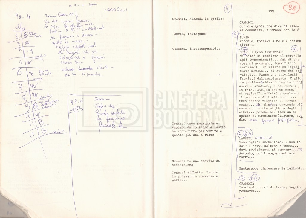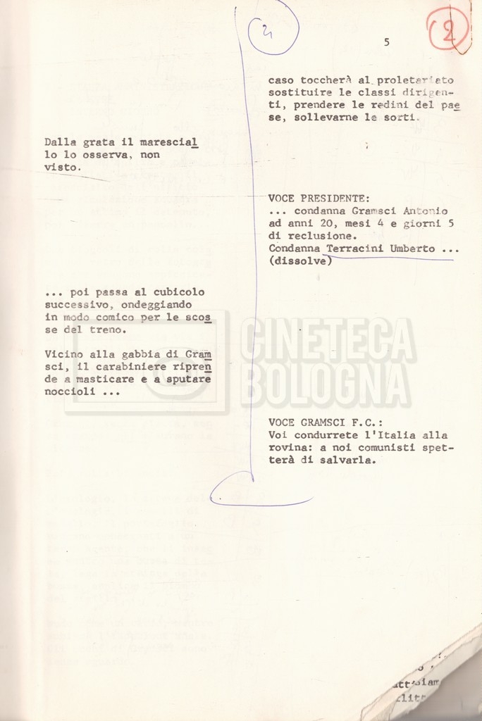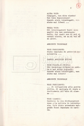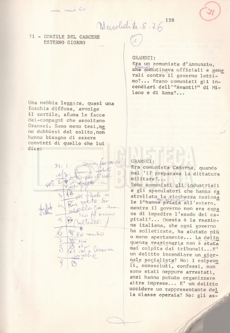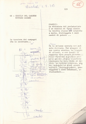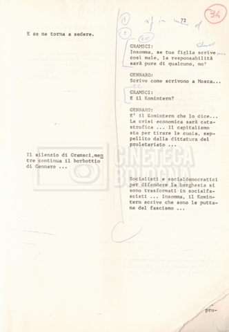 Torna alla banca dati “Antonio Gramsci; copia edizione” Documento storico Fondo Cecilia Mangini – Lino Del Fra / “Film di fiction realizzati” / “Antonio Gramsci – I giorni del carcere” Informazioni archivistiche Cronologia: 1976 Numero di ordinamento definitivo: 4.2.13 Numero di ordinamento provvisorio: 13.02 Descrizione fisica: volume Immagini digitalizzate Informazioni sul film titolo originale: Antonio Gramsci – I giorni del carcere regia: Del Fra, Lino anno: 1977 paese di produzione: Italia lingua principale: italiana Documenti correlati Vai alla banca dati DOCUMENTO STORICO “Preventivo; piano di lavorazione (il primo)” DOCUMENTO STORICO “Prima versione sceneggiatura; scaletta desunta” DOCUMENTO STORICO “Il soggetto stampato; trattamento; trattamento in francese” DOCUMENTO STORICO “Diari di lavorazione” DOCUMENTO STORICO “Appunti per la sceneggiatura” DOCUMENTO STORICO “Ordini del giorno” DOCUMENTO STORICO “Il casting; gli ambienti” DOCUMENTO STORICO “Durante le riprese” DOCUMENTO STORICO “I titoli di testa; i titoli di coda; le percentuali di grandezza” DOCUMENTO STORICO “Lettere sul film; nota bene: presidente della Camera dei deputati era Sandro Pertini” DOCUMENTO STORICO “I contratti degli attori” DOCUMENTO STORICO “Scene soppresse” DOCUMENTO STORICO “Antonio Gramsci; sceneggiatura” DOCUMENTO STORICO “Antonio Gramsci; copia doppiaggio” DOCUMENTO STORICO “Antonio Gramsci; dialoghi definitivi per il doppiaggio e per il ministero” DOCUMENTO STORICO “Materiale Italnoleggio” DOCUMENTO STORICO “Interviste a Lino Del Fra” DOCUMENTO STORICO “Riprese” DOCUMENTO STORICO “Corrispondenza con Claude Ledû” DOCUMENTO STORICO Rassegna stampa