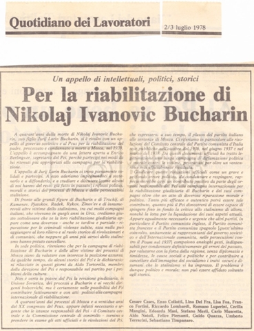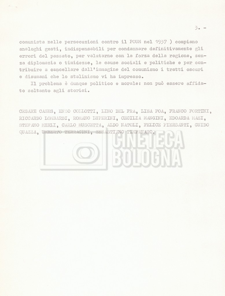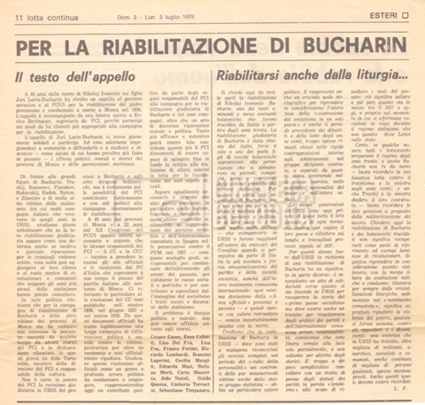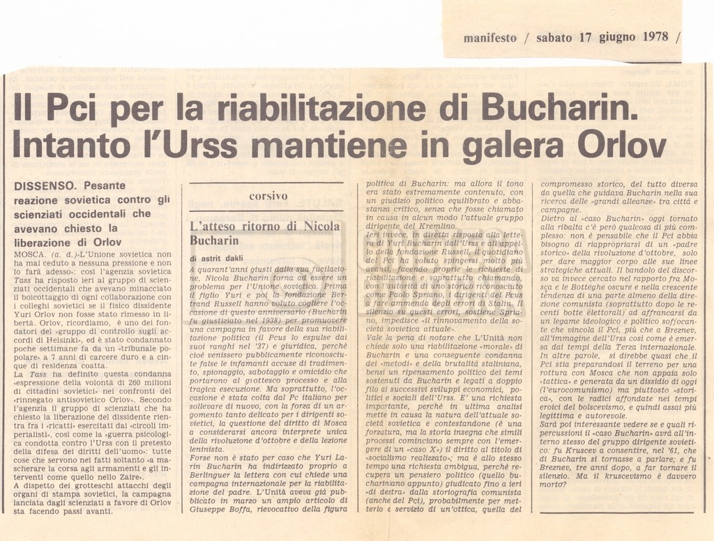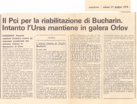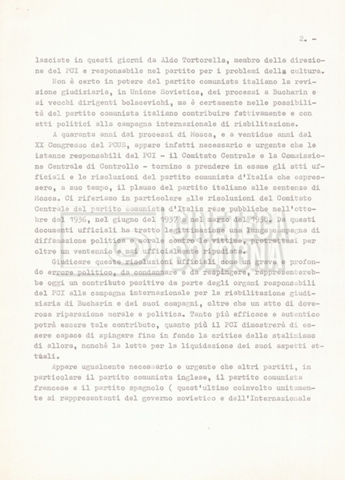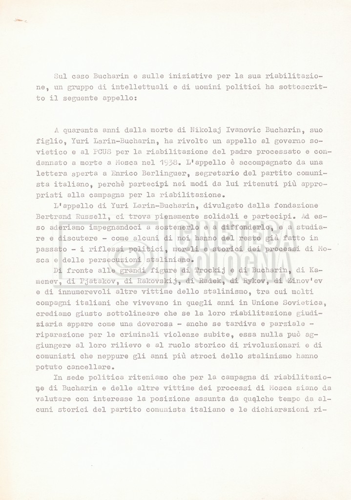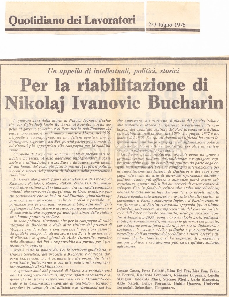 Torna alla banca dati “Appello per la riabilitazione di Bucharin, 1978; la rassegna stampa” Documento storico Fondo Cecilia Mangini – Lino Del Fra / “Documentari non realizzati” / “Processo a Bucharin” Ambiti e contenuto Contiene, oltre a cc. sciolte, il s.fasc.:– “Convegno PCI”. Si segnalano come cc. sciolte:– Rassegna stampa;– Appunti mss. di Lino Del Fra. Informazioni archivistiche Cronologia: 16 giugno 1978 – 29 giugno 1980 Numero di ordinamento definitivo: 5.6.21 Numero di ordinamento provvisorio: 42.02 Descrizione fisica: fascicolo Immagini digitalizzate Documenti correlati Vai alla banca dati DOCUMENTO STORICO “Bibliografie Bucharin” DOCUMENTO STORICO “I testi fotocopiati all’Istituto Feltrinelli” DOCUMENTO STORICO “Archivio Tasca; fotocopie giornali e lettere; elenco articoli fotocopiati e non” DOCUMENTO STORICO Lo studio della figura di Iosif Stalin attraverso gli scambi con Stephen Frand Cohen e Ante Ciliga DOCUMENTO STORICO “Bucharin Francia” DOCUMENTO STORICO “Documentazione; affaire Tourhachevsky; Dimitrov etc.; processi fine anni Venti; 1934 XVII congresso; Riutin; Ulam; Stalin il santo e Trockji il fellone” DOCUMENTO STORICO “Fotocopie: Stalin; Bucharin; Procacci; Mosche Lewin; La societè burocratique” DOCUMENTO STORICO Appunti DOCUMENTO STORICO “Mosca 38” DOCUMENTO STORICO “Alfabeto russo” DOCUMENTO STORICO “Processo I” DOCUMENTO STORICO “Processo II” DOCUMENTO STORICO “Indice: Procés testo stenografico” DOCUMENTO STORICO “Indice di avvenimenti e personaggi” DOCUMENTO STORICO “Cronologie” DOCUMENTO STORICO “Riassunto dei libri di Orlov, Medvedev, Ulam, Conquest” DOCUMENTO STORICO “Appunti di Lino” DOCUMENTO STORICO “Ideologia demonologica espressa nei processi; schema: gli impuntati del processo; schema: le udienze del processo” DOCUMENTO STORICO “Fascicoli monografici” DOCUMENTO STORICO Interviste in casa Medvedev a Mosca con Anna Larina, Yuri Bucharin, Roy Medvedev, Yevgeny Gnedin, Edmund Stevens