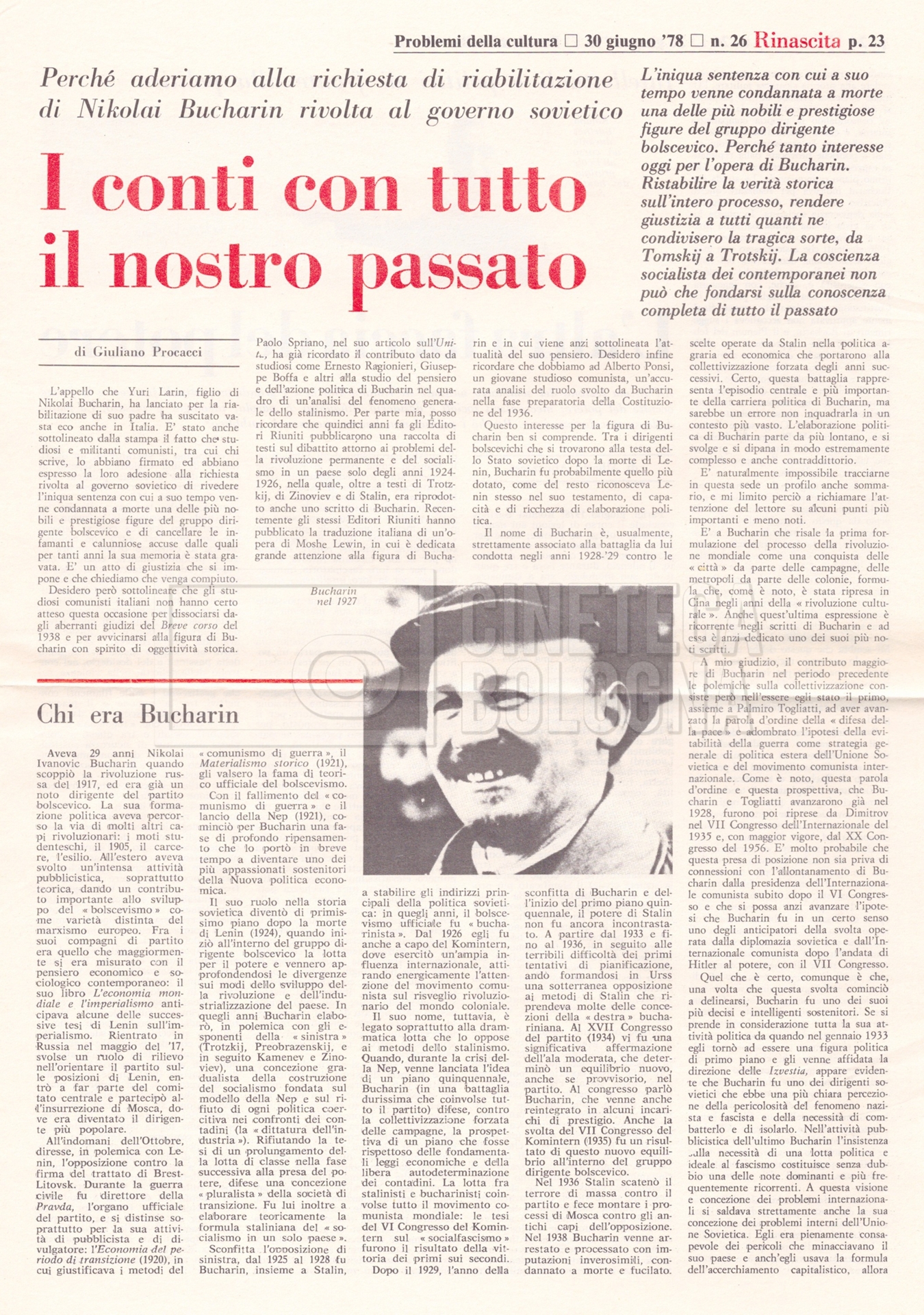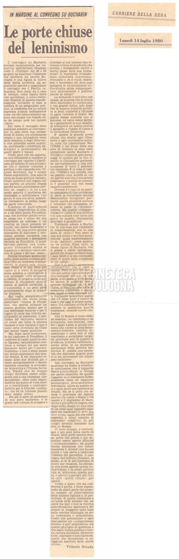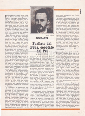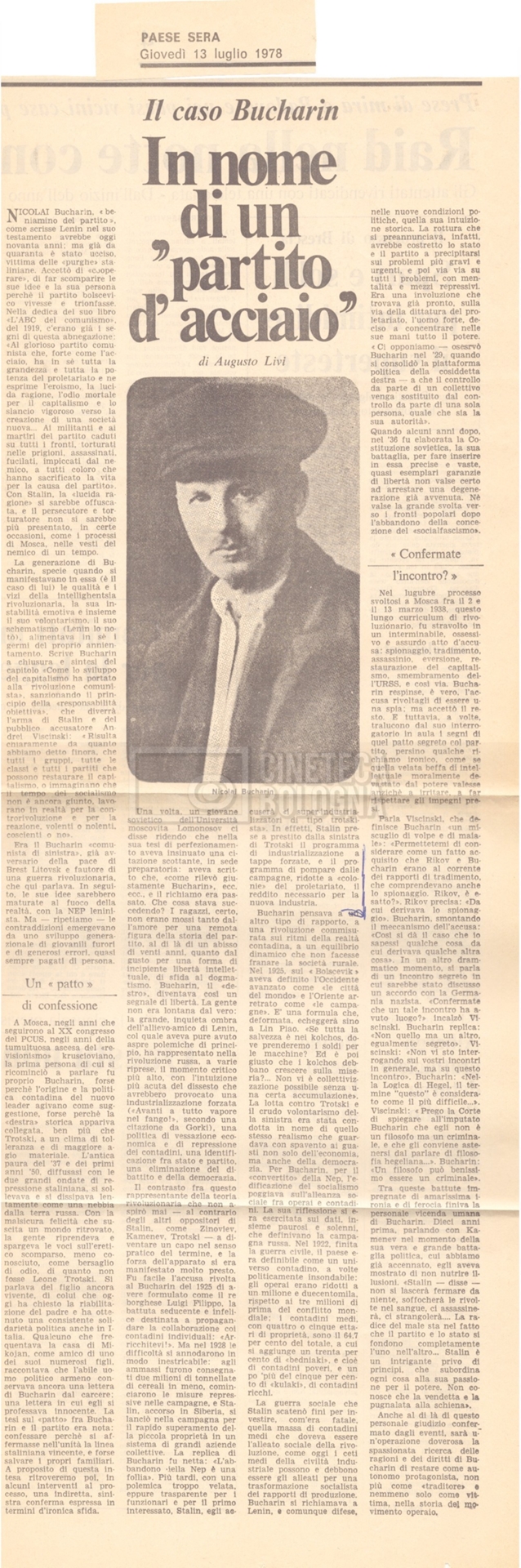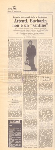 Torna alla banca dati “Appello per la riabilitazione di Bucharin, 1978; la rassegna stampa” Documento storico Fondo Cecilia Mangini – Lino Del Fra / “Documentari non realizzati” / “Processo a Bucharin” Ambiti e contenuto Contiene, oltre a cc. sciolte, il s.fasc.:– “Convegno PCI”. Si segnalano come cc. sciolte:– Rassegna stampa;– Appunti mss. di Lino Del Fra. Informazioni archivistiche Cronologia: 16 giugno 1978 – 29 giugno 1980 Numero di ordinamento definitivo: 5.6.21 Numero di ordinamento provvisorio: 42.02 Descrizione fisica: fascicolo Immagini digitalizzate Documenti correlati Vai alla banca dati DOCUMENTO STORICO “Bibliografie Bucharin” DOCUMENTO STORICO “I testi fotocopiati all’Istituto Feltrinelli” DOCUMENTO STORICO “Archivio Tasca; fotocopie giornali e lettere; elenco articoli fotocopiati e non” DOCUMENTO STORICO Lo studio della figura di Iosif Stalin attraverso gli scambi con Stephen Frand Cohen e Ante Ciliga DOCUMENTO STORICO “Bucharin Francia” DOCUMENTO STORICO “Documentazione; affaire Tourhachevsky; Dimitrov etc.; processi fine anni Venti; 1934 XVII congresso; Riutin; Ulam; Stalin il santo e Trockji il fellone” DOCUMENTO STORICO “Fotocopie: Stalin; Bucharin; Procacci; Mosche Lewin; La societè burocratique” DOCUMENTO STORICO Appunti DOCUMENTO STORICO “Mosca 38” DOCUMENTO STORICO “Alfabeto russo” DOCUMENTO STORICO “Processo I” DOCUMENTO STORICO “Processo II” DOCUMENTO STORICO “Indice: Procés testo stenografico” DOCUMENTO STORICO “Indice di avvenimenti e personaggi” DOCUMENTO STORICO “Cronologie” DOCUMENTO STORICO “Riassunto dei libri di Orlov, Medvedev, Ulam, Conquest” DOCUMENTO STORICO “Appunti di Lino” DOCUMENTO STORICO “Ideologia demonologica espressa nei processi; schema: gli impuntati del processo; schema: le udienze del processo” DOCUMENTO STORICO “Fascicoli monografici” DOCUMENTO STORICO Interviste in casa Medvedev a Mosca con Anna Larina, Yuri Bucharin, Roy Medvedev, Yevgeny Gnedin, Edmund Stevens