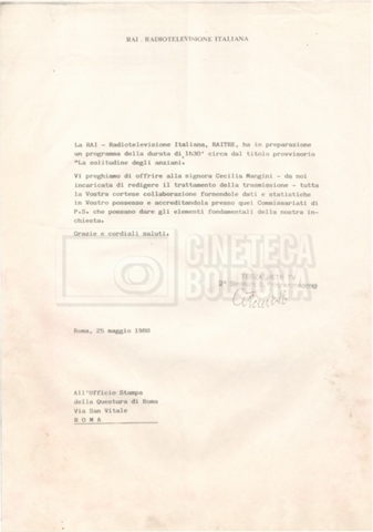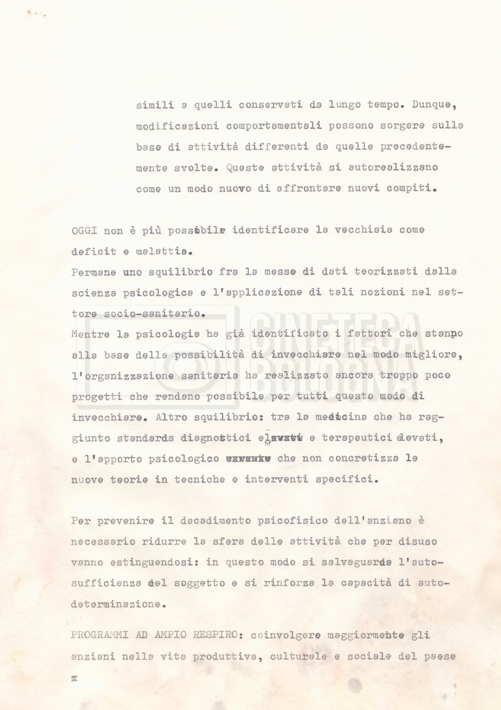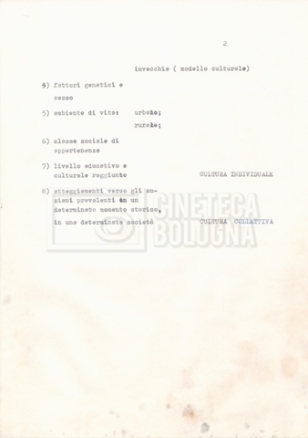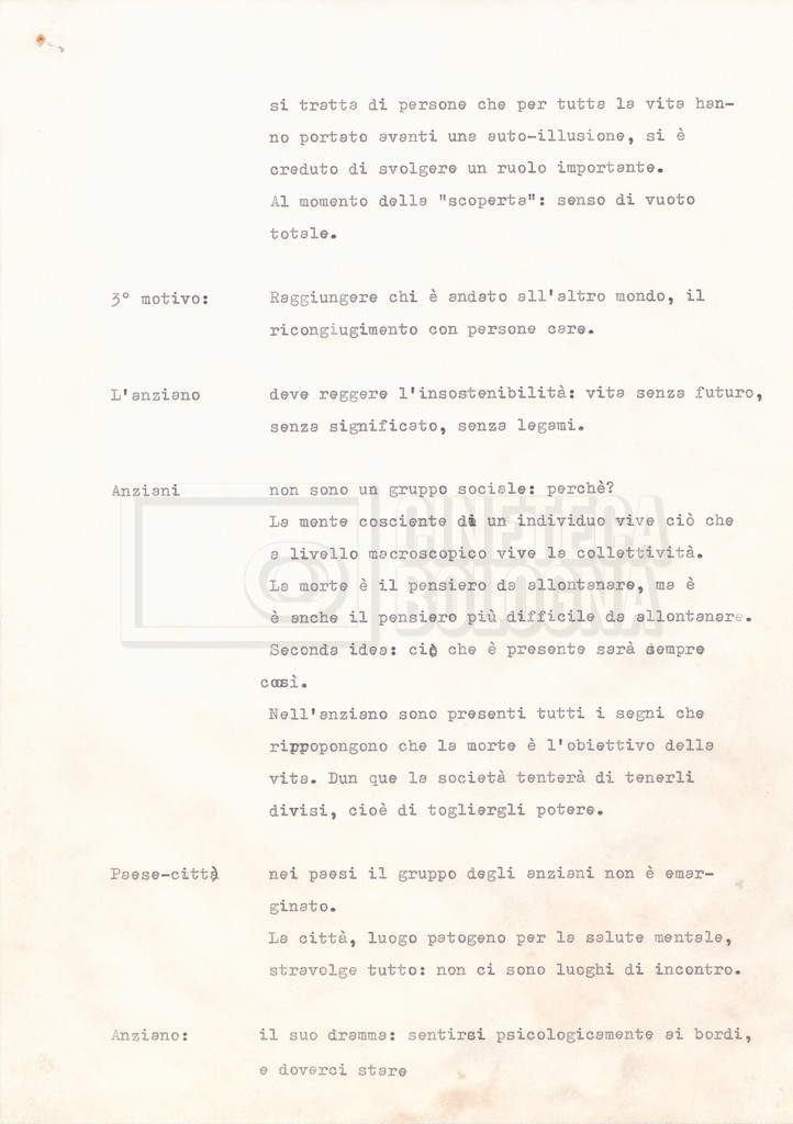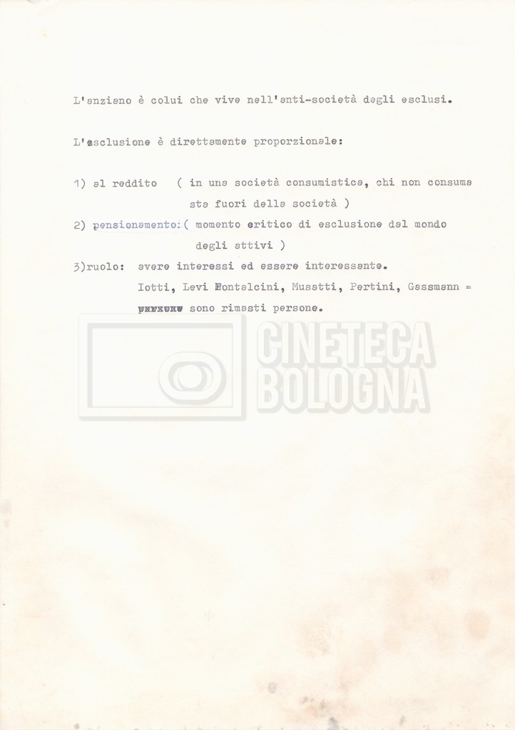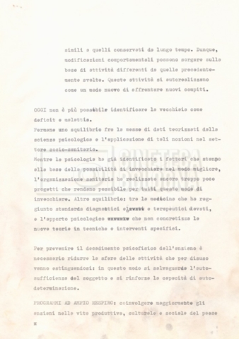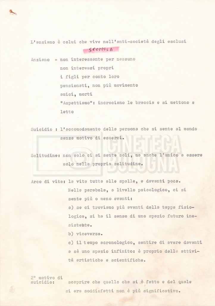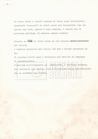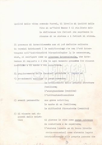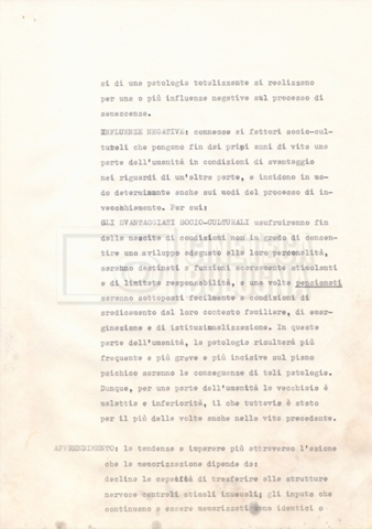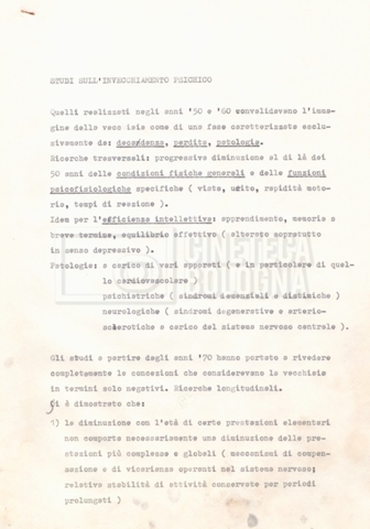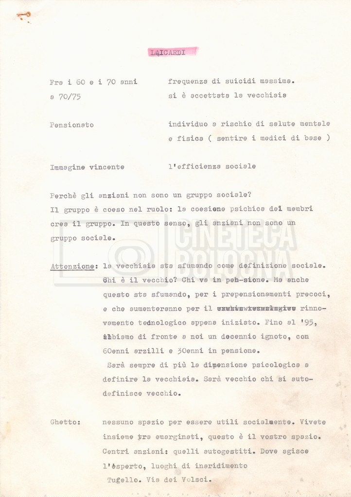 Torna alla banca dati Appunti Documento storico Fondo Cecilia Mangini – Lino Del Fra / “Documentari non realizzati” / “La solitudine degli anziani” Ambiti e contenuto Contiene appunti mss. e datt. sull’invecchiamento e la psicologia degli anziani, in parte sciolti e in parte raccolti in un quaderno dal titolo “Scoppola, Laicardi”, cognomi di studiosi del tema. Informazioni archivistiche Cronologia: [1988 – 1989] Numero di ordinamento definitivo: 5.10.3 Numero di ordinamento provvisorio: 49.03 Descrizione fisica: fascicolo Immagini digitalizzate Documenti correlati Vai alla banca dati DOCUMENTO STORICO “Rassegna stampa” DOCUMENTO STORICO “Fotocopie” DOCUMENTO STORICO Materiale di studio, corrispondenza e trattamento DOCUMENTO STORICO Materiale di studio