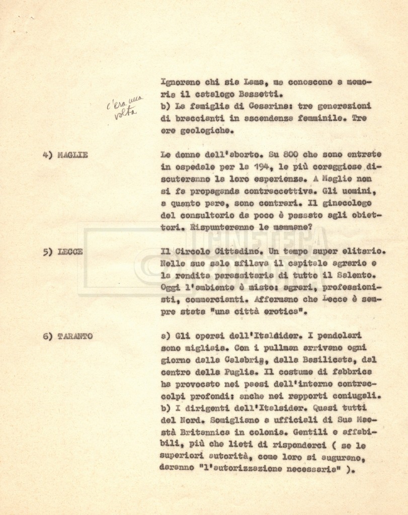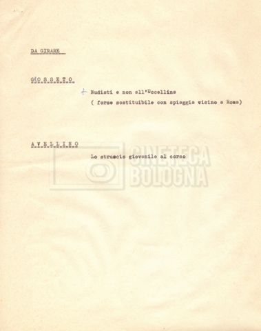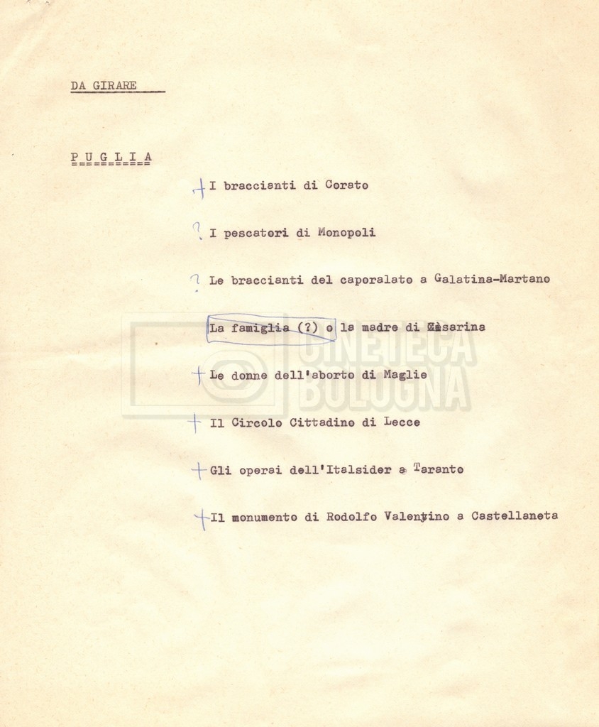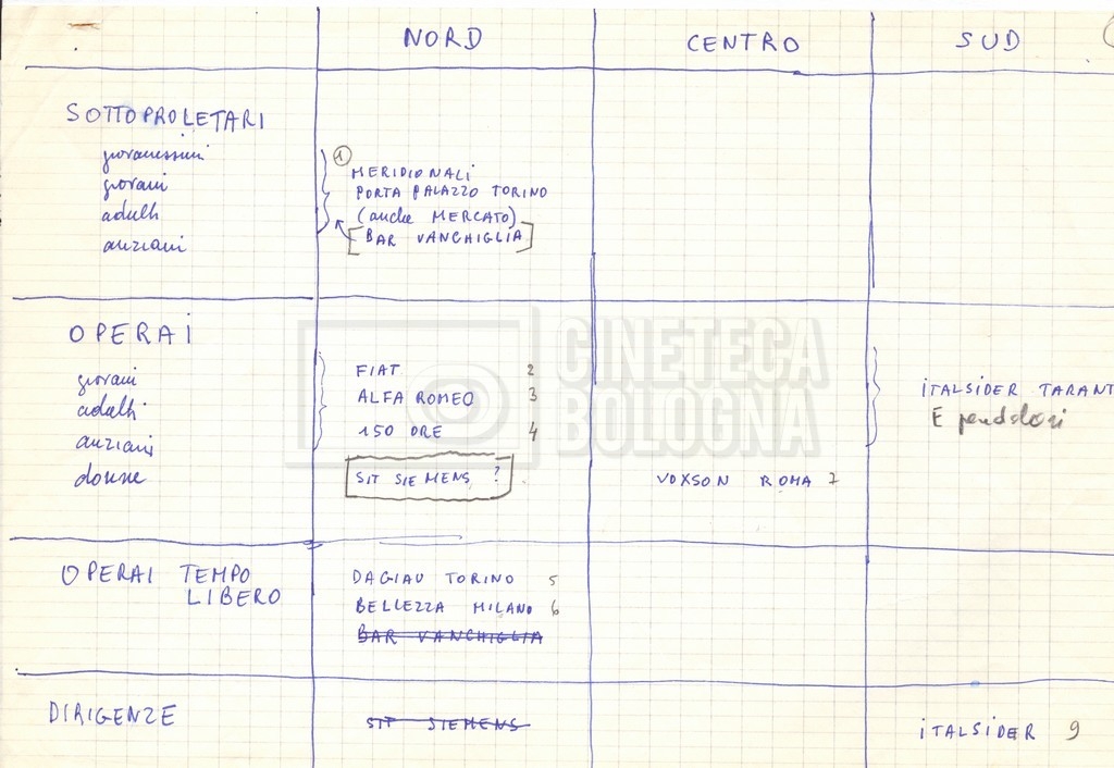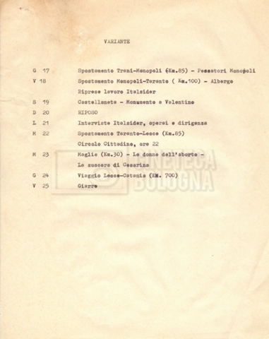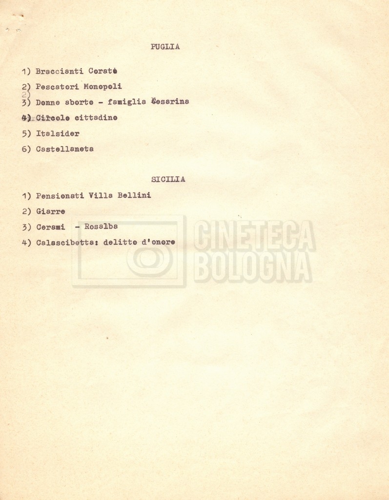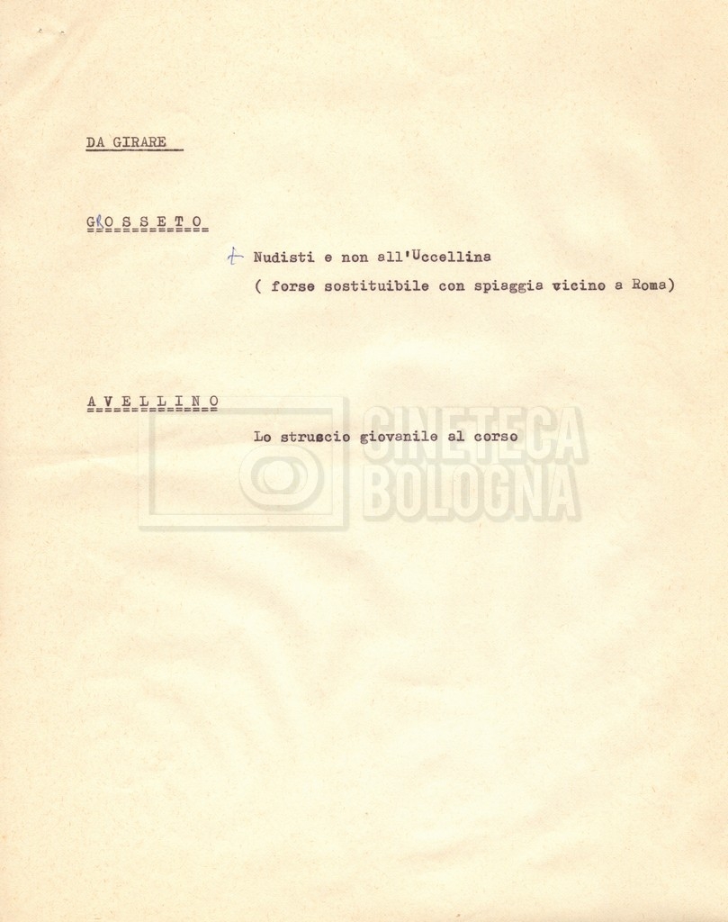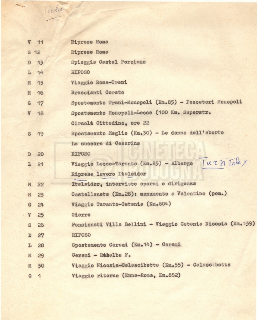 “Appunti sopralluoghi (Prima e seconda versione); prospetti per le riprese al nord, al centro-sud; appunti di Lino Del Fra; piano di lavorazione”