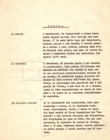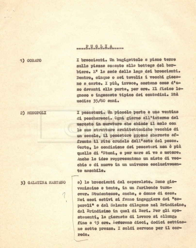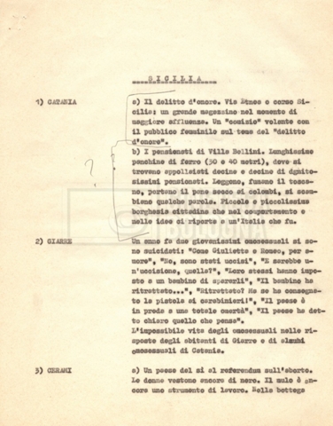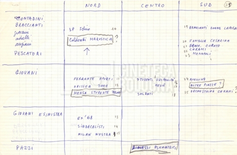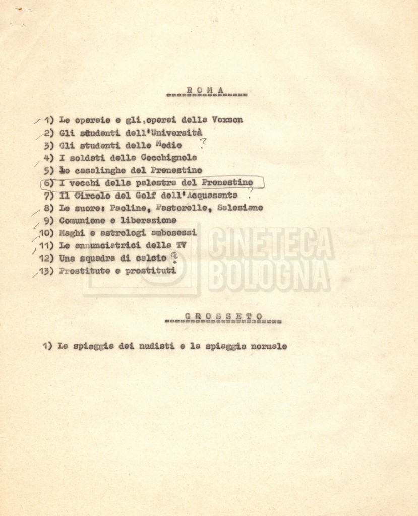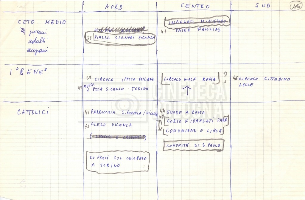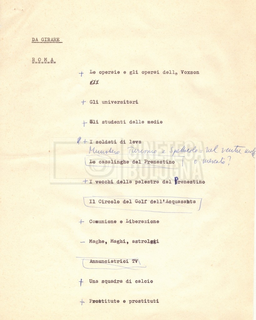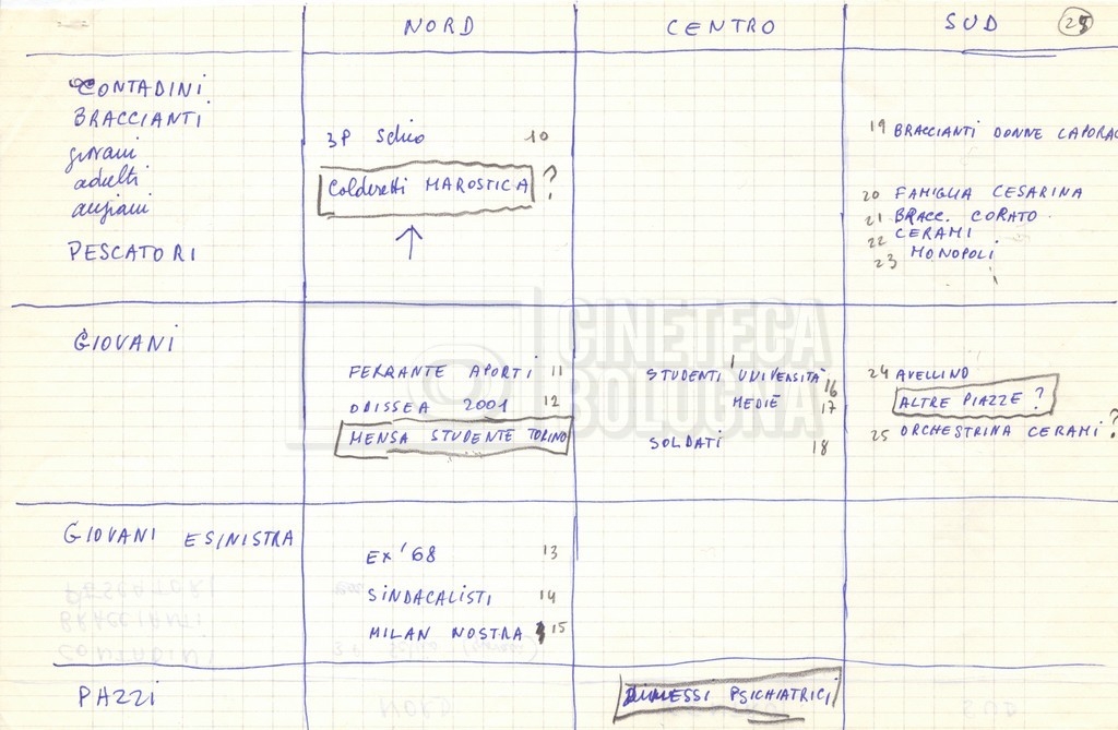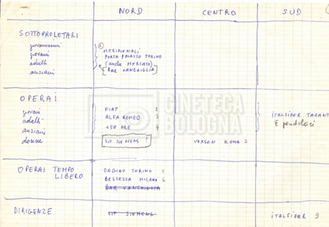 “Appunti sopralluoghi (Prima e seconda versione); prospetti per le riprese al nord, al centro-sud; appunti di Lino Del Fra; piano di lavorazione”