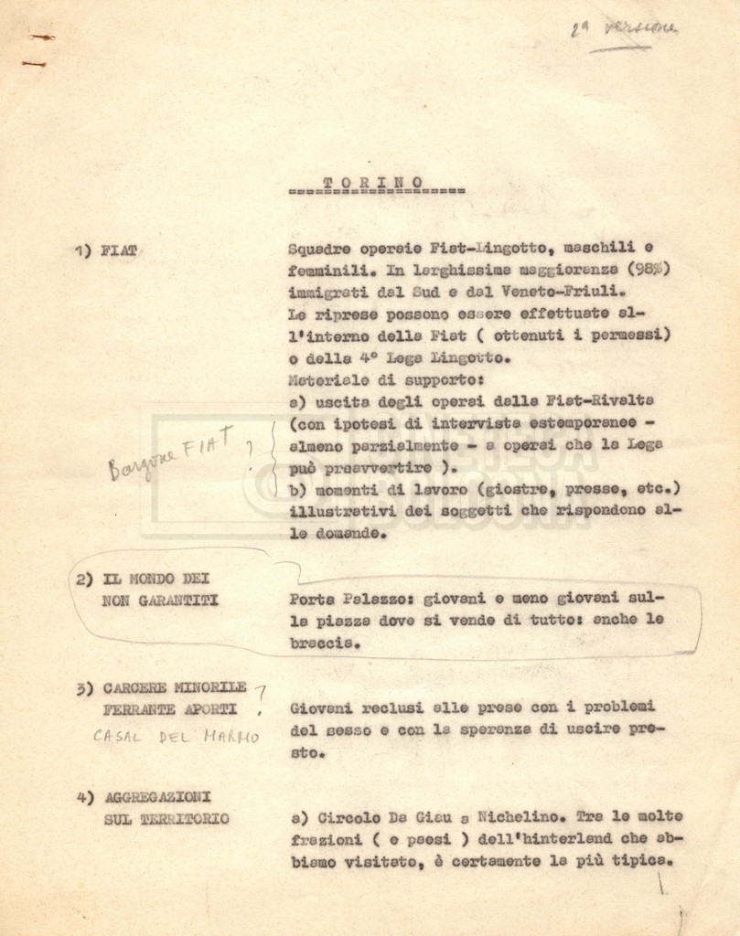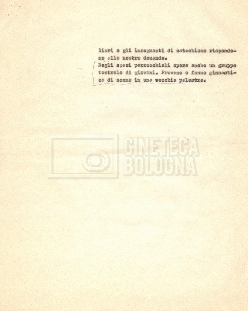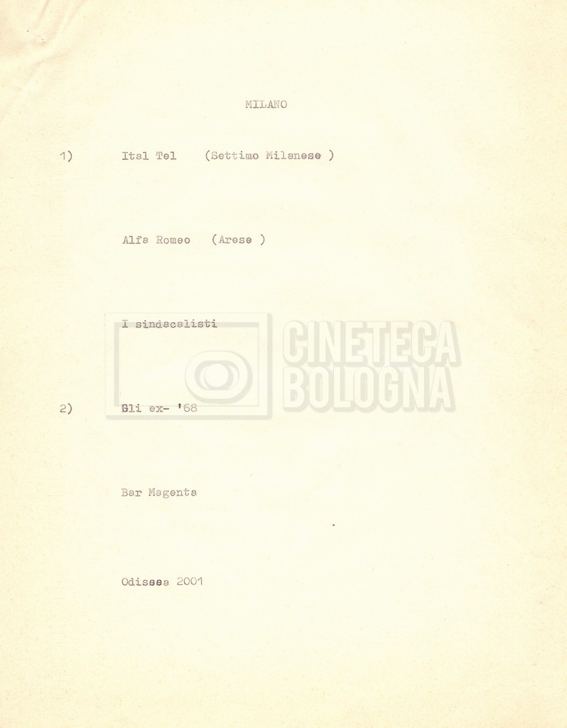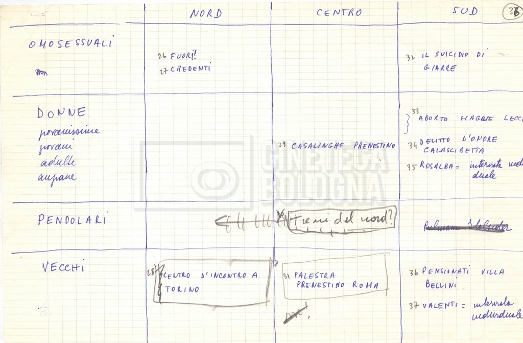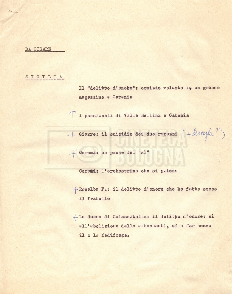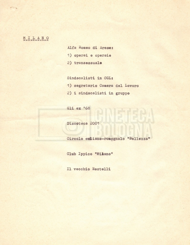 “Appunti sopralluoghi (Prima e seconda versione); prospetti per le riprese al nord, al centro-sud; appunti di Lino Del Fra; piano di lavorazione”