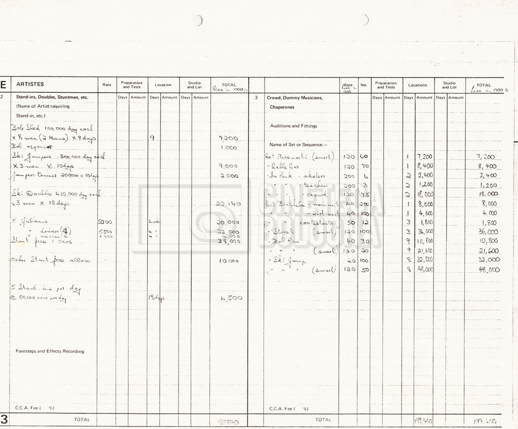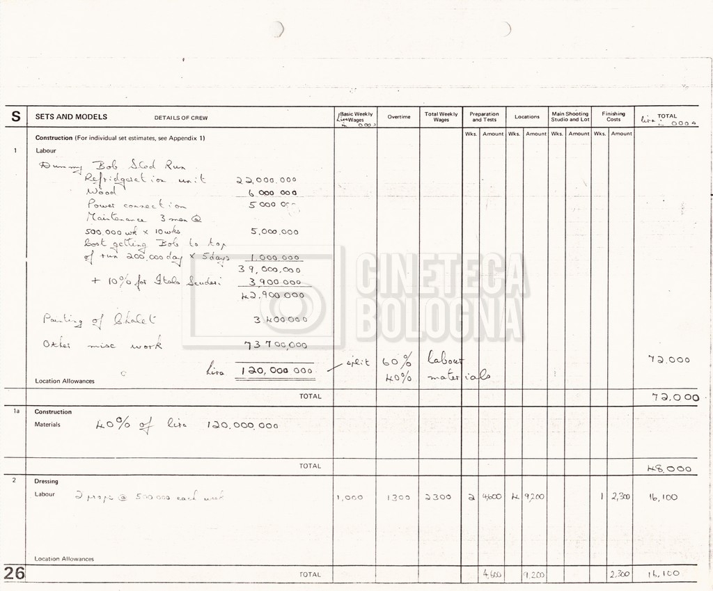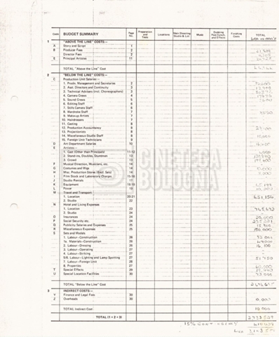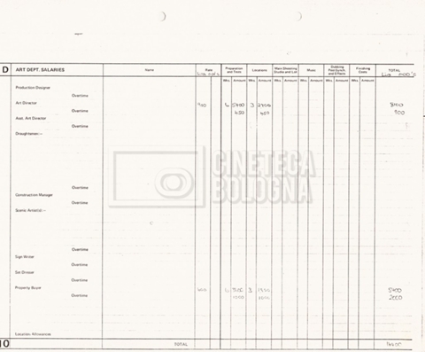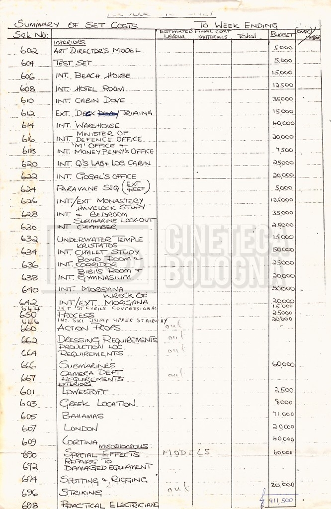 – Un production budget and dollar summary per l’intero film (16 settembre 1980);