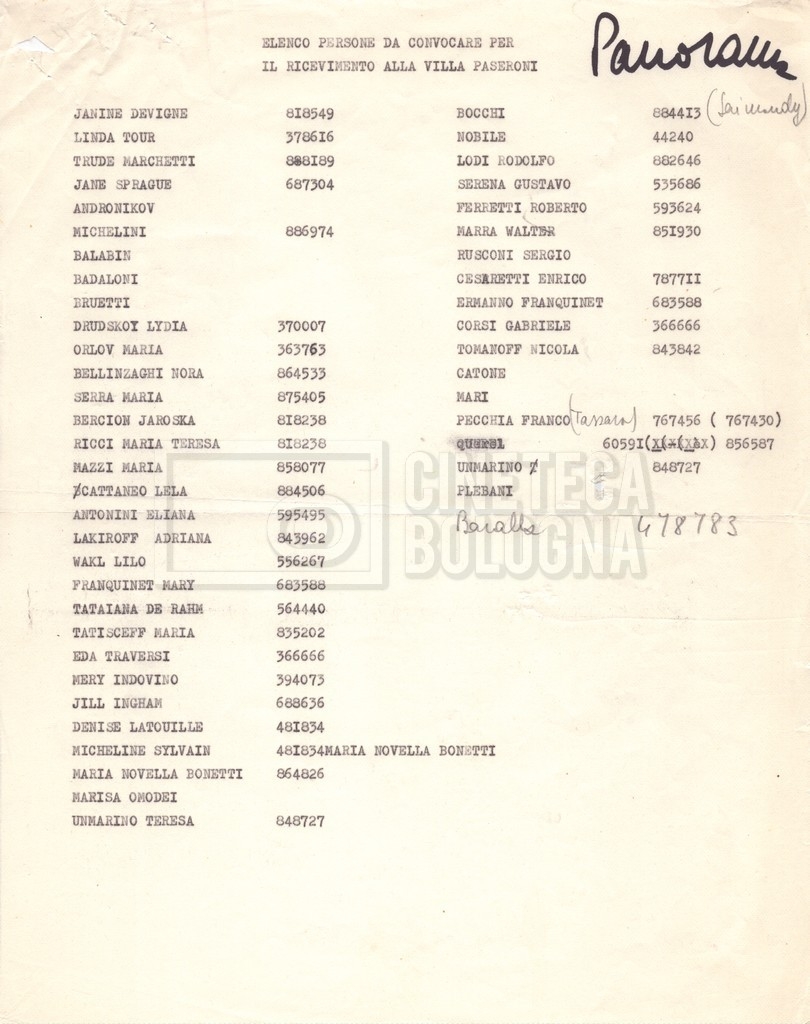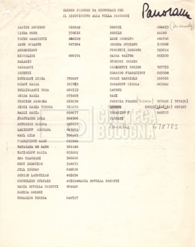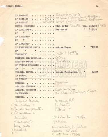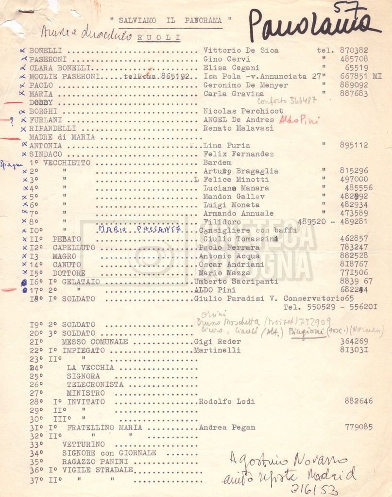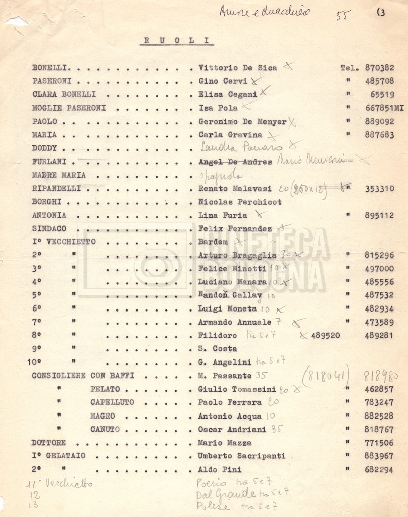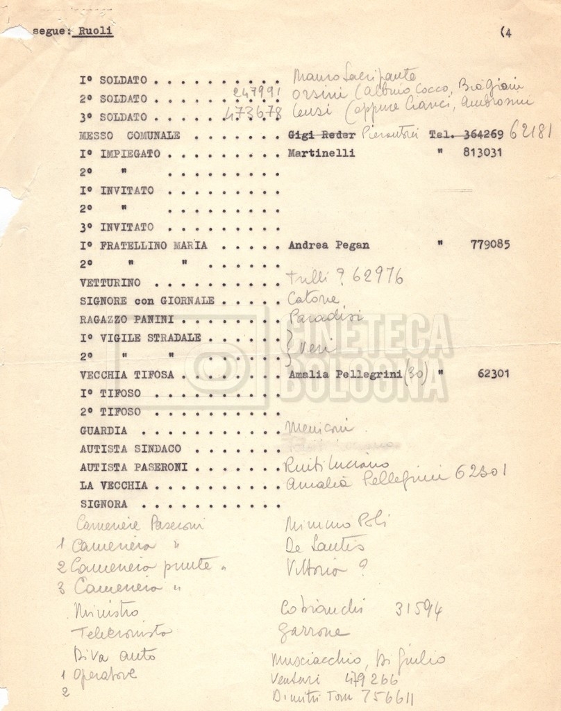 Contiene un elenco del cast artistico, nel quale ad ogni personaggio corrisponde l’indicazione dell’attore e del suo recapito telefonico, e un elenco delle comparse per la scena di un ricevimento da girare a “Villa Paseroni”, con indicati i nomi degli attori e i rispettivi recapiti telefonici.