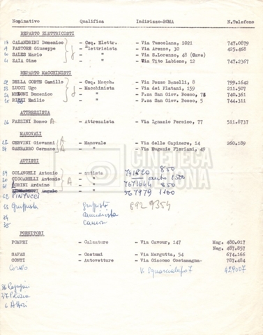 Torna alla banca dati “Cast e unit lists” Documento storico Fondo Mara Blasetti / “Film Mara girati” / La volpe e le camelie Ambiti e contenuto Contiene elenchi del cast artistico e tecnico nei quali vengono indicati anche i recapiti. Informazioni archivistiche Cronologia: 1966 Numero di ordinamento definitivo: 1.12.1 Numero di ordinamento provvisorio: 4.1.A Descrizione fisica: fascicolo Immagini digitalizzate Informazioni sul film titolo originale: La volpe e le camelie regia: Blasi, Silverio anno: 1966 paese di produzione: Italia lingua principale: italiana Documenti correlati Vai alla banca dati DOCUMENTO STORICO Documenti per la realizzazione del film