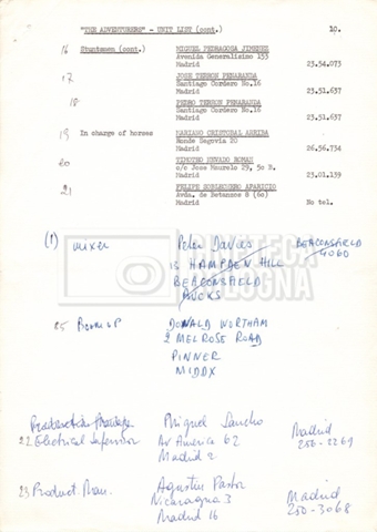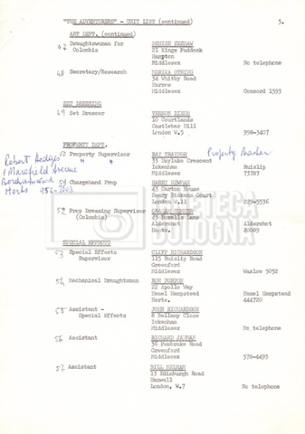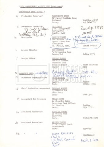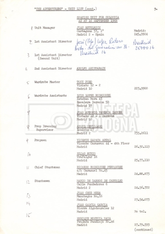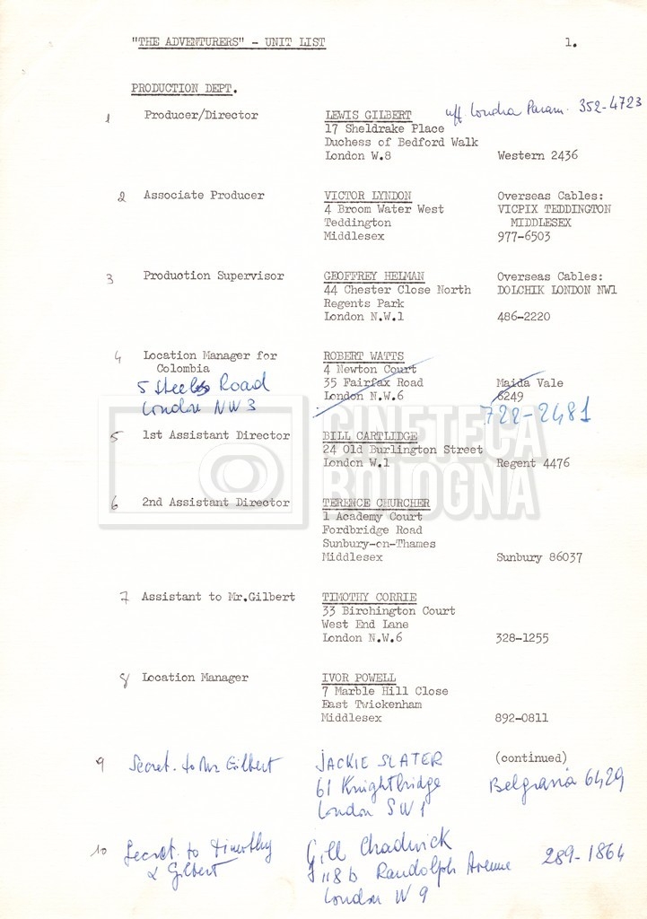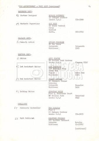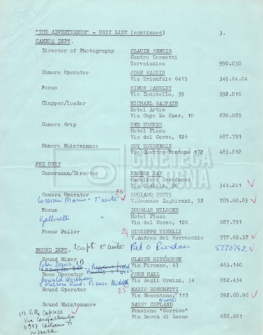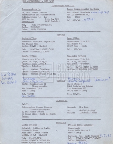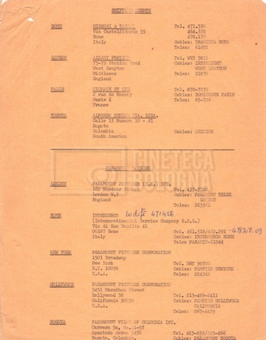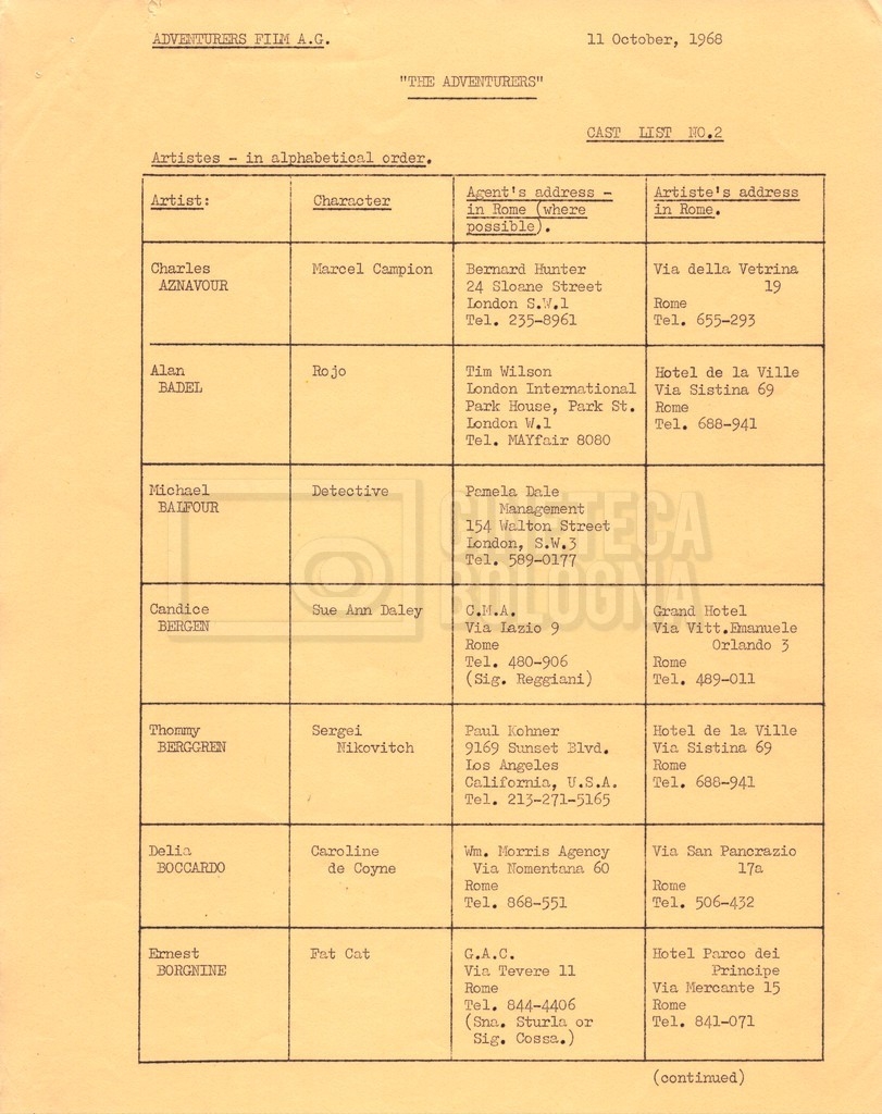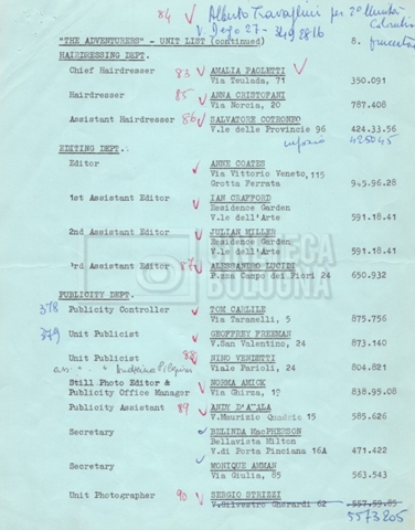 Contiene elenchi del cast artistico e tecnico impegnato in Italia, Inghilterra e Spagna, nei quali vengono indicati anche i recapiti. Si segnalano, inoltre: