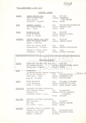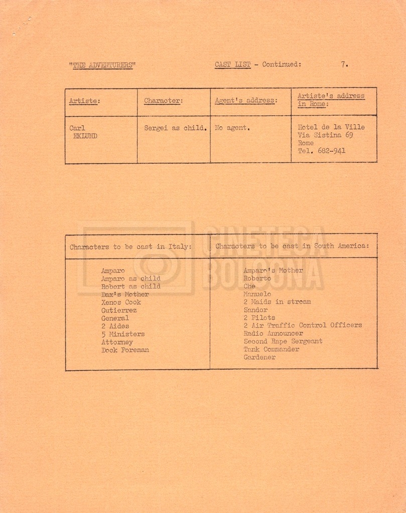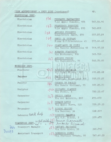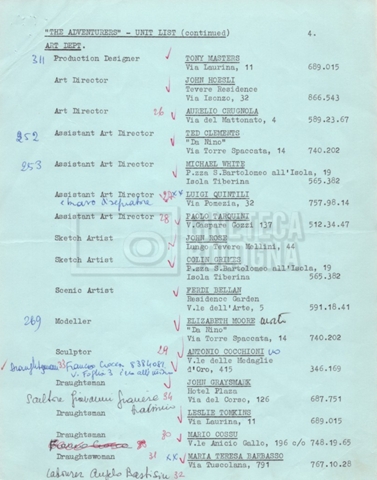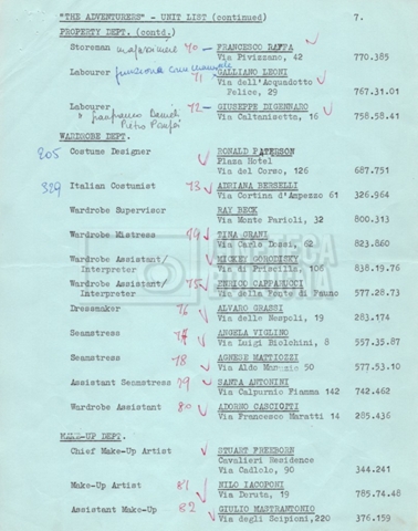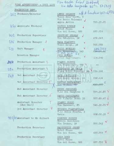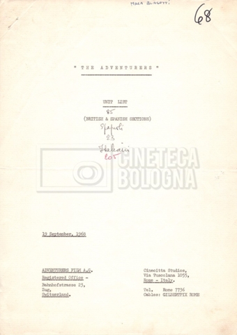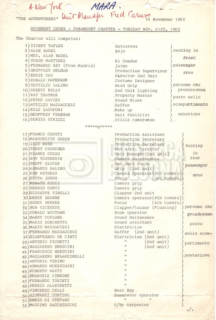 – Un movement order per il cast tecnico, 92 persone in totale, programmato per il 21 novembre 1968, con partenza da Roma, scalo a Madrid e destinazione New York (16 novembre 1968).