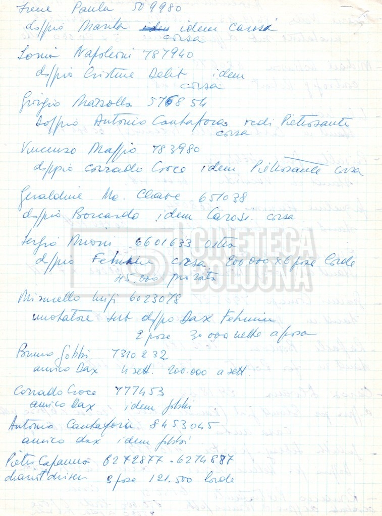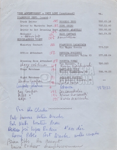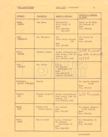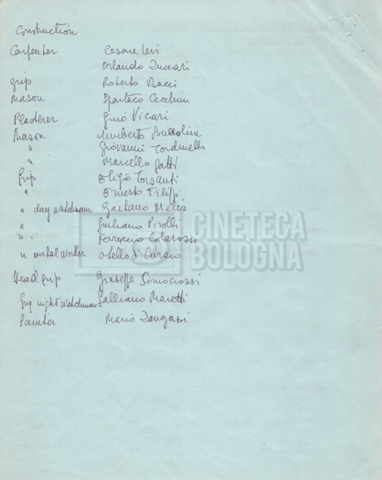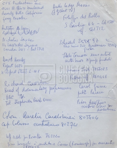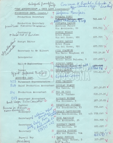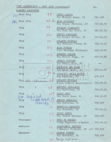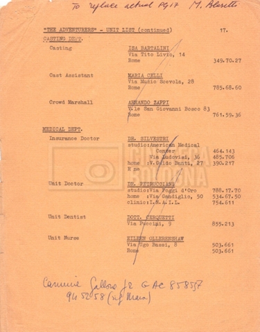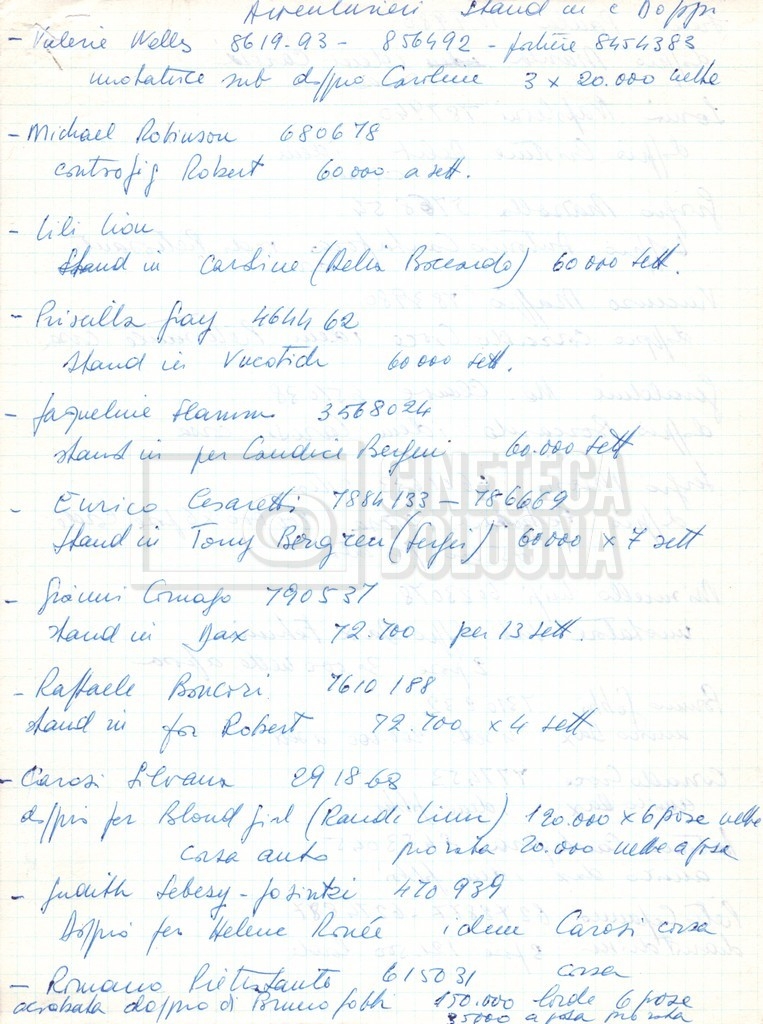 – Un elenco mss. riguardante gli attori “stand-in e doppi”, in cui vengono indicati anche i recapiti;