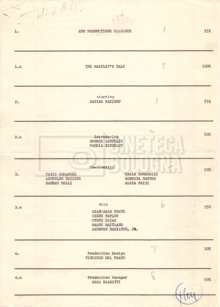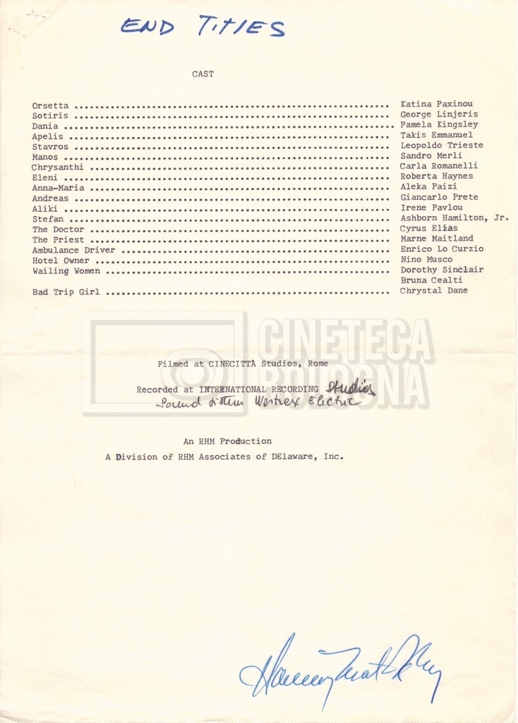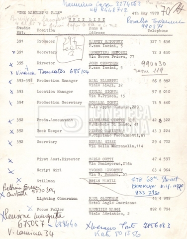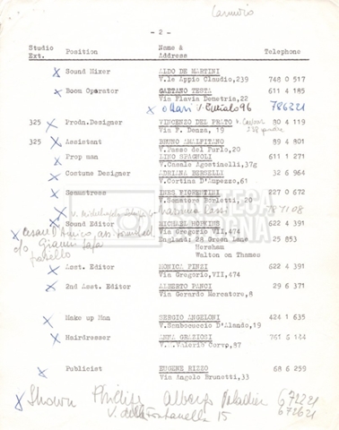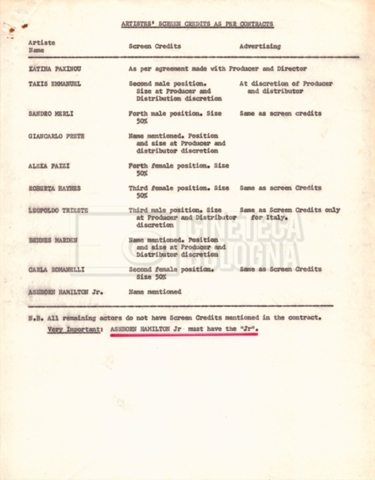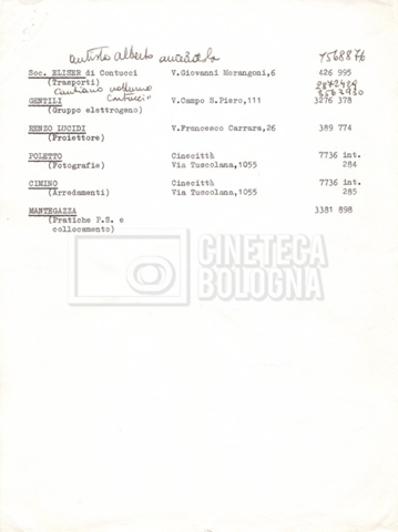– Elenchi del cast artistico e tecnico, nei quali vengono indicati i recapiti;