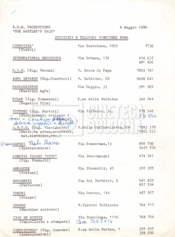 – Una lista di nominativi e recapiti di fornitori di Roma.