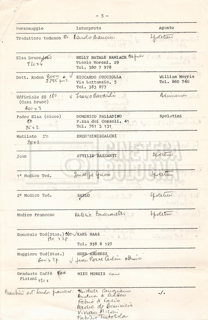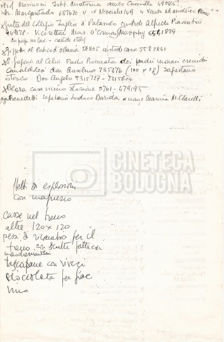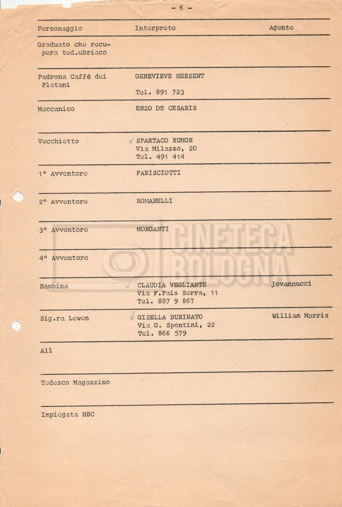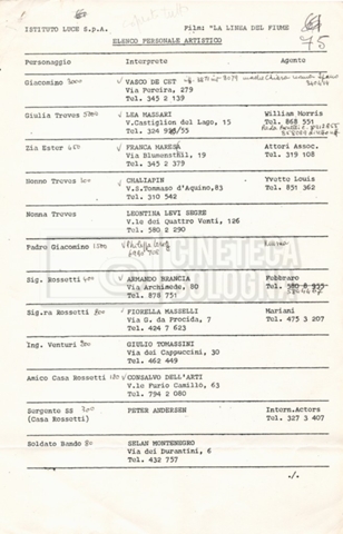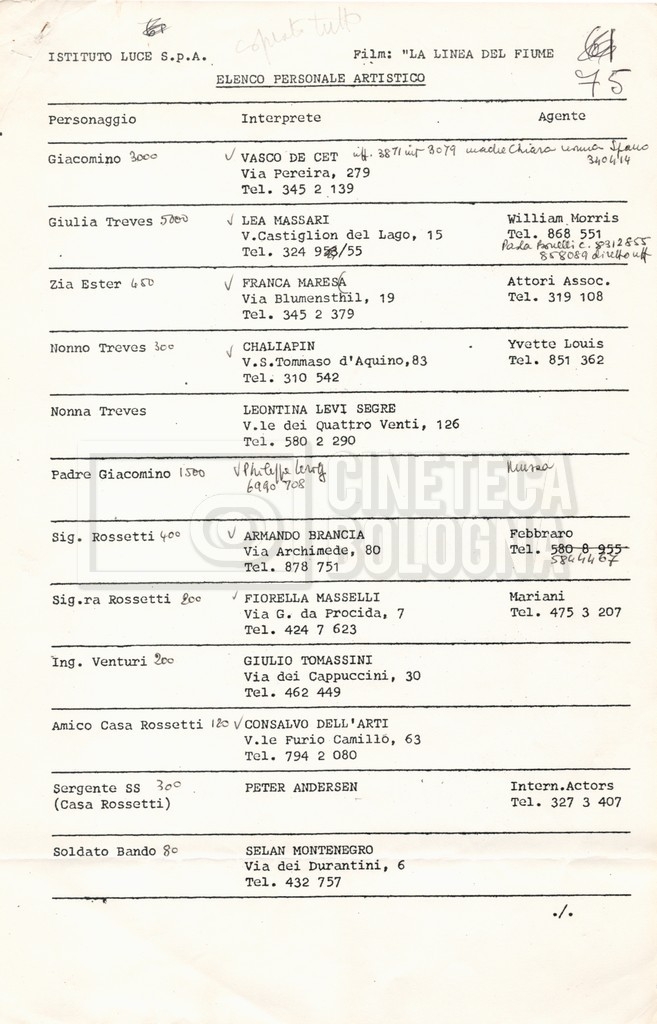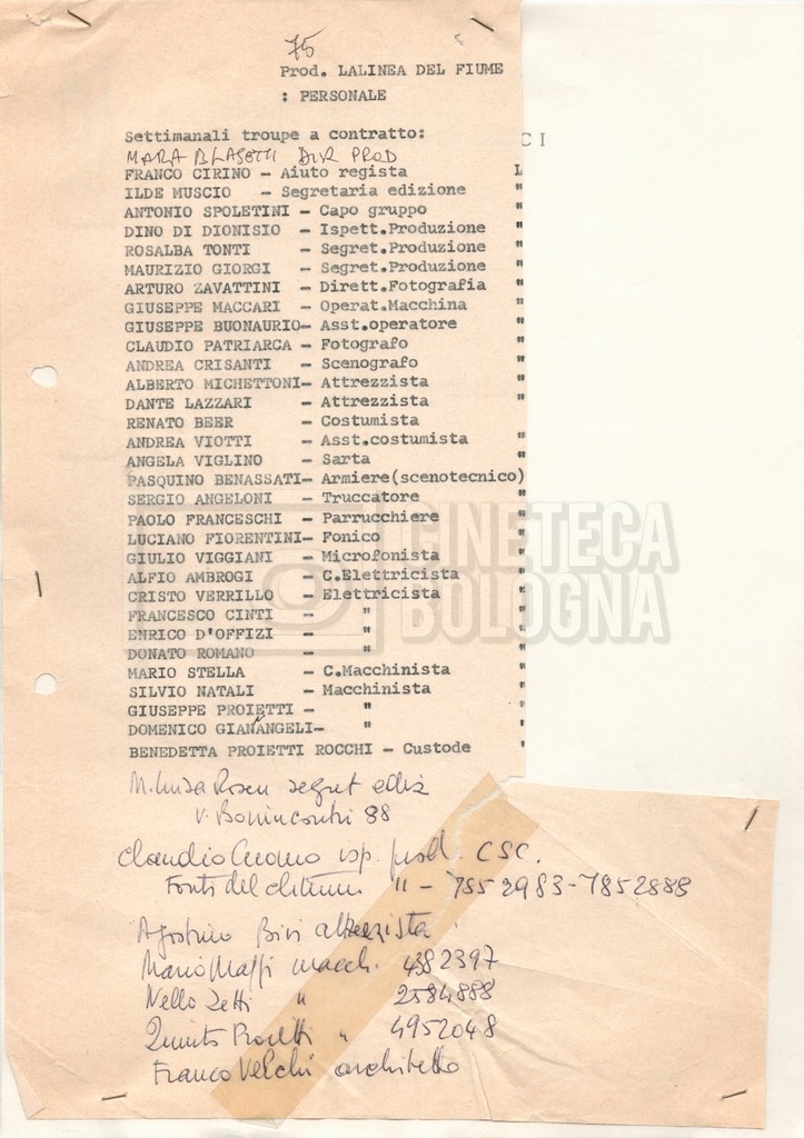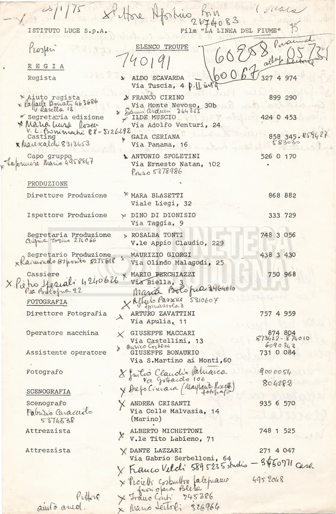 Torna alla banca dati “Cast e unit lists” Documento storico Fondo Mara Blasetti / “Film Mara girati” / La linea del fiume Ambiti e contenuto Si segnalano elenchi del cast artistico e tecnico, nei quali vengono indicati i recapiti. I documenti si presentano fortemente appuntati. Informazioni archivistiche Cronologia: 1975 Numero di ordinamento definitivo: 1.20.1 Numero di ordinamento provvisorio: 4.1.B Descrizione fisica: fascicolo Immagini digitalizzate Informazioni sul film titolo originale: La linea del fiume regia: Scavarda, Aldo anno: 1976 paese di produzione: Italia lingua principale: italiana Documenti correlati Vai alla banca dati DOCUMENTO STORICO Gestione delle riprese, documentazione contabile e corrispondenza DOCUMENTO STORICO “La linea del fiume”