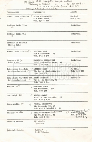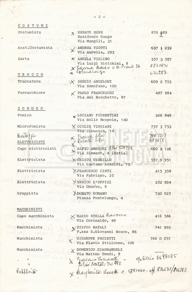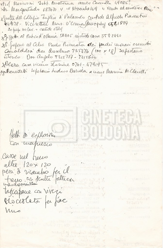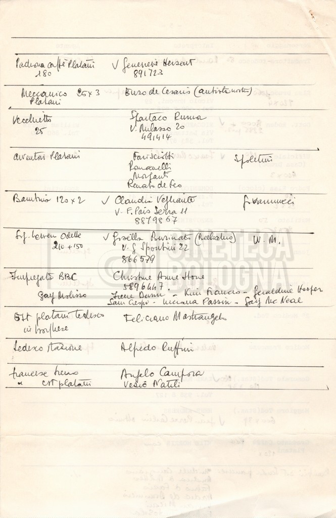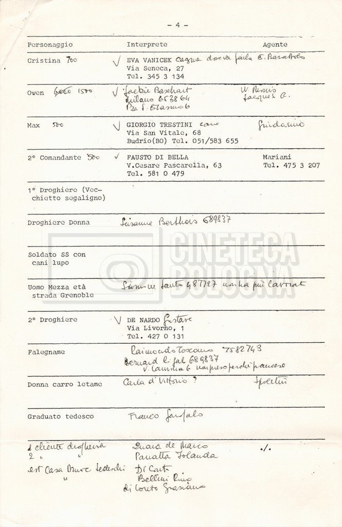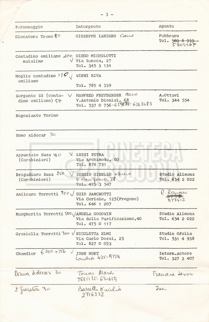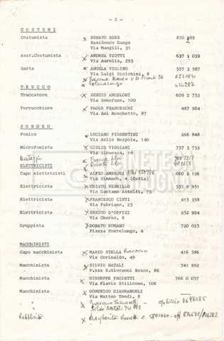Torna alla banca dati “Cast e unit lists” Documento storico Fondo Mara Blasetti / “Film Mara girati” / La linea del fiume Ambiti e contenuto Si segnalano elenchi del cast artistico e tecnico, nei quali vengono indicati i recapiti. I documenti si presentano fortemente appuntati. Informazioni archivistiche Cronologia: 1975 Numero di ordinamento definitivo: 1.20.1 Numero di ordinamento provvisorio: 4.1.B Descrizione fisica: fascicolo Immagini digitalizzate Informazioni sul film titolo originale: La linea del fiume regia: Scavarda, Aldo anno: 1976 paese di produzione: Italia lingua principale: italiana Documenti correlati Vai alla banca dati DOCUMENTO STORICO Gestione delle riprese, documentazione contabile e corrispondenza DOCUMENTO STORICO “La linea del fiume”