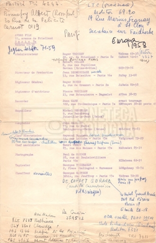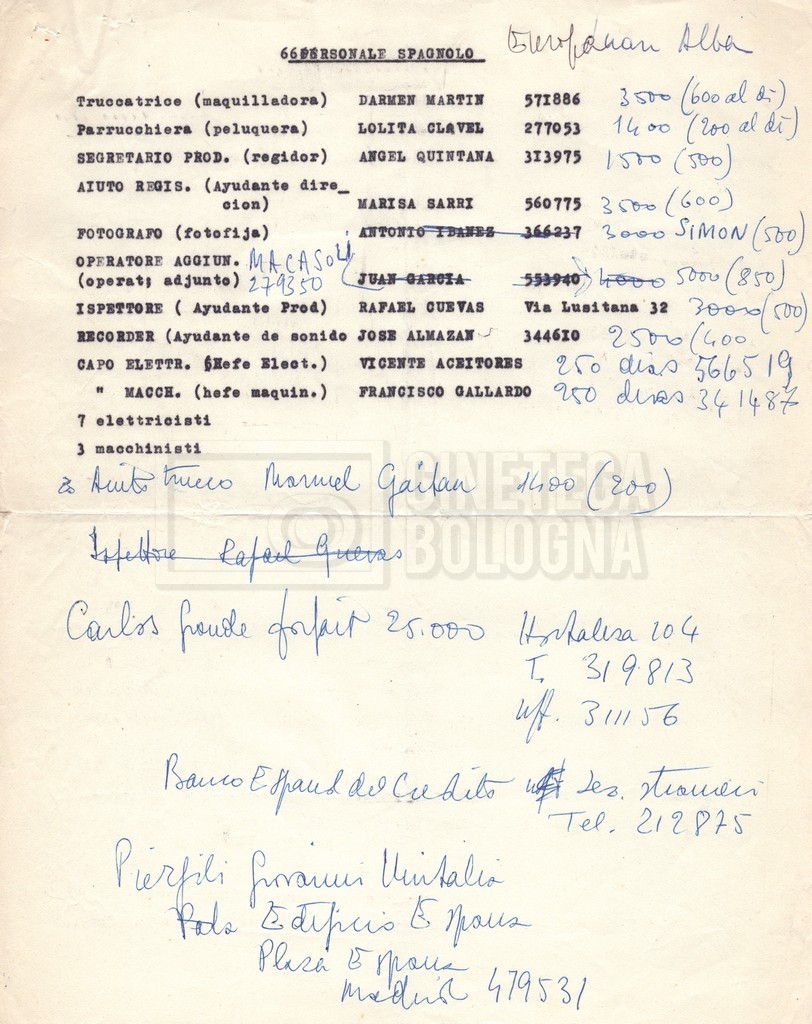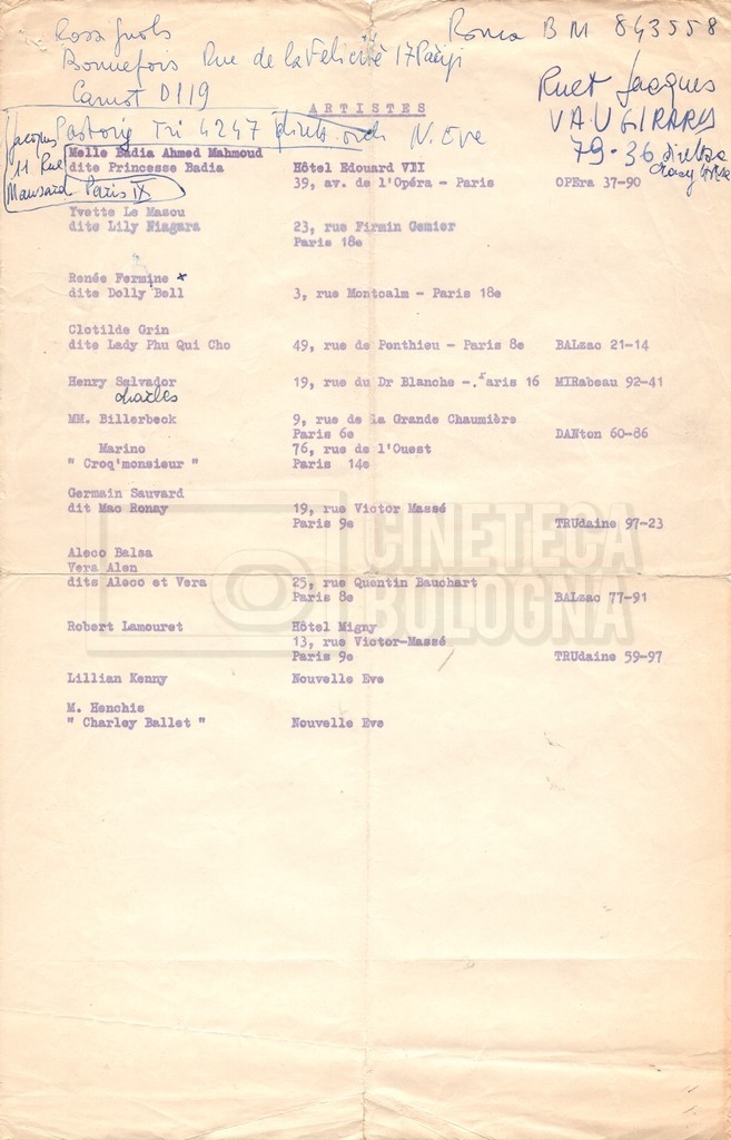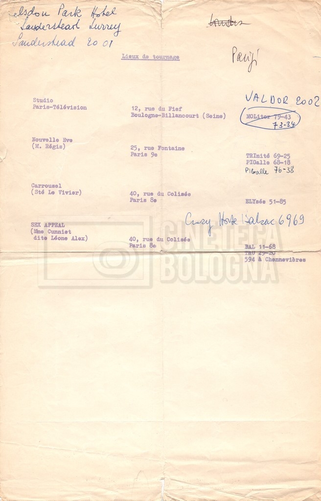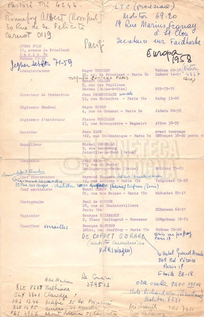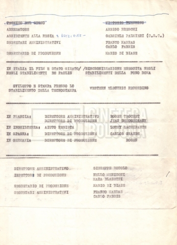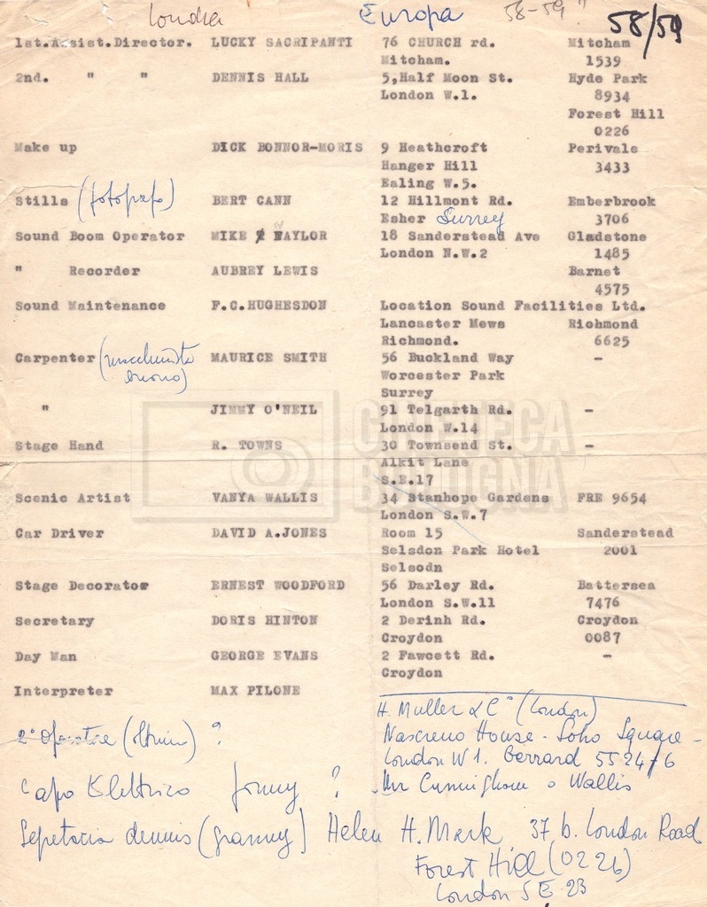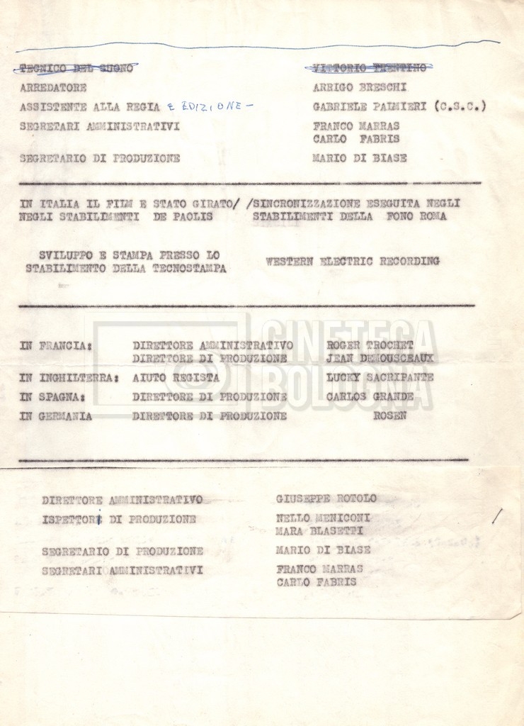 – Elenchi del cast artistico e tecnico nei diversi luoghi delle riprese, tra cui Roma, Milano, Parigi, Londra, Madrid, solitamente con l’indicazione dei recapiti;