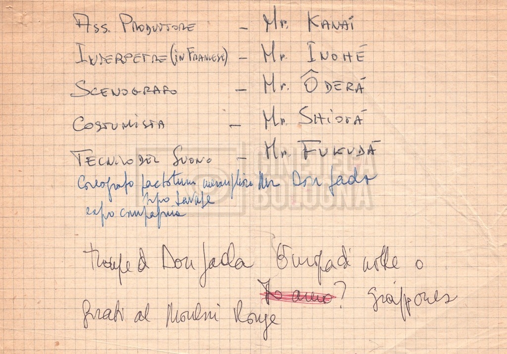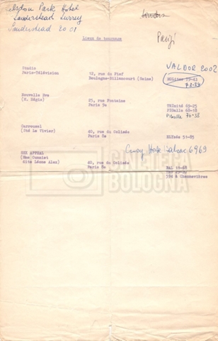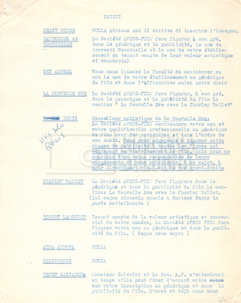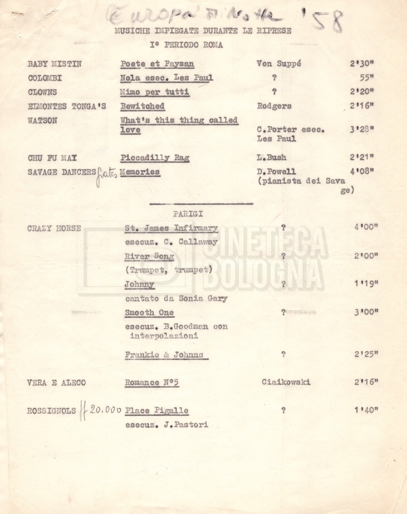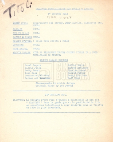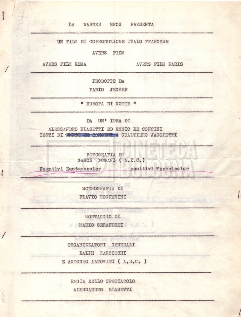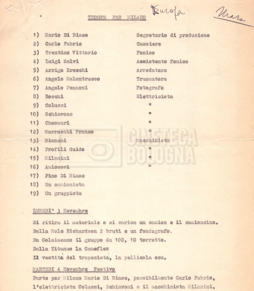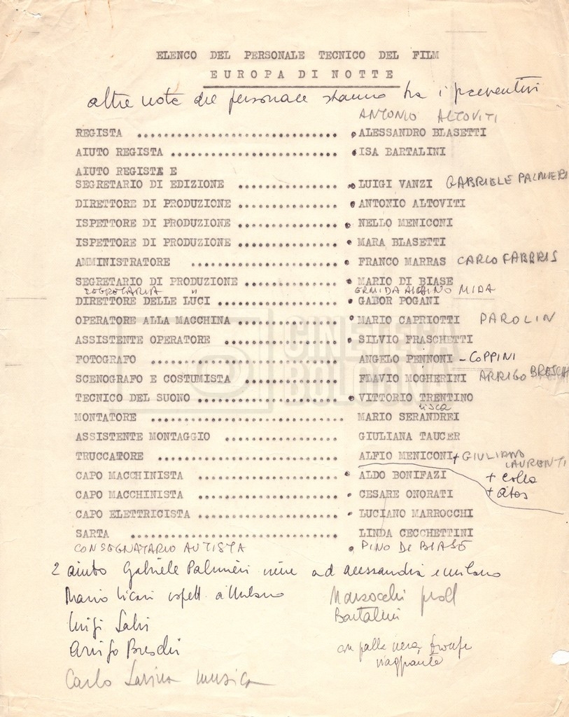 – Elenchi del cast artistico e tecnico nei diversi luoghi delle riprese, tra cui Roma, Milano, Parigi, Londra, Madrid, solitamente con l’indicazione dei recapiti;