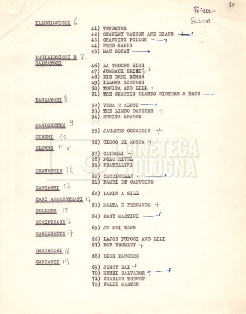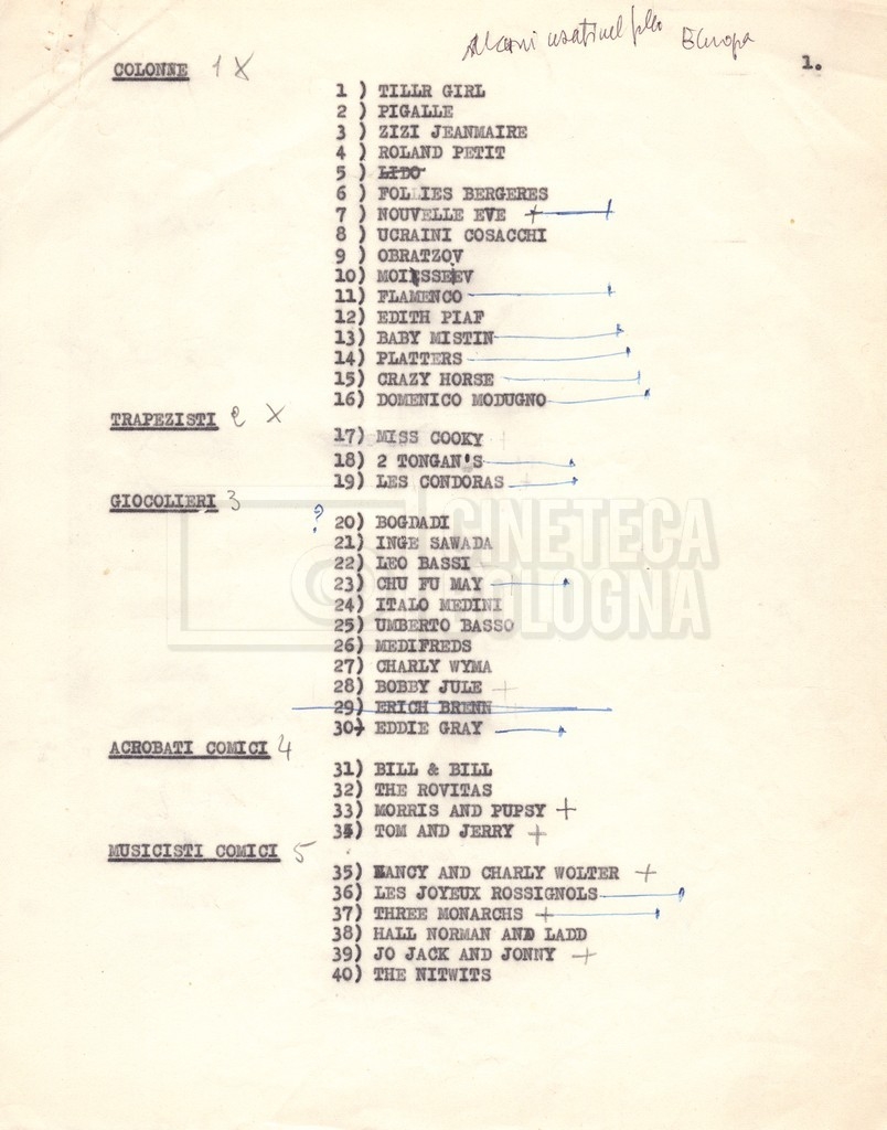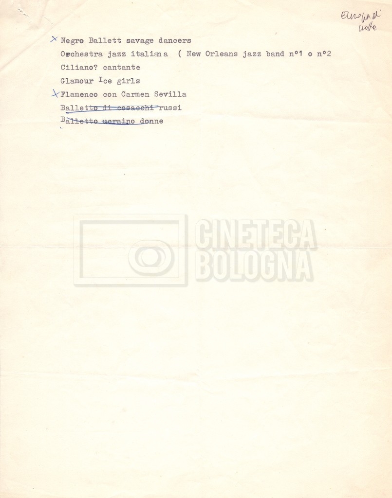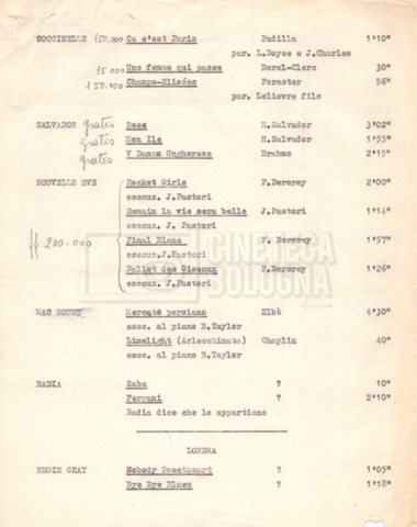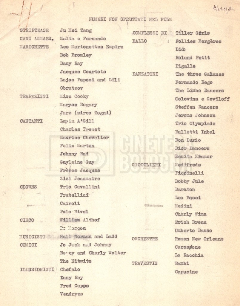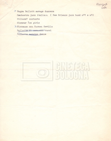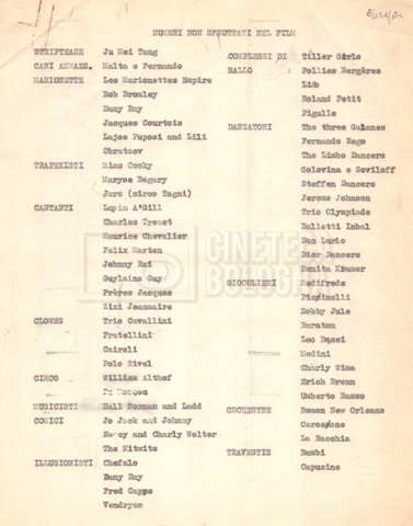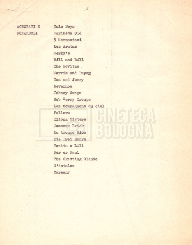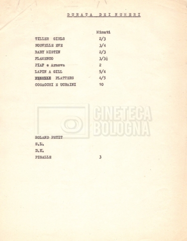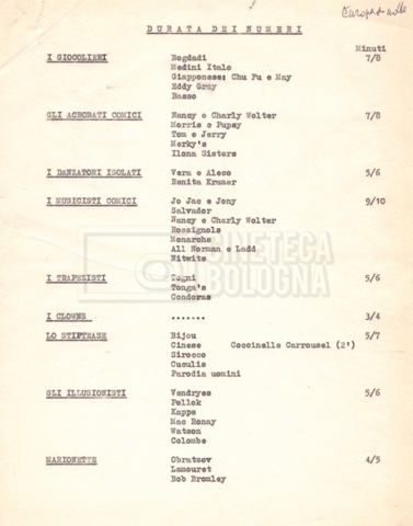 – Elenchi dei numeri di danza e circensi, talvolta con l’indicazione della durata del numero e dell’utilizzo o meno del materiale nella pellicola;