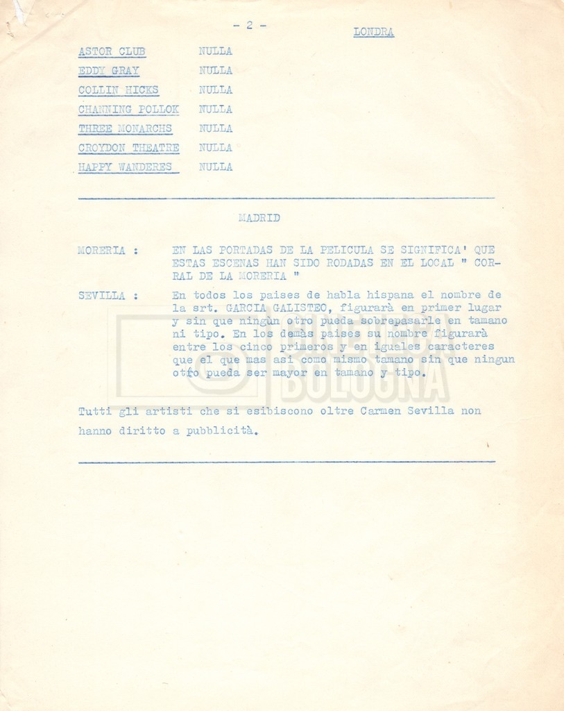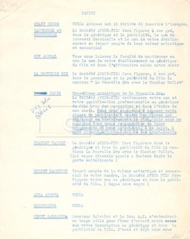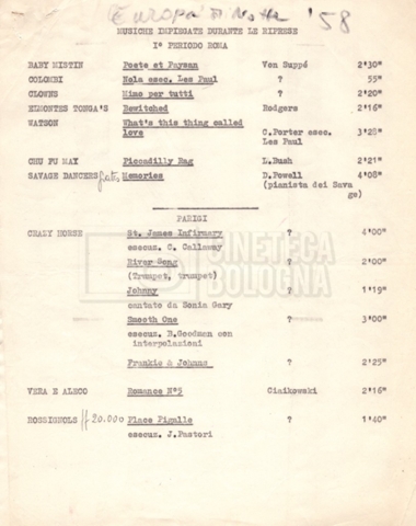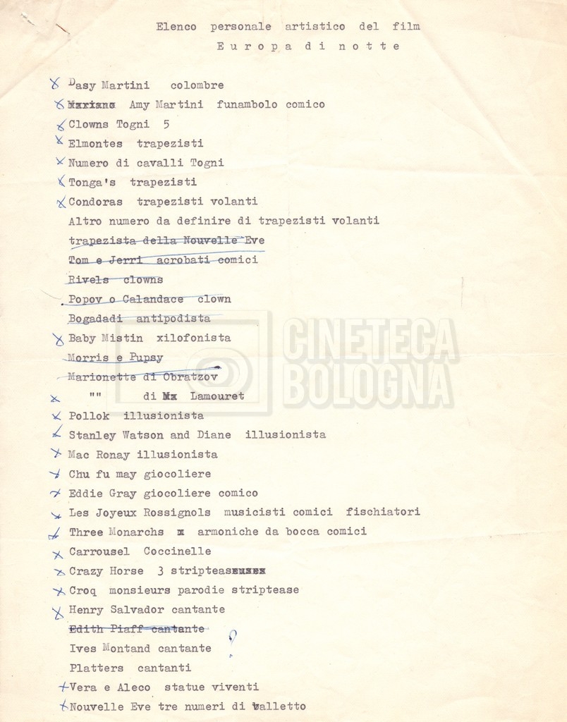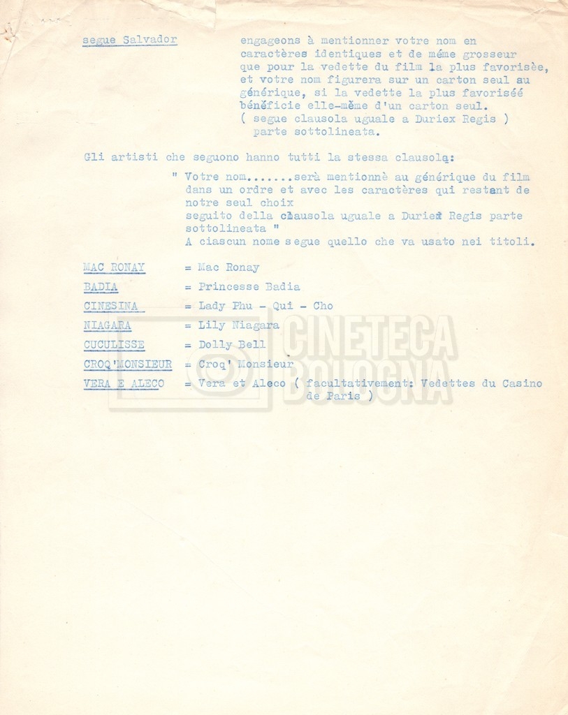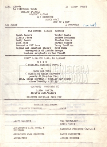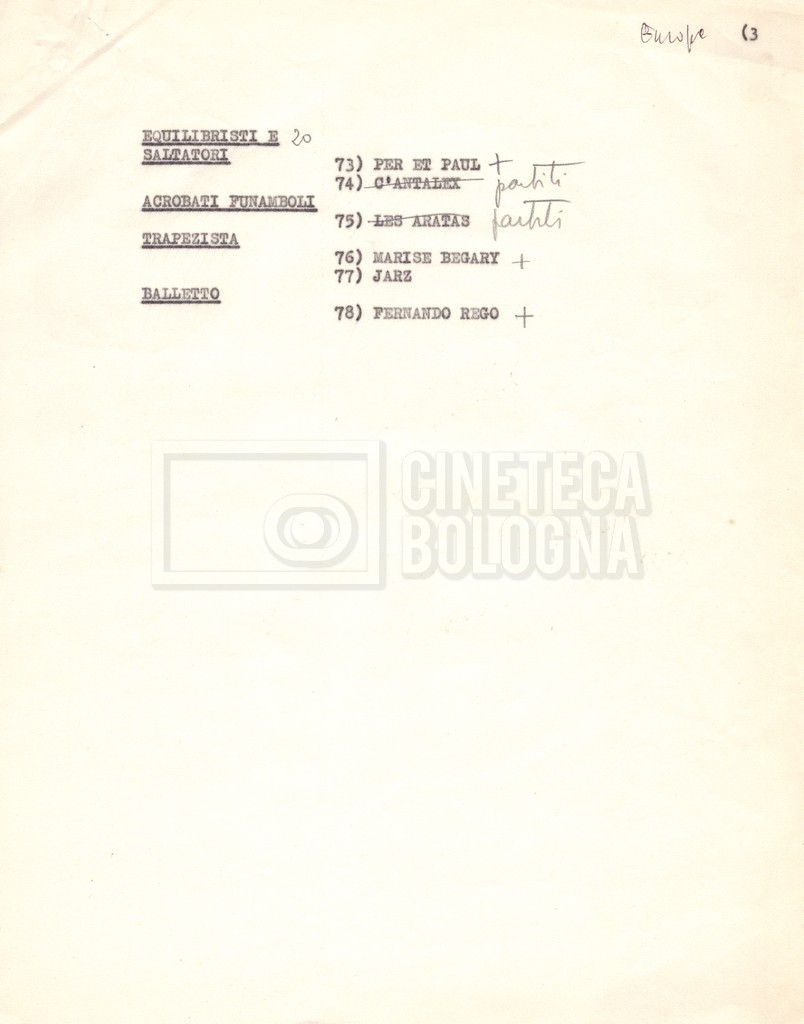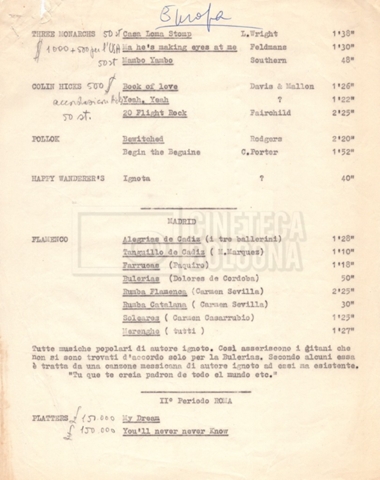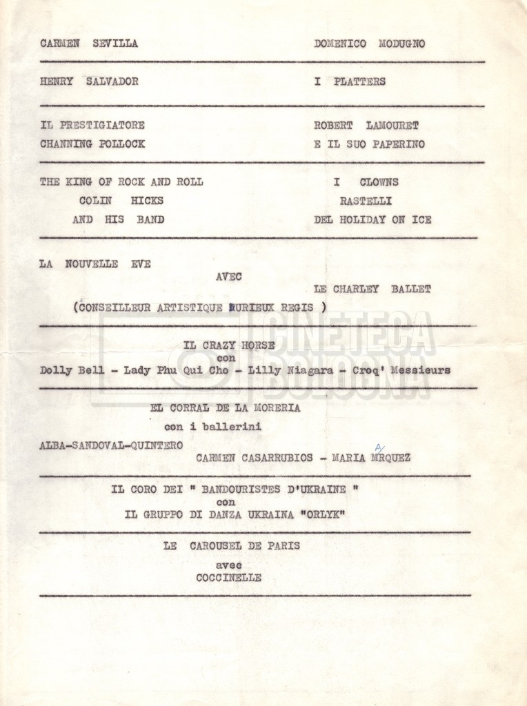 – Elenchi dei numeri di danza e circensi, talvolta con l’indicazione della durata del numero e dell’utilizzo o meno del materiale nella pellicola;