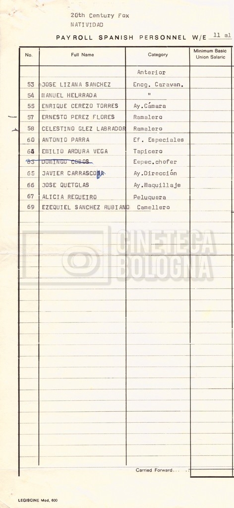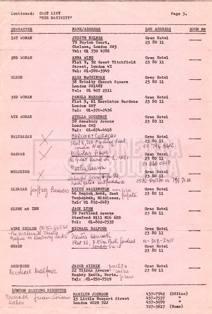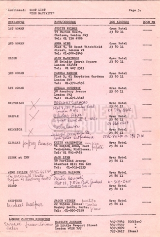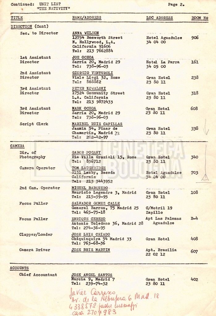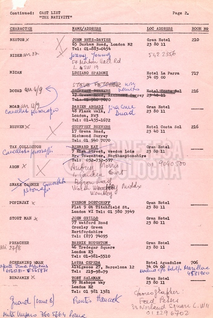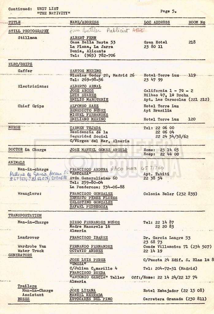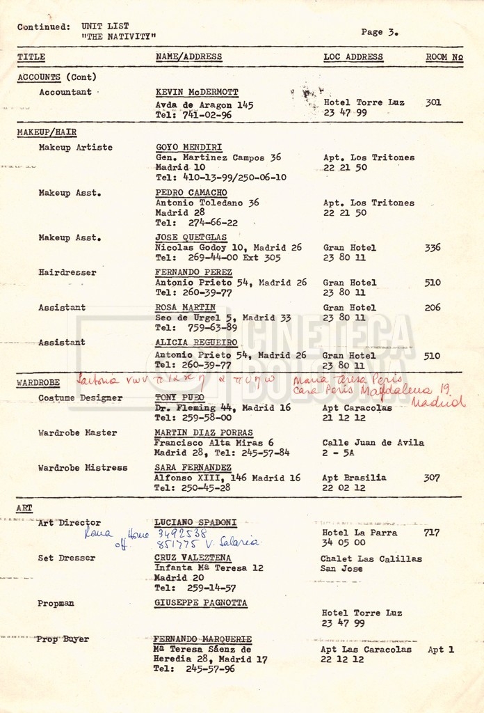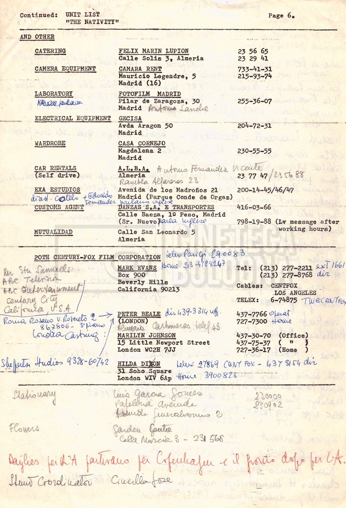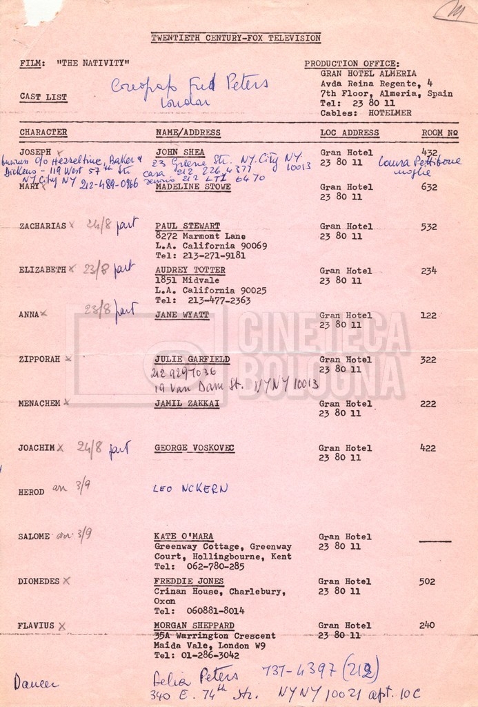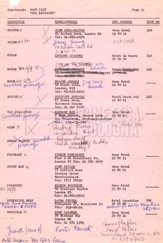 Torna alla banca dati “Cast e unit lists” Documento storico Fondo Mara Blasetti / “Film Mara girati” / The Nativity Ambiti e contenuto Si segnalano elenchi del cast artistico e tecnico, nei quali vengono indicati i recapiti. I documenti si presentano fortemente appuntati. Informazioni archivistiche Cronologia: 1978 Numero di ordinamento definitivo: 1.22.1 Numero di ordinamento provvisorio: 4.1.B Descrizione fisica: fascicolo Immagini digitalizzate Informazioni sul film titolo originale: The Nativity regia: Kowalski, Bernard Louis anno: 1978 paese di produzione: Stati Uniti lingua principale: inglese Documenti correlati Vai alla banca dati DOCUMENTO STORICO Gestione delle riprese, documentazione contabile e corrispondenza DOCUMENTO STORICO Noleggio di animali