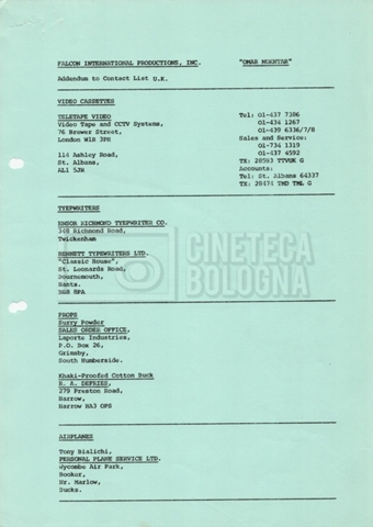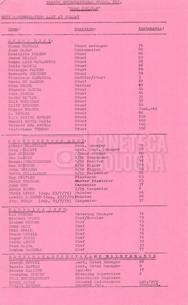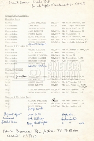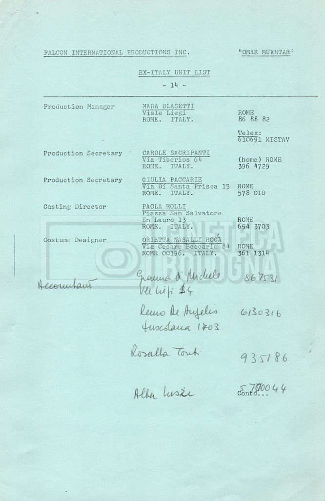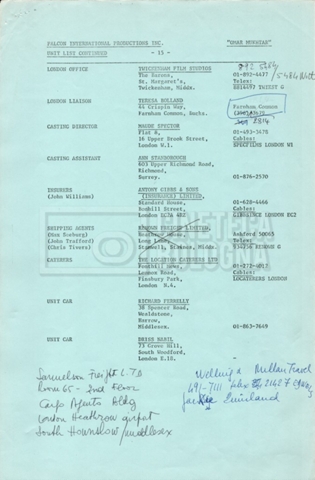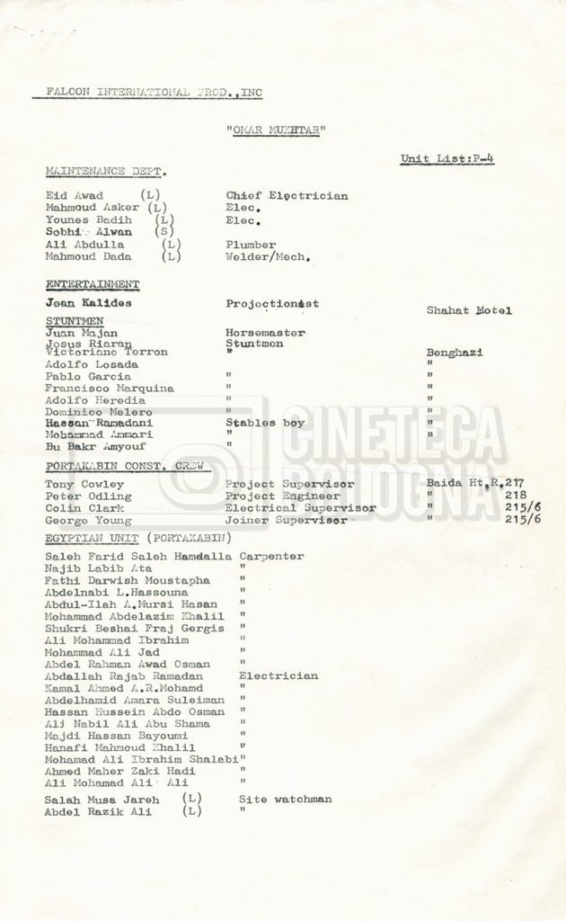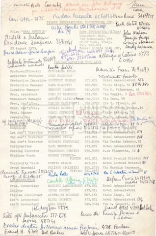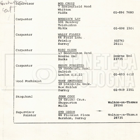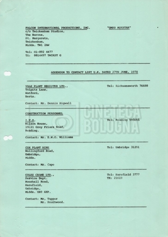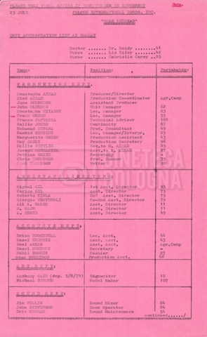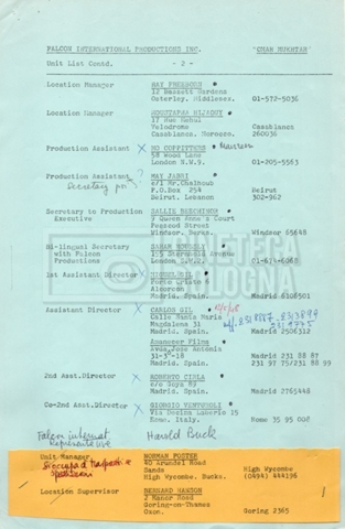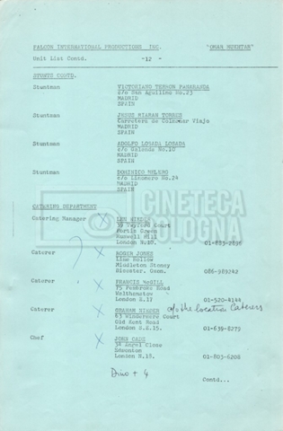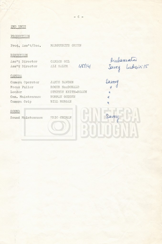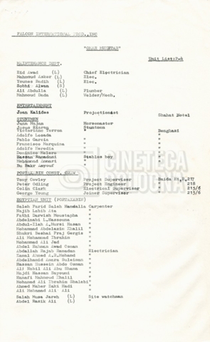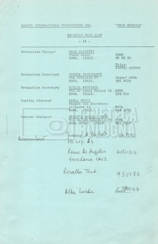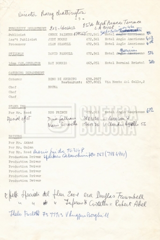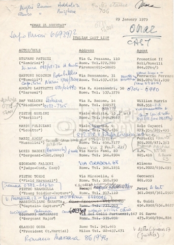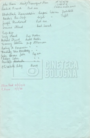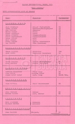 – Elenchi del cast tecnico e artistico, nei quali vengono indicati i recapiti. Vista la produzione internazionale del film, questi elenchi riportano indicazioni sul personale operante in diversi paesi, come Egitto, Inghilterra e Italia;