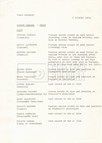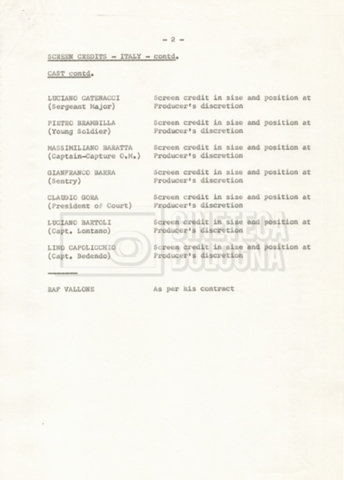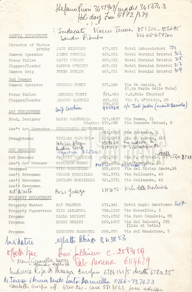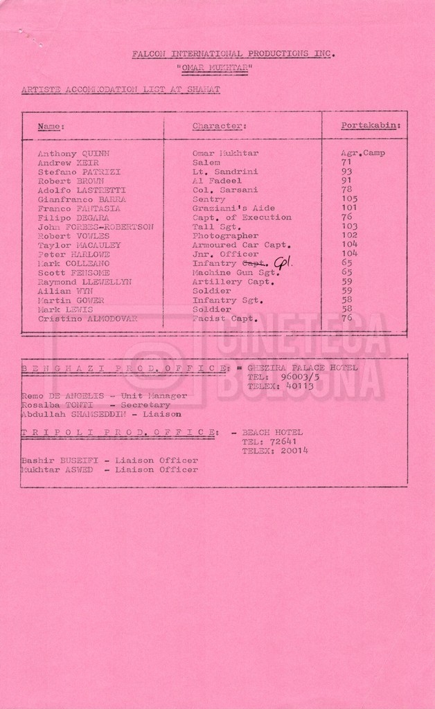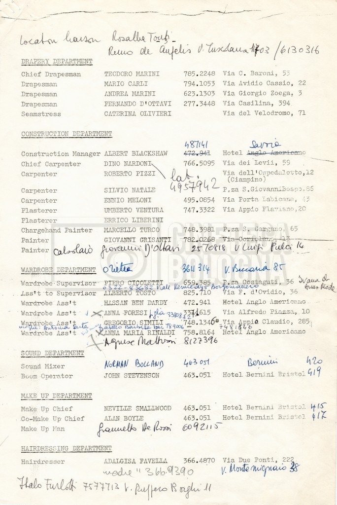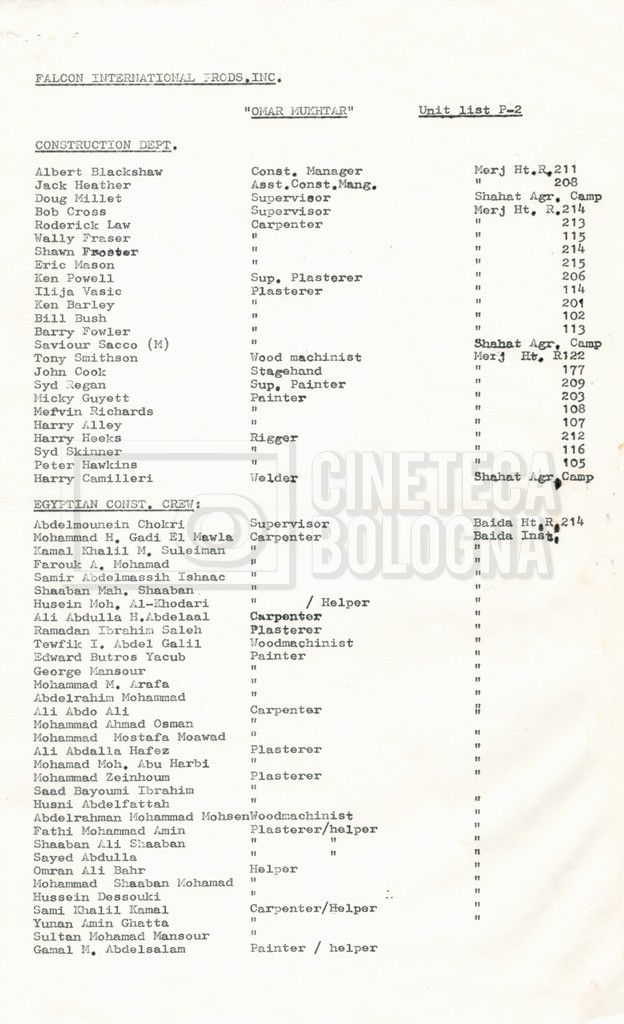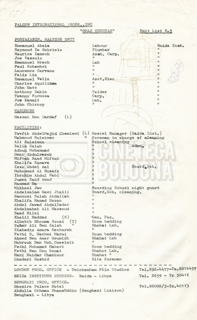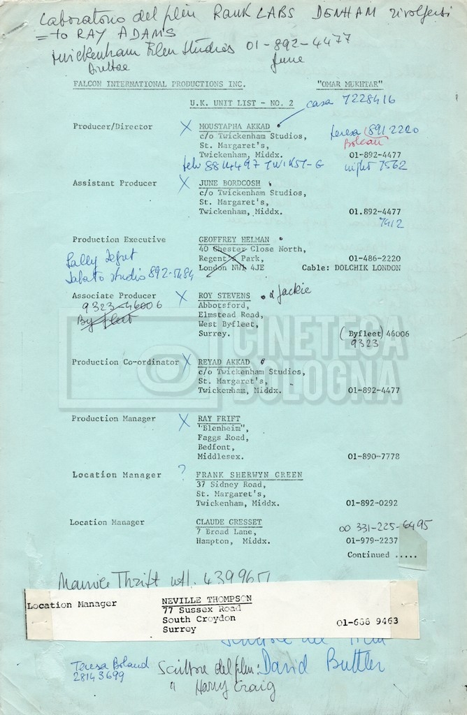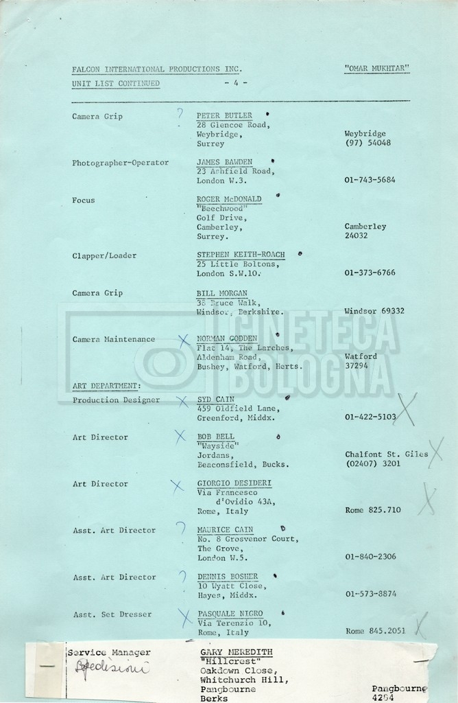– Elenchi del cast tecnico e artistico, nei quali vengono indicati i recapiti. Vista la produzione internazionale del film, questi elenchi riportano indicazioni sul personale operante in diversi paesi, come Egitto, Inghilterra e Italia;