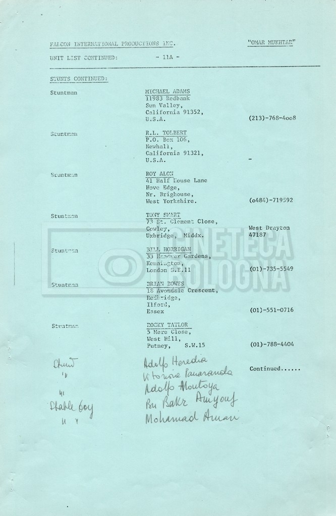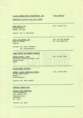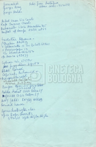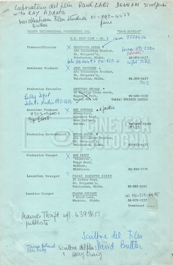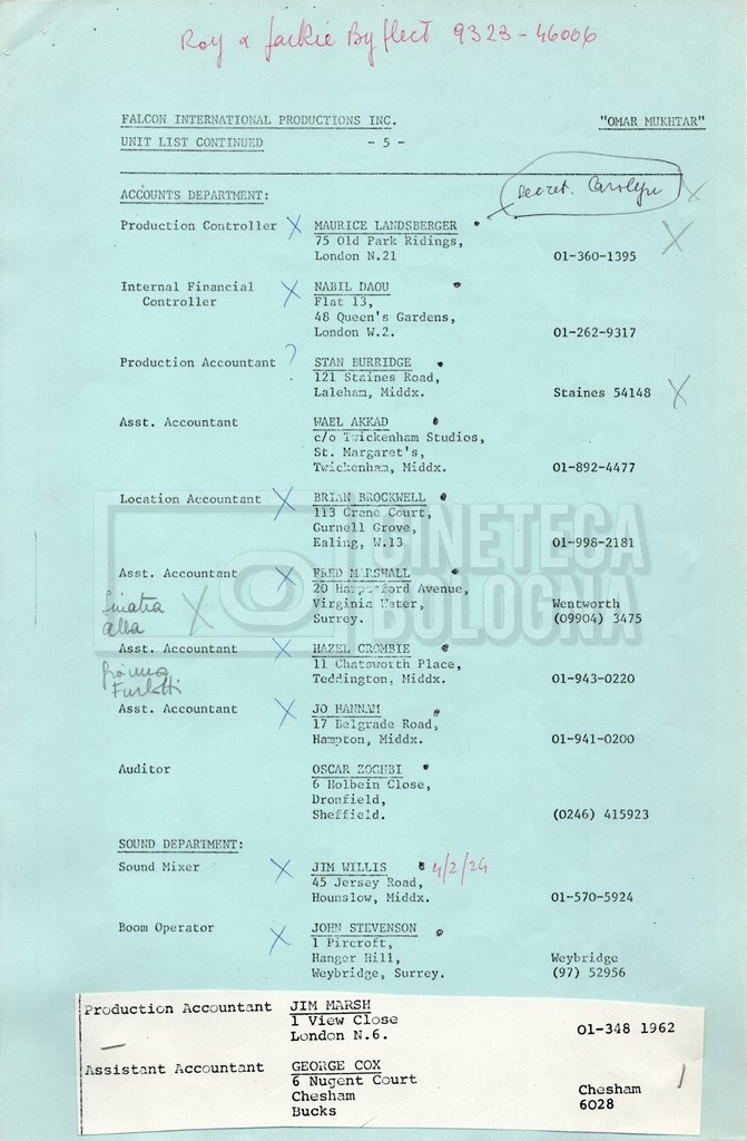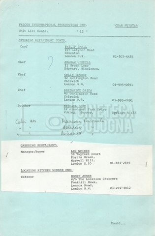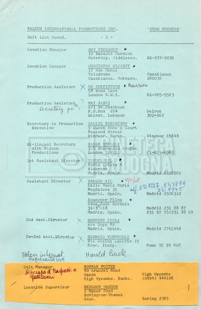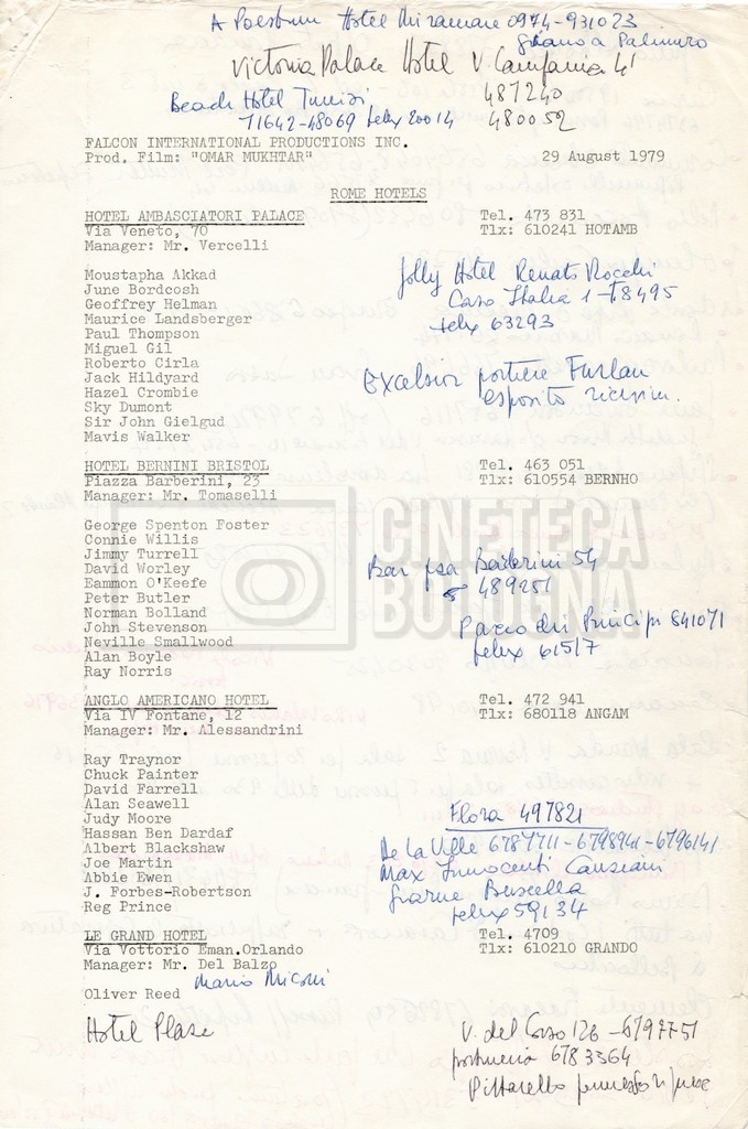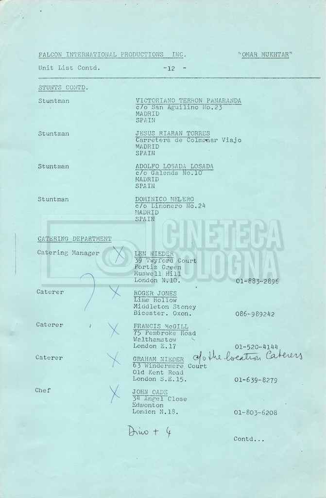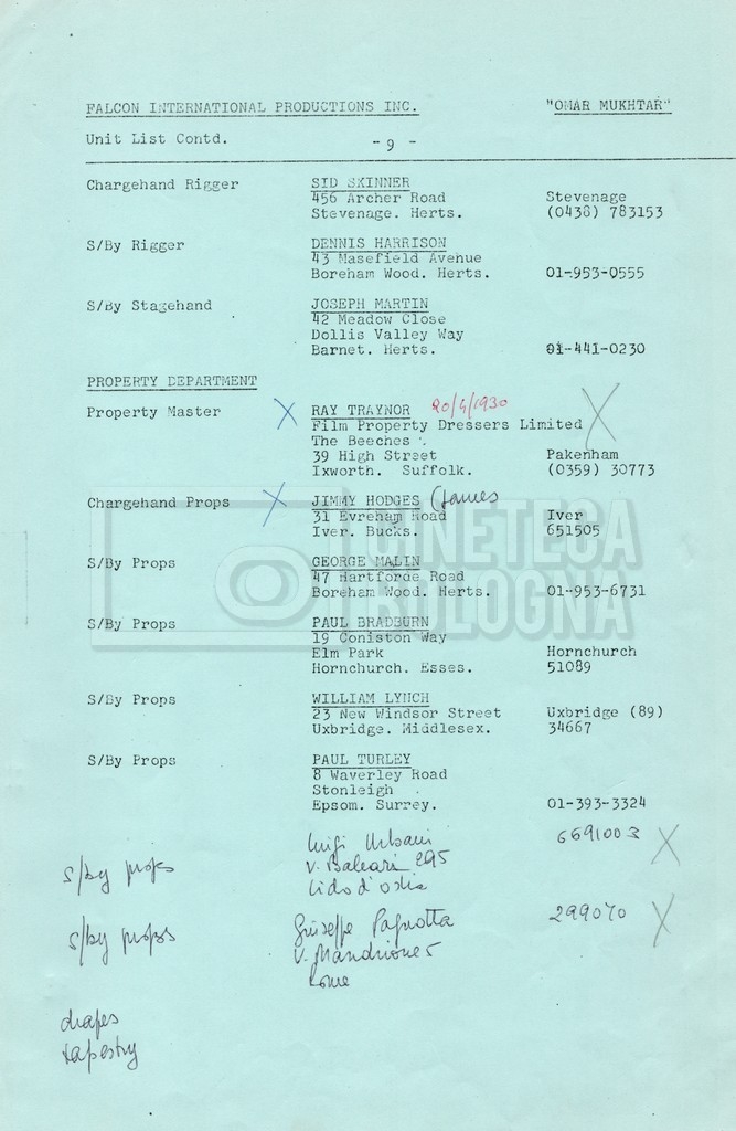 – Elenchi del cast tecnico e artistico, nei quali vengono indicati i recapiti. Vista la produzione internazionale del film, questi elenchi riportano indicazioni sul personale operante in diversi paesi, come Egitto, Inghilterra e Italia;
