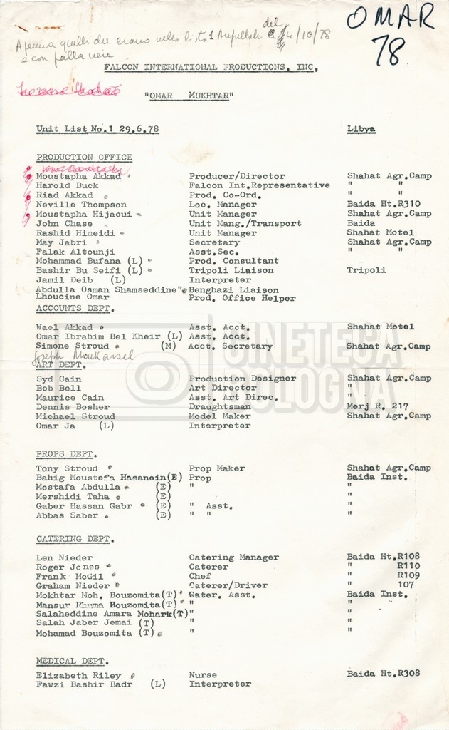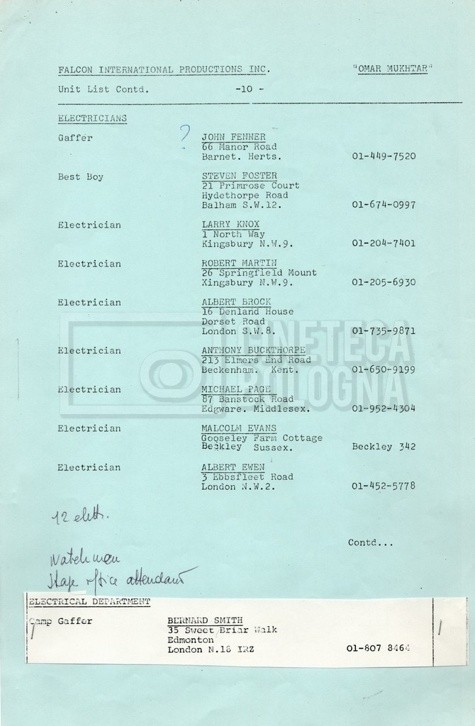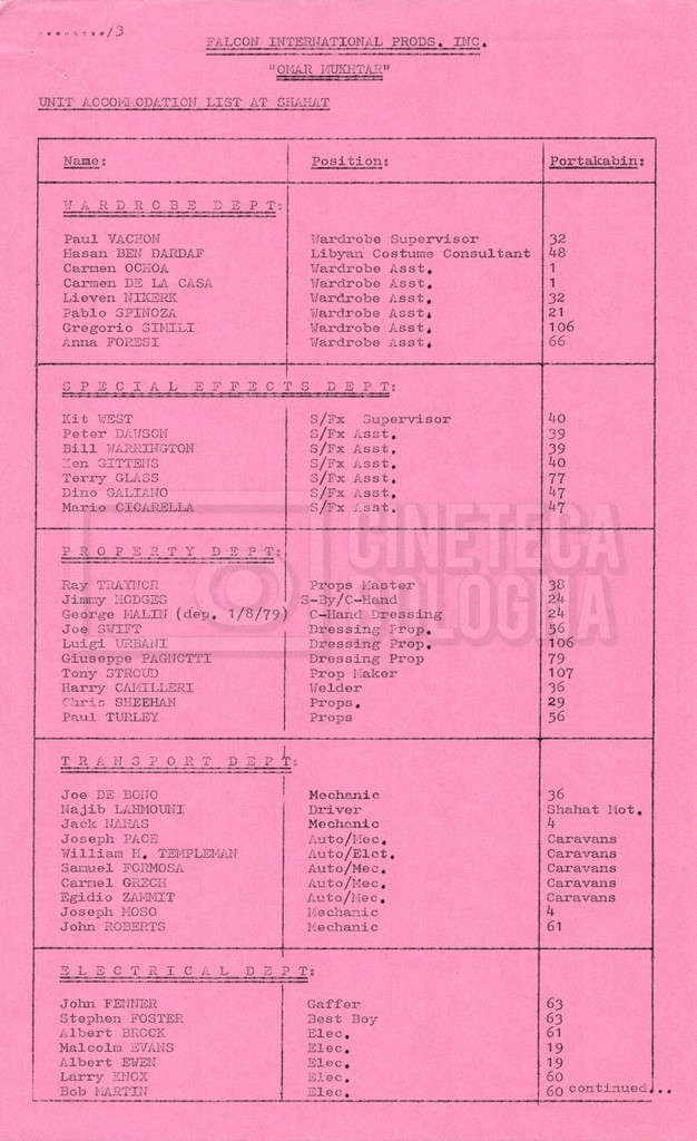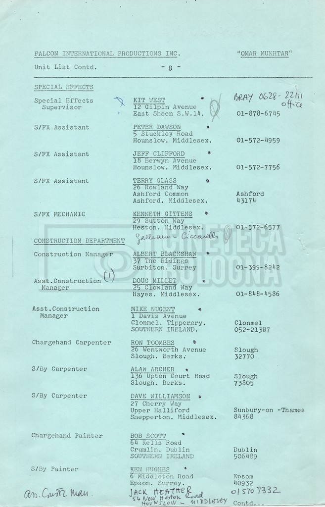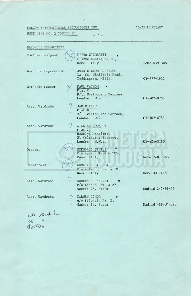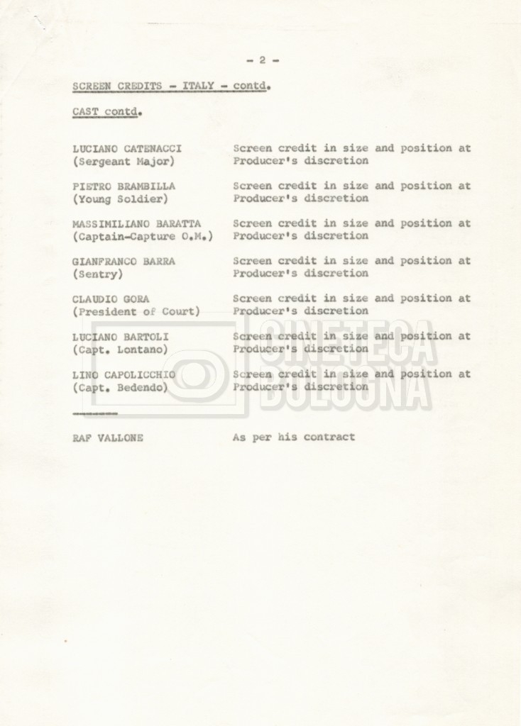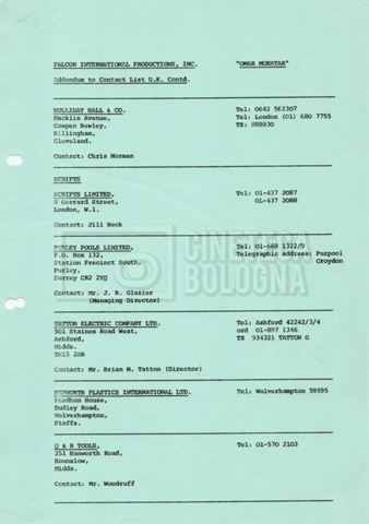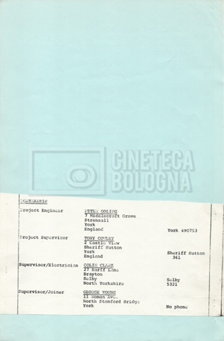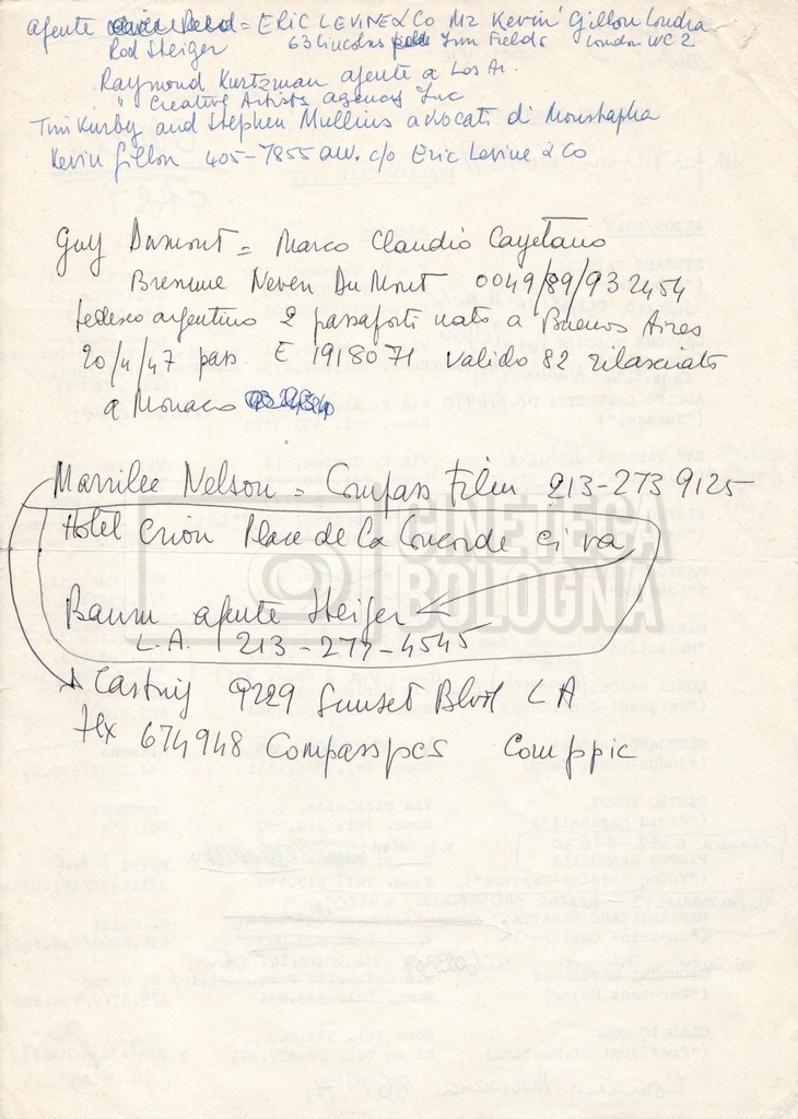 – Elenchi del cast tecnico e artistico, nei quali vengono indicati i recapiti. Vista la produzione internazionale del film, questi elenchi riportano indicazioni sul personale operante in diversi paesi, come Egitto, Inghilterra e Italia;