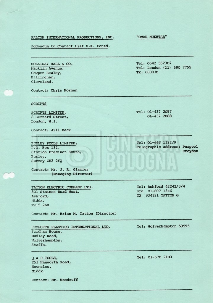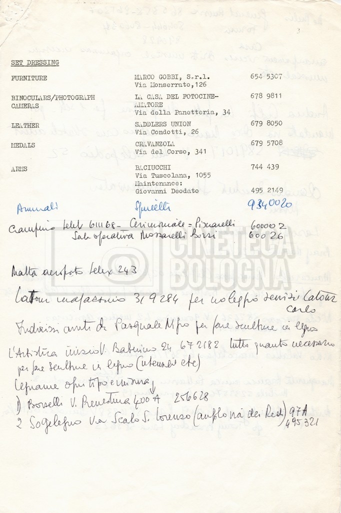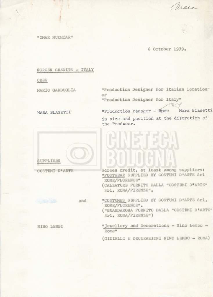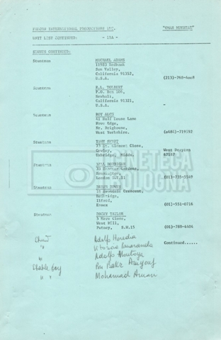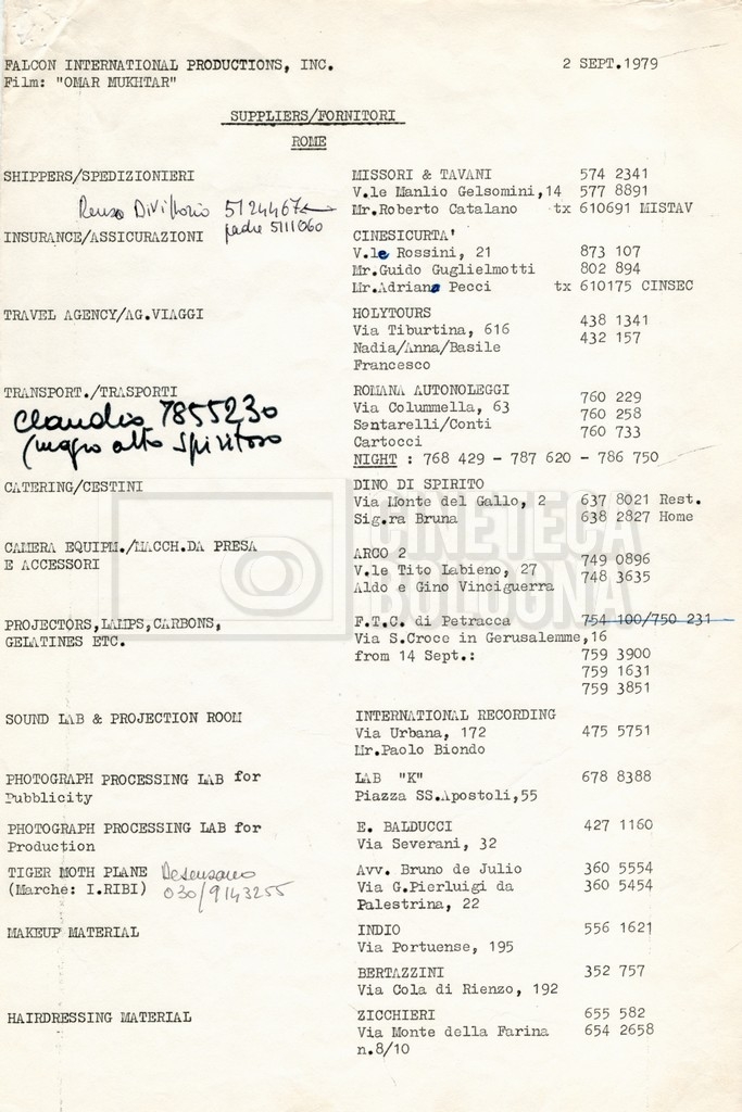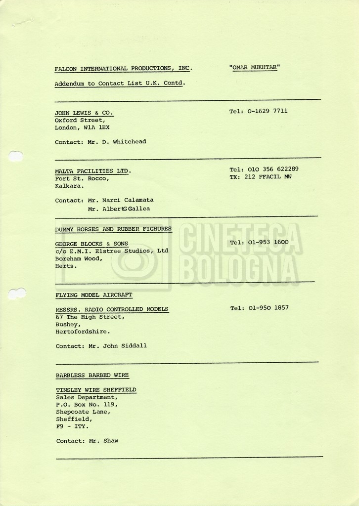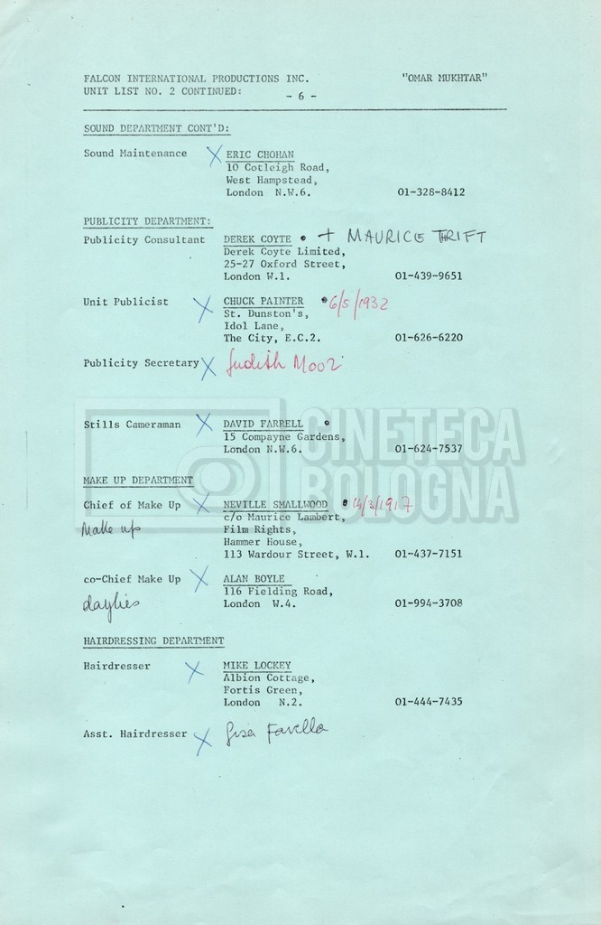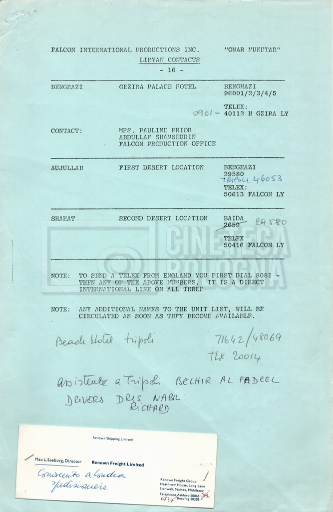– Elenchi del cast tecnico e artistico, nei quali vengono indicati i recapiti. Vista la produzione internazionale del film, questi elenchi riportano indicazioni sul personale operante in diversi paesi, come Egitto, Inghilterra e Italia;