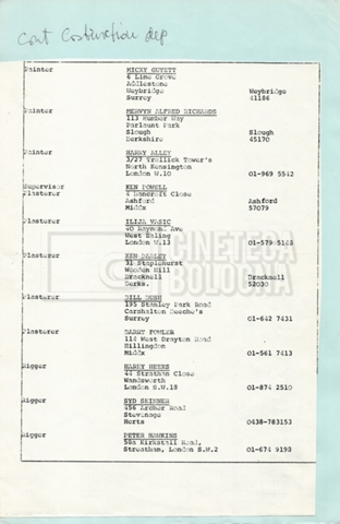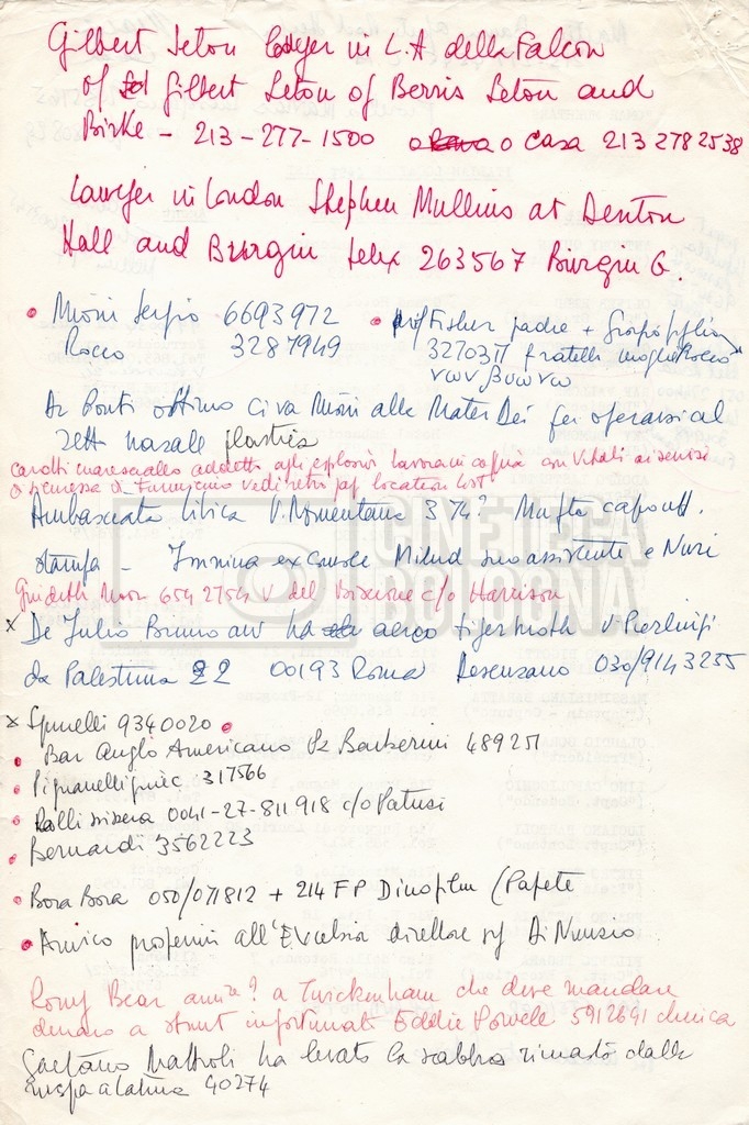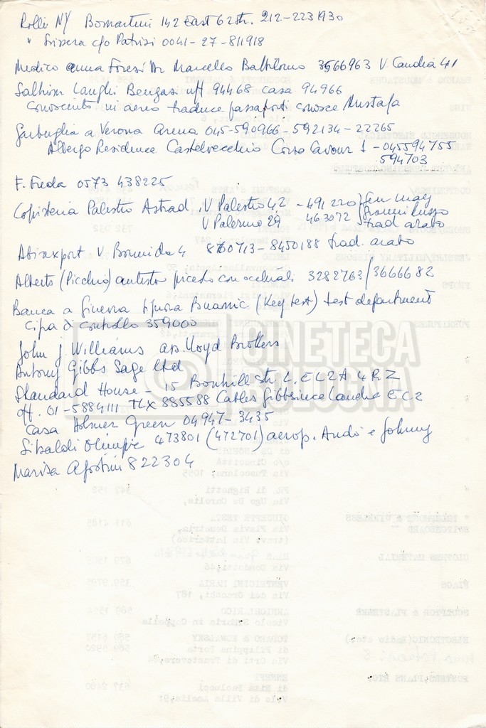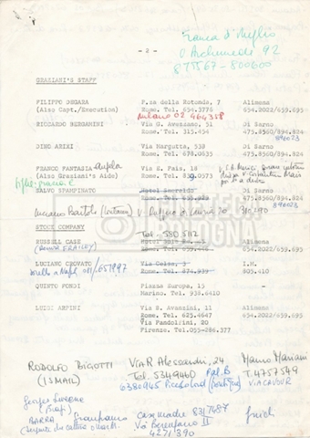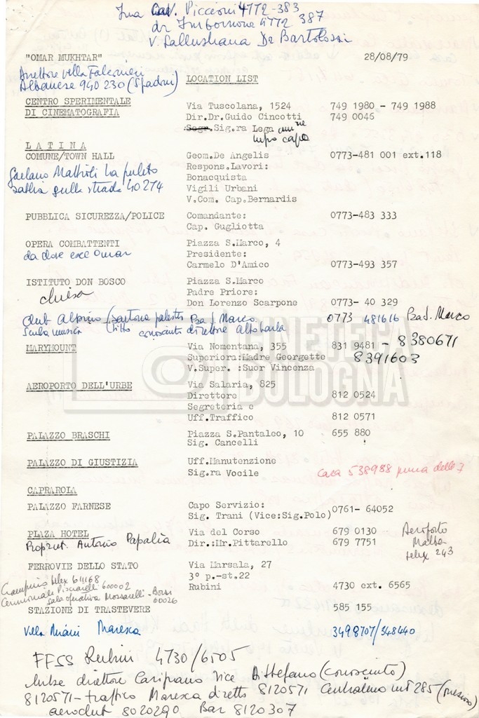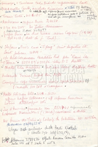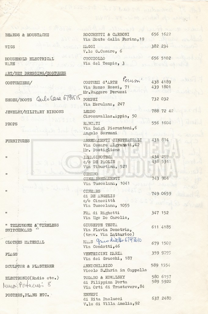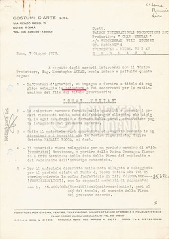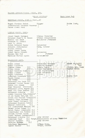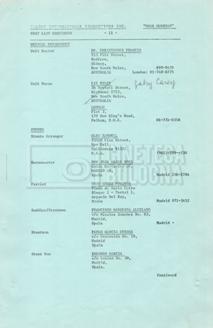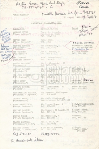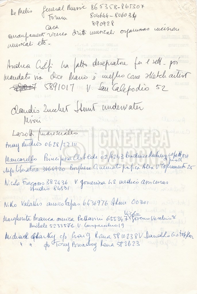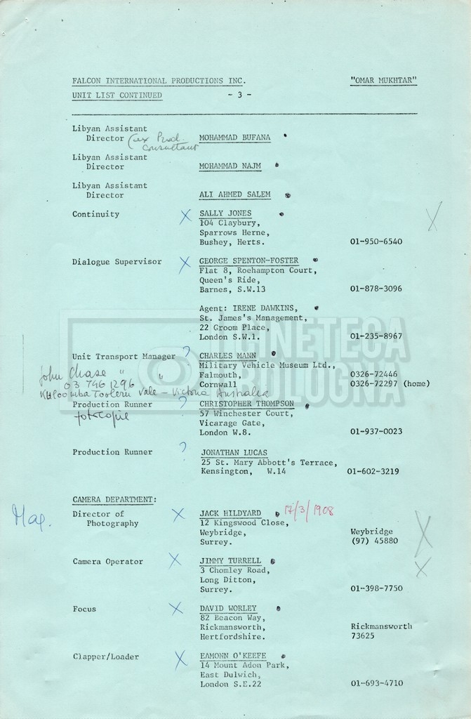 – Elenchi del cast tecnico e artistico, nei quali vengono indicati i recapiti. Vista la produzione internazionale del film, questi elenchi riportano indicazioni sul personale operante in diversi paesi, come Egitto, Inghilterra e Italia;