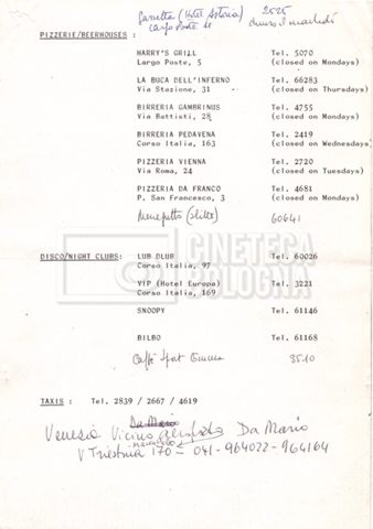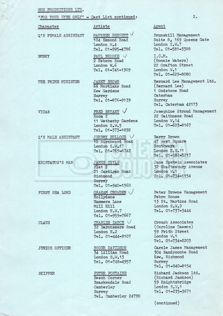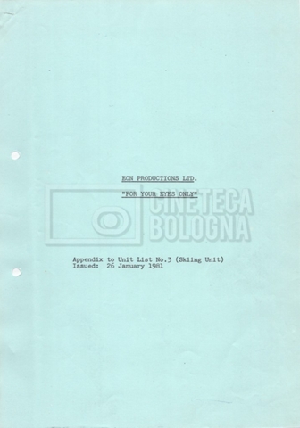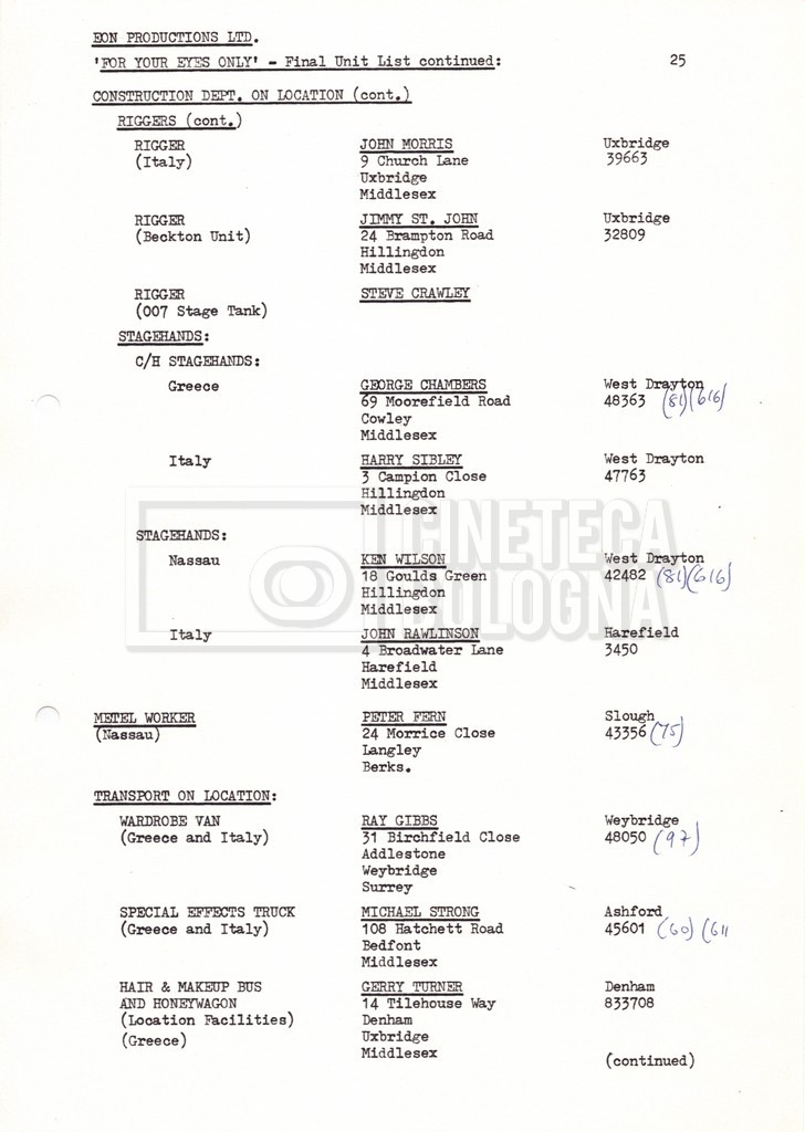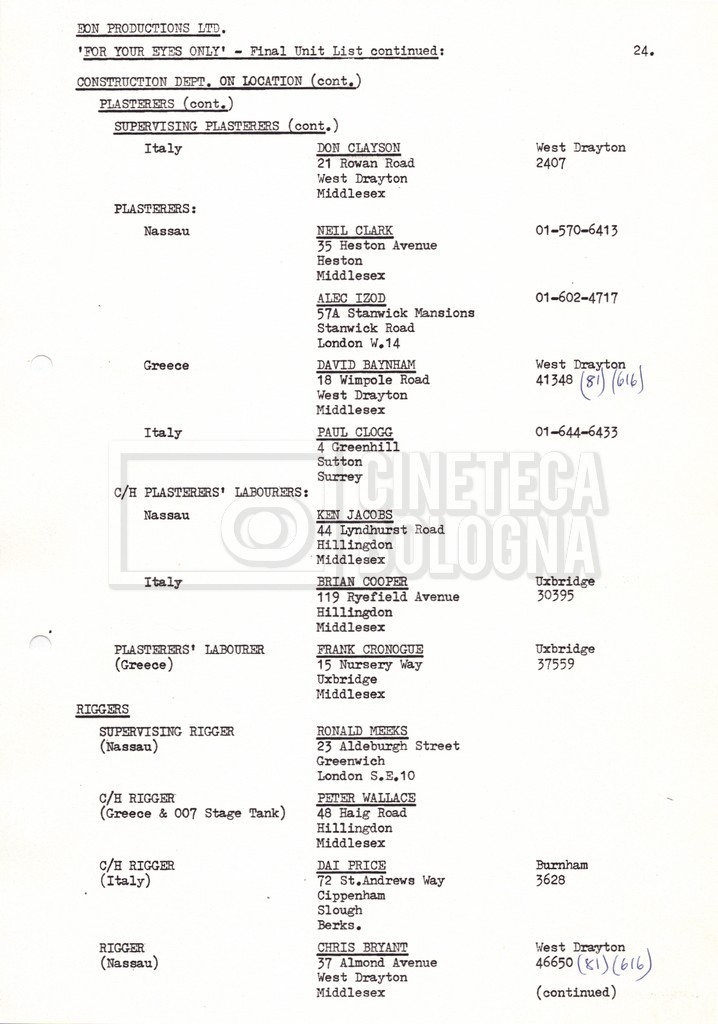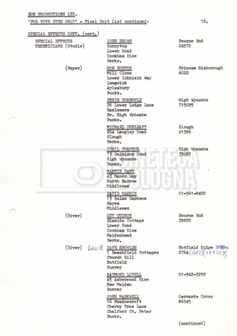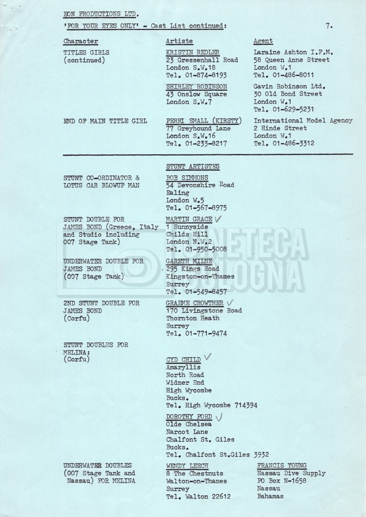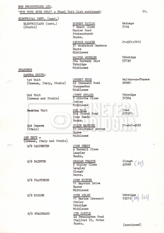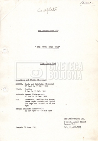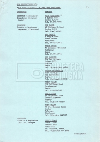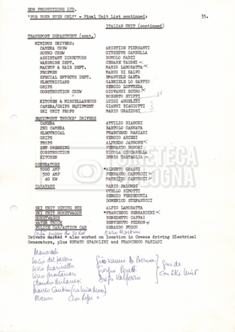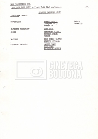 - Elenchi del cast tecnico e artistico, nei quali vengono indicati i recapiti. Nell'elenco del cast tecnico, denominato "Final unit list", questo viene diviso in base ai luoghi delle riprese e si hanno quindi una troupe inglese, greca, italiana.