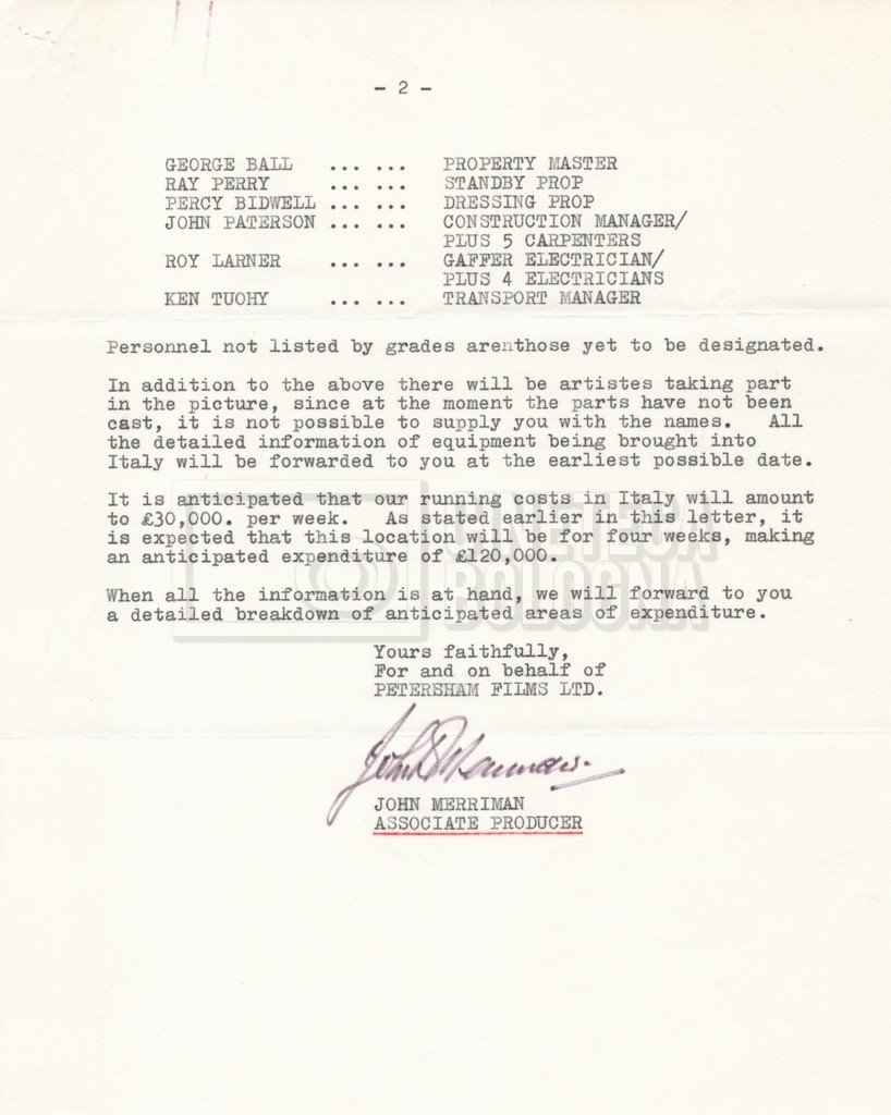 – Una lettera di John Merriman, della “Petersham Films ltd.”, con la quale informa dell’intenzione di girare parte del film in Italia;
