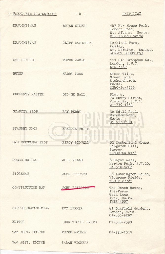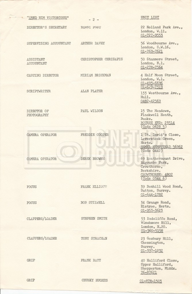 – Un elenco del cast tecnico, nel quale vengono indicati i recapiti (gennaio 1969).